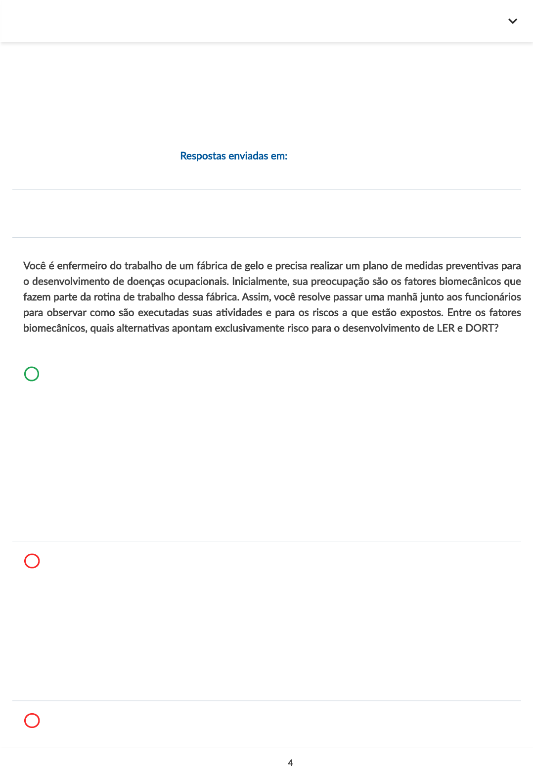 30/09/23, 08:27 Doenças ocupacionais: LER e DORT :: Plataforma A https://fanorte.grupoa.education/sagah/object/default/58314191 1/2 Exercícios Respostas enviadas em: 15/09/2023 22:49 Prazo para envio: 20/09/23 23:59 Liberação do feedback: 21/09/23 00:01 4. Você é enfermeiro do trabalho de um fábrica de gelo e precisa realizar um plano de medidas preven�vas para o desenvolvimento de doenças ocupacionais. Inicialmente, sua preocupação são os fatores biomecânicos que fazem parte da ro�na de trabalho dessa fábrica. Assim, você resolve passar uma manhã junto aos funcionários para observar como são executadas suas a�vidades e para os riscos a que estão expostos. Entre os fatores biomecânicos, quais alterna�vas apontam exclusivamente risco para o desenvolvimento de LER e DORT? A. Movimentos repe��vos, posturas inadequadas, ritmo de trabalho, vibração e ruído excessivo. Os fatores biomecânicos têm relação com movimentos repe��vos, com a velocidade com que as a�vidades são realizadas, com a força u�lizada e com o tempo dispensado para a ação. Acrescente a isso, a adoção de posturas inadequadas, o trabalho com cargas elevadas, o trabalho muscular está�co, o desconforto térmico, o ruído excessivo, a iluminação inadequada, o mobiliário inadequado, as pressões mecânicas, os choques e os impactos, entre outros. B. Movimentos repe��vos, frio, poeira, posturas inadequadas e vibração. Os fatores biomecânicos têm relação com movimentos repe��vos, com a velocidade com que as a�vidades são realizadas, com a força u�lizada e com o tempo dispensado para a ação. Acrescente a isso a adoção de posturas inadequadas, o trabalho com cargas elevadas, o trabalho muscular está�co, o desconforto térmico, o ruído excessivo, a iluminação inadequada, o mobiliário inadequado, as pressões mecânicas, os choques e os impactos, entre outros. C. Movimentos repe��vos, frio, neblina, ruído excessivo e ritmo de trabalho. 4 de 5 perguntas Anterior Próximo LF 30/09/23, 08:27 Doenças ocupacionais: LER e DORT :: Plataforma A https://fanorte.grupoa.education/sagah/object/default/58314191 2/2 Os fatores biomecânicos têm relação com movimentos repe��vos, com a velocidade com que as a�vidades são realizadas, com a força u�lizada e com o tempo dispensado para a ação. Acrescente a isso a adoção de posturas inadequadas, o trabalho com cargas elevadas, o trabalho muscular está�co, o desconforto térmico, o ruído excessivo, a iluminação inadequada, o mobiliário inadequado, as pressões mecânicas, os choques e os impactos, entre outros. D. Ritmo de trabalho, substâncias químicas, controle rígido de produção e arranjo �sico inadequado. Os fatores biomecânicos têm relação com movimentos repe��vos, com a velocidade com que as a�vidades são realizadas, com a força u�lizada e com o tempo dispensado para a ação. Acrescente a isso a adoção de posturas inadequadas, o trabalho com cargas elevadas, o trabalho muscular está�co, o desconforto térmico, o ruído excessivo, a iluminação inadequada, o mobiliário inadequado, as pressões mecânicas, os choques e os impactos, entre outros. E. Iluminação imprópria, poeiras, ruídos excessivos e ferramentas inadequadas. Os fatores biomecânicos têm relação com movimentos repe��vos, com a velocidade com que as a�vidades são realizadas, com a força u�lizada e com o tempo dispensado para a ação. Acrescente a isso a adoção de posturas inadequadas, o trabalho com cargas elevadas, o trabalho muscular está�co, o desconforto térmico, o ruído excessivo, a iluminação inadequada, o mobiliário inadequado, as pressões mecânicas, os choques e os impactos, entre outros. Voltar Próximo 4 de 5 perguntas Anterior Próximo LF