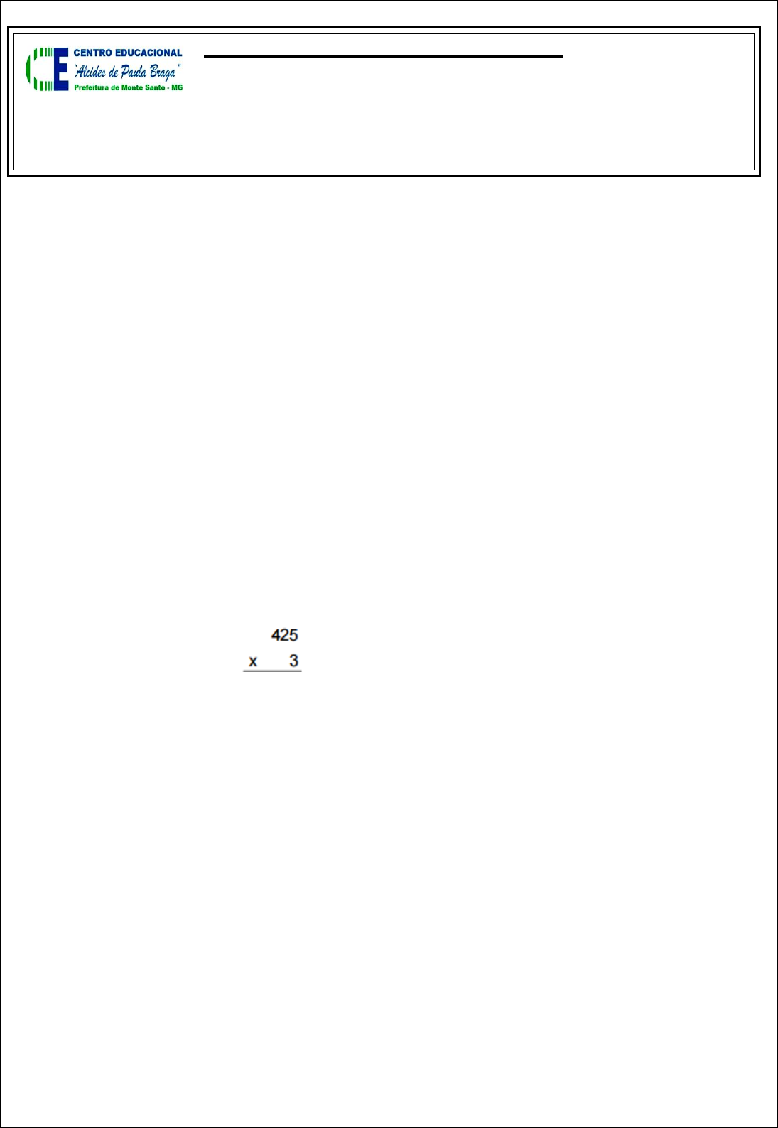 Avaliação Diagnóstica de Matemática Aluno(a): __________________________________________________________ Professora: ________________ Data: ____/____/______ 5° ANO _____ 1) Ana Luísa iniciou a leitura de um livro às 7 horas da manhã. Após ler alguns capítulos, parou para descansar por 30 minutos. Depois reiniciou a leitura e a terminou às 10 horas da manhã. Quanto tempo ela levou lendo o livro? A) 2 horas B) 2 horas e meia C) 3 horas D) 3 horas e meia 2) Qual é o maior número que você pode escrever usando algarismos 8, 9, 1, 5 e 7 sem repeti- los? A) 91.875 B) 98.715 C) 98.751 D) 97.851 3) Eduardo fez esta multiplicação, mas apagou o resultado. Faça você também a conta. Qual deve ser o resultado? A) 1.265 B) 1.275 C) 1.295 D) 1.375 4) Faltam 28 dias para o aniversário de João. Quantas semanas completas faltam para o aniversário dele? A) 3 B) 4 C) 5 D) 6 5) Adriana vai fazer esta subtração: 6790 – 38. O resultado dessa operação será: A) 6.768 B) 6.752 C) 6.758 D) 3.190 6) A tabela mostra o total de visitantes na cidade de Londrina durante as estações do ano. Qual foi a estação do ano com o maior número de visitantes? Estações do ano Total de visitantes (aproximadamente) Verão 1.148 Outono 1.026 Inverno 1.234 Primavera 1.209 A) Inverno B) Outono C) Primavera D) Verão 7) Observe o gráfico que mostra a idade de algumas crianças: Quantas crianças têm menos do que 8 anos? A) 6 B) 4 C) 3 D) 2 8) O desenho a seguir apresenta o mapeamento das carteiras dos alunos em uma sala de aula. Observe o desenho e assinale a alternativa correta. Filas: A) Paulo está sentado na terceira carteira da 2ª fila. B) Lucia está sentada três carteiras antes de Michele. C) Cleuza está na 3ª fila sentada duas carteiras antes de Davi. D) Davi está na 4ª fila e Adriano está sentado ao seu lado na 5ª fila. 9) Paulo está colocando lajotas no piso da garagem de sua casa. A figura mostra o piso da garagem e, em tom mais escuro, a área que já foi revestida. Quantas lajotas ainda deverão ser colocadas para cobrir todo o piso da garagem A) 12 B) 13 C) 25 D) 34 10) Em um circo há 2314 lugares. Quantas centenas possui esse número? A) 3 B) 23 C) 300 D) 2 314 11) Murilo pretende localizar na reta numérica o número 220. Ele pensou e chegou à conclusão correta de que esse número está entre: A) 50 e 100 B) 150 e 200 C) 200 e 250 D) 250 e 300 12) Uma merendeira preparou 668 pães que foram distribuídos igualmente em 4 cestas. Quantos pães foram colocados em cada cesta? A) 168 B) 142 C) 167 D) 142 13) Numa adição, as parcelas são 45.099; 742; 6.918 e 88. Qual é o valor da soma? A) 44.357 B) 47.439 C) 52.847 D) 114.279 14) A população de Corumbá, no Mato Grosso do Sul, é de 95.704 habitantes. O número de pessoas que moram em Corumbá escrito por extenso é: A) Noventa e cinco mil setecentos e quatro habitantes B) Noventa e cinco mil e setenta e quatro habitantes C) Noventa e cinco mil, setecentos e quarenta habitantes D) Noventa e cinco mil e setenta e quarenta habitante