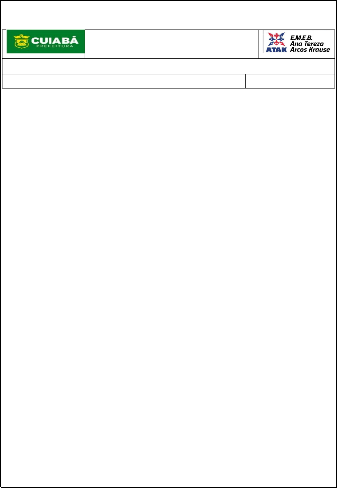 E. M. E. B. ANA TEREZA ARCOS KRAUSE CUIABÁ, ____DE ________________ DE ______ ALUNO (A): PROFESSORA: TURMA 4º ANO:_____ AVALIAÇÃO 1° BIMESTRE INTERDISCIPLINAR. 1. Escolha a alternativa que apresenta um aspecto que indica um indivíduo com boa saúde. (EF04CI07) (A) Cansaço constante. (B) Dores no corpo persistentes. (C) Náuseas regulares. (D) Boa disposição para realizar atividades físicas. 2. Indique a alternativa que não apresenta um sintoma de doença que possa ter sido causada por um microrganismo. (EF04CI07) (A) Diarreia. (B) Bom apetite. (C) Dores estomacais. (D) Febre. 3. Rogério visitou o bairro de seus tios e observou quatro características na região. Elas estão listadas nas alternativas abaixo. Assinale aquela que indica riscos de a população adquirir doença provocada por bactérias. (EF04CI07) (A) Região bem arborizada. (B) Transporte público acessível. (C) Esgoto a céu aberto. (D) Calçadas bem conservadas. 4. O território brasileiro é dividido em unidades da Federação, que somam: (EF04GE05) (A) 26 estados. (B) 26 estados e 1 Distrito Federal. (C) 27 estados. (D) 27 estados e 1 Distrito Federal. Observe o mapa que está com as unidades da Federação representadas por siglas. E responda às atividades 5 e 6. 5.Qual a sigla e o nome da unidade da Federação onde você mora? (EF04GE10) ________________________________________________________________________ 6.Escreva a sigla e o nome de uma unidade da Federação que faz divisa com a unidade federativa onde você mora. (EF04GE10) __________________________________________________________________________________________________________________________________________________ Leia o trecho da reportagem a seguir para responder às questões 7 a 9. Manifestantes protestam contra anulação da demarcação de terra indígena em SP Manifestantes protestaram [...] contra a decisão [...] que anulou a demarcação da Terra Indígena do Jaraguá, de ocupação tradicional do povo GuaraniMbya, localizada na zona norte da capital paulista. [...] [...] Moradora de uma das aldeias do Jaraguá, a indígena Rosangela Soares Gabriel estava no ato com o filho nos braços. “É importante [manter a demarcação] para nossas crianças, para todos nós, para que a gente viva e mantenha nossa cultura. Os brancos tiraram tudo de nós, agora temos pouca aldeia. Não temos mais a nossa natureza, nossos rios, tiraram tudo, então estamos aqui para lutar pelos nossos direitos”, disse. [...] BOEHN, Camila. Manifestantes protestam contra anulação da demarcação de terra indígena em SP. Agência Brasil. Disponível em: <http://agenciabrasil.ebc.com.br/geral/noticia/2017-08/manifestantes-protestam- contra-anulacao-da-demarcacao-de-terra-indigena-em-sp>. Acesso em: 20 jan. 2018. 7. A matéria está retratando qual povo indígena? Onde as aldeias estão localizadas? (EF04GE06) ____________________________________________________________________________________________________________________________________________________________________________________________________________________________________________________________________________________________________ 8. Para a moradora entrevistada, qual a importância da demarcação de terras? (EF04GE06) __________________________________________________________________________________________________________________________________________________ 9. Copie do texto um trecho que indica a situação atual da aldeia, segundo a moradora. (EF04GE06) ___________________________________________________________________________________________________________________________________________________________________________________________________________________________ 10. No período conhecido como Paleolítico, um dos mais longos da Pré-História, ocorreu uma grande transformação nos seres humanos, sendo que cada etapa desse processo recebeu um nome específico. Utilize os números de 1 a 4 para colocar em ordem cronológica os itens que identificam cada momento da evolução humana, sendo 1 o mais longe e 4 o mais perto da época atual. (EF04HI01) ( ) 4 milhões de anos – Australopithecus afarensis. ( ) 2, 5 milhões de anos – Homo habilis. ( ) 200 mil anos – Homo sapiens. ( ) 1,7 milhão de anos – Homo erectus. 11. O conhecimento do período conhecido como Pré-História é estudado por diversas ciências diferentes. Entre elas está a Arqueologia, responsável pela coleta e análise de objetos, ossos e pinturas deixados pelos humanos ao longo do tempo. Escolha a alternativa abaixo que melhor corresponde aos objetos de estudo dos arqueólogos: (EF04HI01) (A) As constelações. (B) Artefatos e registros em caverna. (C) AS nuvens e o céu. (D) Os vulcões. 12. Enumere as frases abaixo de acordo com as atividades que o ser humano desenvolveu ao longo de milhares de anos, sendo 1 para a primeira opção e 4 para a última. (EF04HI02) ( ) Desenvolvimento da Agricultura. ( ) Produção de artefatos de pedra, madeira e ossos. ( ) Pinturas em cavernas. ( ) Domínio do fogo. 13. O domínio do fogo foi muito importante no período pré-histórico e ainda é nos dias de hoje. Explique e cite exemplos sobre a utilização do fogo por nossos ancestrais e como o utilizamos nos dias de hoje. (EF04HI02) ______________________________________________________________________________________________________________________________________________________________________________________________________________________________________________________________________________________________________________________________________________________________________________________________________________________________________________________ 14. As pinturas, deixadas em muitos lugares, como cavernas e paredões de pedra, evidenciam uma preocupação em deixar registros sobre inúmeras situações, como caça, figura de animais, entre outros. Muitas análises foram feitas sobre esses registro