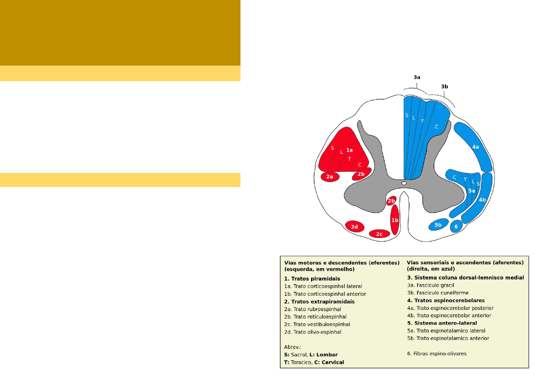 SP5-Trauma Raquimedular Definição O trauma raquimedular (TRM) é por definição qualquer injúria causada à coluna vertebral, incluindo ou não a medula espinhal e suas raízes nervosas. Em 15 a 20% desses casos ocorre lesão medular, o que piora muito o prognóstico da pessoa traumatizada. Anatomia A coluna vertebral é formada por 33 ou 34 vértebras (7 cervicais, 12 torácicas, 5 lombares, 5 sacrais e ‐ 4/5 coccígeas). A medula, nos adultos, possui cerca de 45 cm e estende-se desde a altura do atlas (C1) até a primeira ou segunda vértebra lombar (L1/L2). A medula espinal está dividida em segmentos, e as raízes nervosas que emergem da medula no nível de cada segmento são designadas por algarismos que se referem ao nível de sua saída. Da medula espinal, 31 pares de nervos espinais originam-se (8 cervicais, 12 torácicos, 5 lombares, 5 sacrais e 1 coccígeo). Cada raiz nervosa recebe informações sensitivas de áreas da pele denominadas dermátomos, e, de maneira similar, cada raiz nervosa inerva um grupo de músculos denominados miótomos. A localização do segmento da medula espinal não está na mesma altura do segmento ósseo vertebral correspondente. A medula espinal é um grande condutor de impulsos nervosos sensitivos e motores entre o cérebro e as demais regiões do corpo. Possui tratos orientados longitudinalmente (substância branca) circundando áreas centrais (substância cinzenta), onde a maioria dos corpos celulares dos neurônios espinais está localizada. Ao corte transversal, a substância cinzenta apresenta forma de H e pode ser subdividida em cornos anterior, lateral e posterior. No corno anterior, estão situados os corpos celulares dos neurônios motores e visceromotores (aferentes); no corno posterior, os neurônios sensitivos (eferentes); no corno lateral, os neurônios do sistema simpático. As fibras motoras oriundas do corno anterior juntam-se às fibras sensitivas do corno posterior para formar o nervo espinal. Os tratos da substância branca constituem vias nervosas ascendentes e descendentes, que conduzem impulsos nervosos em direção ao cérebro e de várias partes do cérebro para o resto do corpo. Os tratos mais importantes, do ponto de vista clínico, são: • Fascículos grácil e cuneiforme: Localizados na porção posterior da medula espinal, entre o sulco mediano posterior e o posterolateral, conduzem impulsos proprioceptivos provenientes de músculos, tendões e articulações, impulsos de localização e discriminação táteis e sensações vibratórias, como as produzidas pelo cabo do diapasão colocado sobre um osso recoberto de pele. • Tratos corticospinal lateral e ventral: As vias piramidais transmitem o impulso motor para os motoneurônios do corno anterior pelo trato corticospinal lateral (que cruza para o lado oposto no bulbo) e pelo trato corticospinal ventral, que desce sem cruzar para o lado oposto, na parte anterior da medula espinal. Controlam a força motora e são testados por meio de contrações voluntárias ou involuntárias mediante estímulo doloroso. • Tratos espinocerebelares ventral e dorsal: Relacionados à propriocepção, conduzem impulsos ao cerebelo pela medula espinal. • Trato espinotalâmico lateral: Medeia os impulsos da sensibilidade dolorosa e da temperatura do lado contralateral. Também tem origem na coluna posterior, cruza para o lado oposto na comissura anterior e ascende pelo funículo lateral ao tálamo. Clinicamente, pode ser avaliado beliscando-se a pele ou por meio de estímulo com objetos pontiagudos, como agulha ou alfinete. • Trato espinotalâmico ventral: Transmite impulsos relacionados ao tato. Tem origem na coluna posterior, cruza para o lado oposto na comissura anterior e ascende pelo funículo anterior até o tálamo. Epidemiologia A lesão da medula espinal ocorre em cerca de 15 a 20% das fraturas da coluna vertebral, e a incidência desse tipo de lesão apresenta variações nos diferentes países. No Brasil, cerca de 40 casos por milhão de habitantes. A lesão ocorre com mais frequência no sexo masculino, na proporção de 4:1, na faixa etária entre 15 e 40 anos. Acidentes automobilísticos, quedas de alturas, acidentes por mergulho em água rasa e ferimentos por arma de fogo e arma branca têm sido as principais causas de TRM. A localização anatômica da lesão está diretamente relacionada ao mecanismo do trauma, e cerca de dois terços das lesões medulares estão localizados no segmento cervical. Lesões da medula na região torácica ocorrem em 10% das fraturas desse segmento e em 4% das fraturas da coluna toracolombar. Fisiopatologia Os mecanismos pelos quais ocorre a lesão são divididos em primários e secundários. Primária é a lesão mecânica ocorrida no momento do trauma, e a lesão secundária é decorrente de uma série de mecanismos bioquímicos e celulares disparados pela lesão primária. Na ocasião do traumatismo ocorre a ruptura estrutural e fisiológica dos axônios, assim como dos vasos sanguíneos. A partir desse momento tem início uma série de reações em cascata, o que leva à lesão secundária. A transferência de energia cinética para a medula espinal, o rompimento de axônios, a lesão de células nervosas e a rotura de vasos sanguíneos causam tanto a lesão primária na medula espinal quanto seu estágio agudo (até oito horas após o trauma), ocorrendo hemorragia e necrose da substância cinzenta, seguidas de edema. Formam-se petéquias hemorrágicas na substância cinzenta, logo no primeiro minuto da LME, que se aglutinam na primeira hora, resultando em necrose central hemorrágica, condição que pode se estender para a substância branca nas quatro a oito horas seguintes, como consequência de redução geral do fluxo sanguíneo no local da lesão. A seguir, células inflamatórias migram para o local da lesão, acompanhadas de proliferação de células da glia, e, em uma a quatro semanas, ocorre a formação de tecido ci