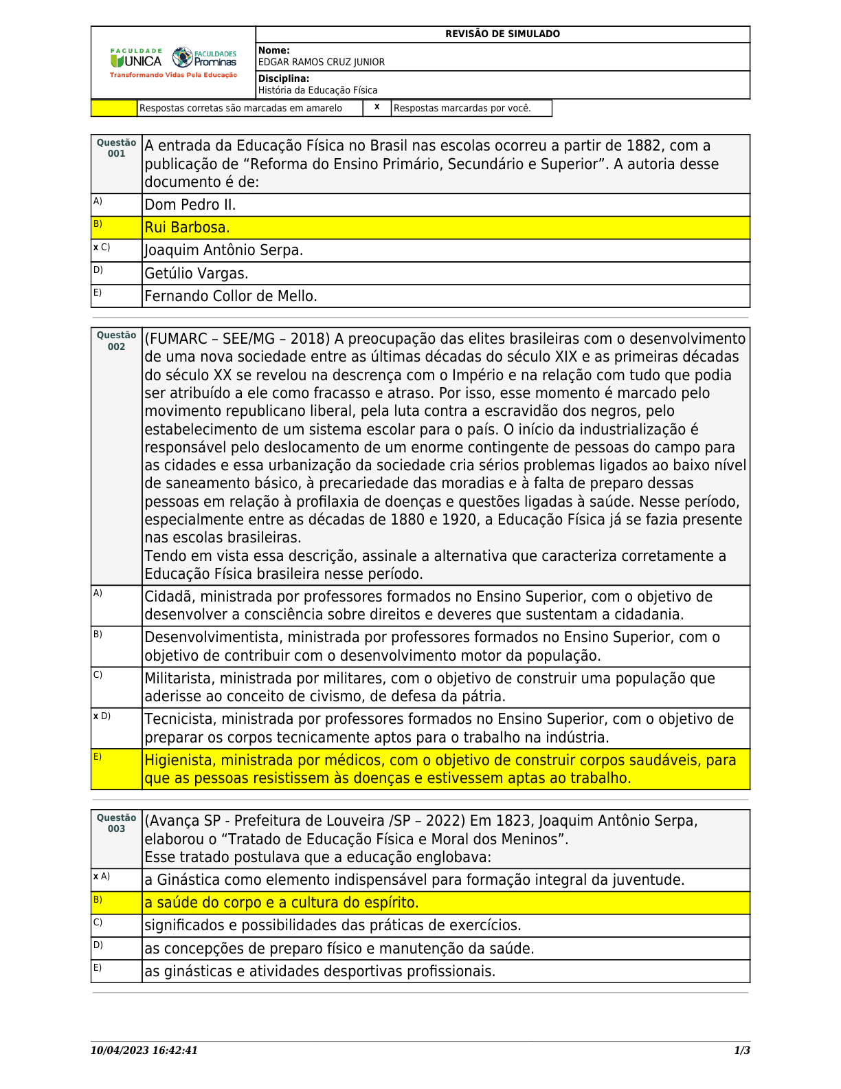 10/04/2023 16:42:41 1/3 REVISÃO DE SIMULADO Nome: EDGAR RAMOS CRUZ JUNIOR Disciplina: História da Educação Física Respostas corretas são marcadas em amarelo X Respostas marcardas por você. Questão 001 A entrada da Educação Física no Brasil nas escolas ocorreu a partir de 1882, com a publicação de “Reforma do Ensino Primário, Secundário e Superior”. A autoria desse documento é de: A) Dom Pedro II. B) Rui Barbosa. X C) Joaquim Antônio Serpa. D) Getúlio Vargas. E) Fernando Collor de Mello. Questão 002 (FUMARC – SEE/MG – 2018) A preocupação das elites brasileiras com o desenvolvimento de uma nova sociedade entre as últimas décadas do século XIX e as primeiras décadas do século XX se revelou na descrença com o Império e na relação com tudo que podia ser atribuído a ele como fracasso e atraso. Por isso, esse momento é marcado pelo movimento republicano liberal, pela luta contra a escravidão dos negros, pelo estabelecimento de um sistema escolar para o país. O início da industrialização é responsável pelo deslocamento de um enorme contingente de pessoas do campo para as cidades e essa urbanização da sociedade cria sérios problemas ligados ao baixo nível de saneamento básico, à precariedade das moradias e à falta de preparo dessas pessoas em relação à pro�laxia de doenças e questões ligadas à saúde. Nesse período, especialmente entre as décadas de 1880 e 1920, a Educação Física já se fazia presente nas escolas brasileiras. Tendo em vista essa descrição, assinale a alternativa que caracteriza corretamente a Educação Física brasileira nesse período. A) Cidadã, ministrada por professores formados no Ensino Superior, com o objetivo de desenvolver a consciência sobre direitos e deveres que sustentam a cidadania. B) Desenvolvimentista, ministrada por professores formados no Ensino Superior, com o objetivo de contribuir com o desenvolvimento motor da população. C) Militarista, ministrada por militares, com o objetivo de construir uma população que aderisse ao conceito de civismo, de defesa da pátria. X D) Tecnicista, ministrada por professores formados no Ensino Superior, com o objetivo de preparar os corpos tecnicamente aptos para o trabalho na indústria. E) Higienista, ministrada por médicos, com o objetivo de construir corpos saudáveis, para que as pessoas resistissem às doenças e estivessem aptas ao trabalho. Questão 003 (Avança SP - Prefeitura de Louveira /SP – 2022) Em 1823, Joaquim Antônio Serpa, elaborou o “Tratado de Educação Física e Moral dos Meninos”. Esse tratado postulava que a educação englobava: X A) a Ginástica como elemento indispensável para formação integral da juventude. B) a saúde do corpo e a cultura do espírito. C) signi�cados e possibilidades das práticas de exercícios. D) as concepções de preparo físico e manutenção da saúde. E) as ginásticas e atividades desportivas pro�ssionais. 10/04/2023 16:42:41 2/3 Questão 004 (CONTEMAX – Pref. de Orobó/PE – 2019) No que se refere a história da Educação Física no Brasil, considere as seguintes informações: I – No período pré-descobrimento os indígenas praticavam apenas exercícios naturais para a sobrevivência, tais como: caça com arco e �echa, pesca, nado, além da dança e ritos tribais. II – Nas escolas jesuítas a prática da educação física ocorria de forma lúdica e recreacional, não incorporada no currículo didático. III – A educação física se consolida como como prática obrigatória após parecer de Rui Barbosa relatando a importância do desenvolvimento físico aliado ao estudo intelectual nos países desenvolvidos. Estão corretas: A) apenas as a�rmativas I e II são verdadeiras. B) as 3 a�rmativas são falsas. C) apenas as a�rmativas II e III são verdadeiras. X D) as 3 a�rmativas são verdadeiras. E) apenas as a�rmativas I e III são verdadeiras. Questão 005 (IDHTEC — 2019). Com relação ao histórico da educação física e aos pressupostos higiênicos, físicos e eugênicos, assinale a alternativa correta. X A) Esforços físicos eram comumente associados às atividades dos escravos, portanto, atividades “menores”, assim houve resistência quanto à implementação da educação física como algo obrigatório nas escolas. B) A nobreza do império estava a favor de todos os pressupostos apresentados, ignorando o fato que à prática de exercícios físicos estavam associados aos escravos. C) Qualquer ação que demandasse esforço físico era vista pela sociedade da época com bons olhos, o que facilitou a obrigatoriedade da educação física nas escolas da época. D) A Educação Física não tinha como missão de incutir nos homens e mulheres da época a responsabilidade pela manutenção da pureza da raça branca. E) As instituições militares in�uenciaram negativamente a implantação da obrigatoriedade da educação física nas escolas, já que desejava-se alcançar a ordem e o progresso, mas para isso os pais teriam de ver seus �lhos indo para o campo de batalha, o que gerou revolta na sociedade. Questão 006 (Alternative Concursos – Pref. de Esperança do Sul/RS – 2021) De acordo com Palma e Vieira (2008) a escola passou por etapas/modelos de Educação na forma massi�cada: o modelo tradicional até 1930 com a Educação Física Higienista onde foi assegurado ao aluno o “direito” de adquirir conhecimento segundo o conhecimento cientí�co apresentado a ele. A Educação Física vinha com o papel de formar mão de obra sadia, forte disposta à ação, através da transmissão de conhecimento teórico e da disseminação de hábitos de higiene corporal. O modelo Escolanovista no pós-guerra (1945-1964), numa visão contrária ao Tradicional, surge com uma Educação Física preocupada com a formação do sujeito. E o modelo Tecnicista com uma Educação Física competitivista no �nal dos anos 60 e durante os anos 70 onde a principa