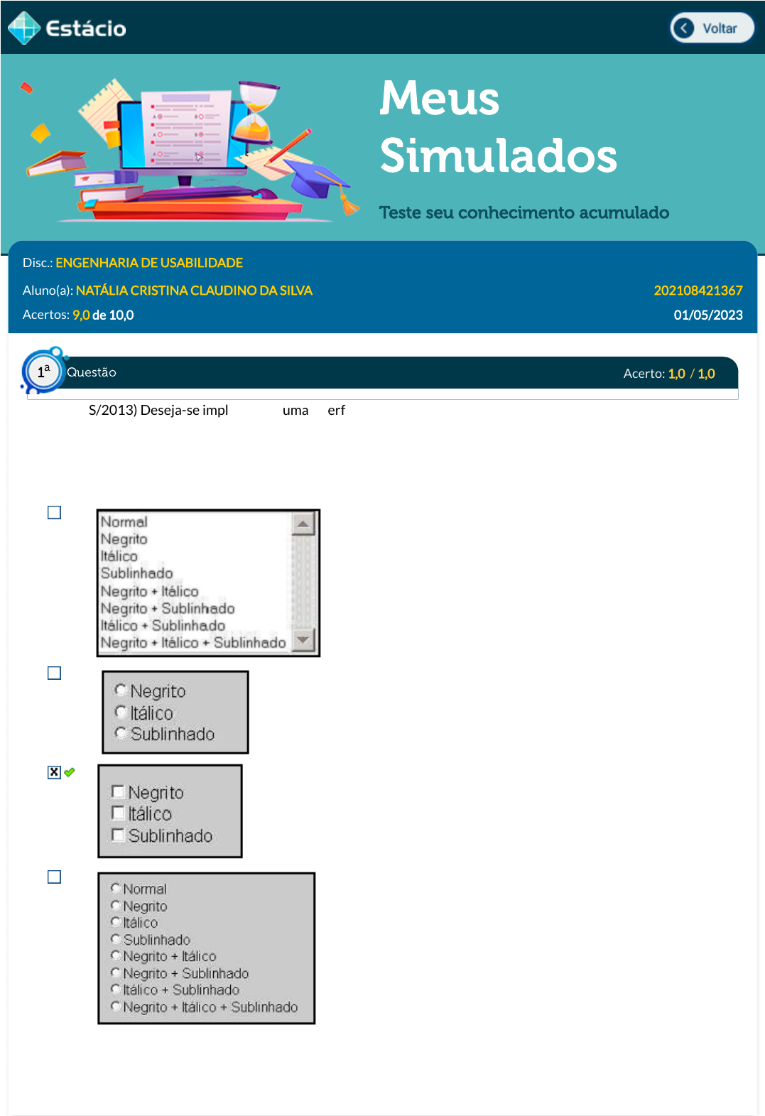 17/06/2023, 15:37 Estácio: Alunos https://simulado.estacio.br/alunos/ 1/6 Meus Simulados Teste seu conhecimento acumulado Disc.: ENGENHARIA DE USABILIDADE Aluno(a): NATÁLIA CRISTINA CLAUDINO DA SILVA 202108421367 Acertos: 9,0 de 10,0 01/05/2023 Acerto: 1,0 / 1,0 (UFRGS/2013) Deseja-se implementar uma interface grá�ca que permita que se escolha a marcação dos efeitos de texto Negrito, Itálico e Sublinhado, de tal forma que possa ser escolhido um dos três efeitos, dois deles ou até os três simultaneamente, ou, ainda, nenhum deles, mantendo o texto no modo normal, isto é, sem nenhum efeito. Segundo as regras de usabilidade vigentes, qual é a alternativa que realiza o solicitado com maior usabilidade? Questão1 a https://simulado.estacio.br/alunos/inicio.asp javascript:voltar(); 17/06/2023, 15:37 Estácio: Alunos https://simulado.estacio.br/alunos/ 2/6 Respondido em 01/05/2023 12:04:34 Explicação: Não poderíamos usar radio buttons, pois as opções são mutuamente exclusivas. Lista de seleção também não seria adequada. Por exclusão, temos a alternativa que utiliza checkbox. Acerto: 1,0 / 1,0 A experiência do usuário ao usar uma interface grá�ca é fundamental para garantir que o software ou aplicativo seja fácil e agradável de usar. A experiência do usuário envolve uma série de fatores, como a facilidade de uso, a clareza das informações apresentadas, a capacidade de navegar na interface e a e�ciência em realizar as tarefas desejadas. Nesse sentido, qual é a de�nição de "barreiras" na usabilidade de interfaces? Problemas mais simples que não afetam o usuário de forma signi�cativa. Problemas que impossibilitam que os usuários executem seu trabalho sem ajuda externa. Erros triviais que sempre ocorrem durante a execução do trabalho do usuário. Problemas que os usuários conseguem resolver após algumas tentativas. Problemas que não atrapalham nem atrasam a execução do trabalho do usuário. Respondido em 01/05/2023 12:05:34 Explicação: Existem três tipos de problemas que podem ser encontrados pelos usuários durante o uso do software. São estes: Barreiras, obstáculos e ruídos. Barreiras: Tipos de problemas que os usuários não conseguem superar sem ajuda externa. Isso impossibilita que os usuários executem seu trabalho. Obstáculos: Tipos de problemas que os usuários conseguem resolver após algumas tentativas, sem ajuda de terceiros. Isso atrasa a execução do trabalho por parte do usuário. Ruídos: Tipos de problemas mais simples. Não atrapalha nem atrasa a execução do trabalho do usuário, mas este pode �car com uma má impressão do sistema. Cada um desses tipos de problemas deve ser veri�cado à luz dos tipos de erro que podem ocorrer e tratados de forma adequada para impactar o mínimo possível o usuário durante a execução de seu trabalho. Acerto: 1,0 / 1,0 (IF- RS/2018) Usabilidade de software pode ser conceituada como a qualidade do uso do sistema para a realização de uma atividade. Softwares com problemas de usabilidade geram aborrecimentos aos usuários, perda de tempo, baixa produtividade etc. Para evitar estas consequências, surge a necessidade de se realizar constantemente medições quanto à qualidade do software. De acordo com os autores do livro Ergonomia e Usabilidade (2015), a norma ISO 9241:11 estabelece medidas para avaliação da qualidade do software. Quais são elas? Questão2 a Questão3 a 17/06/2023, 15:37 Estácio: Alunos https://simulado.estacio.br/alunos/ 3/6 Design, Velocidade e Interoperabilidade. E�ciência, Custo e Produtividade. Custo, E�cácia e Velocidade. E�cácia, E�ciência e Satisfação. Custo, E�ciência e Escalabilidade. Respondido em 01/05/2023 12:06:39 Explicação: A norma ISO 9241:11 estabelece medidas para avaliação da qualidade da usabilidade de sistemas interativos. Essas medidas são compostas por três fatores principais: e�cácia, e�ciência e satisfação do usuário. Acerto: 1,0 / 1,0 (FADESP/2012 - Adaptada) Método de avaliação de usabilidade que consiste em solicitar a usuários a realização de algumas tarefas de teste previamente estabelecidas para a avaliação da interface a ser estudada: Avaliação heurística. Uso de questionários e entrevistas. Levantamento de funcionalidades. Ensaios de interação. Uso de guidelines e checklists. Respondido em 01/05/2023 12:07:57 Explicação: Os Ensaios de interação são uma técnica de avaliação de usabilidade que envolvem a observação direta do comportamento do usuário enquanto realiza uma série de tarefas em um sistema ou produto. Eles são conduzidos em um ambiente controlado, onde os usuários são convidados a realizar tarefas especí�cas e são observados por um avaliador que registra informações sobre suas ações e comportamentos. Acerto: 1,0 / 1,0 (UFMT/2018 - Adaptada) Considerando a situação hipotética: um usuário acessa um sítio na Internet e deseja cadastrar-se. Ao acessar a tela de cadastro ele preenche dados para acesso, como, nome, e-mail, senha e con�rmação da senha e clica no botão Cadastrar. Ao clicar no botão nenhuma mensagem é exibida e ele é direcionado para outra tela, onde ele deve continuar o cadastro digitando os dados referentes ao endereço. O usuário nota que o formulário dessa tela é diferente do formulário da tela anterior (tamanho e disposição dos campos do formulário, cores, formatação do texto, entre outros), mas mesmo assim �naliza o cadastro e clica no botão Salvar dados. Ao clicar nesse botão, o usuário é direcionado para a tela inicial do sítio sem receber uma mensagem clara se o cadastro foi ou não concluído com sucesso, a con�rmação do cadastro aconteceu apenas alguns minutos depois por meio do recebimento de um e-mail. Tendo por base a situação hipotética exposta, caso se realizasse uma avaliação de usabilidade no cadastro descrito utilizando as 10 Heurísticas de usabilidade para o projeto de interface do
