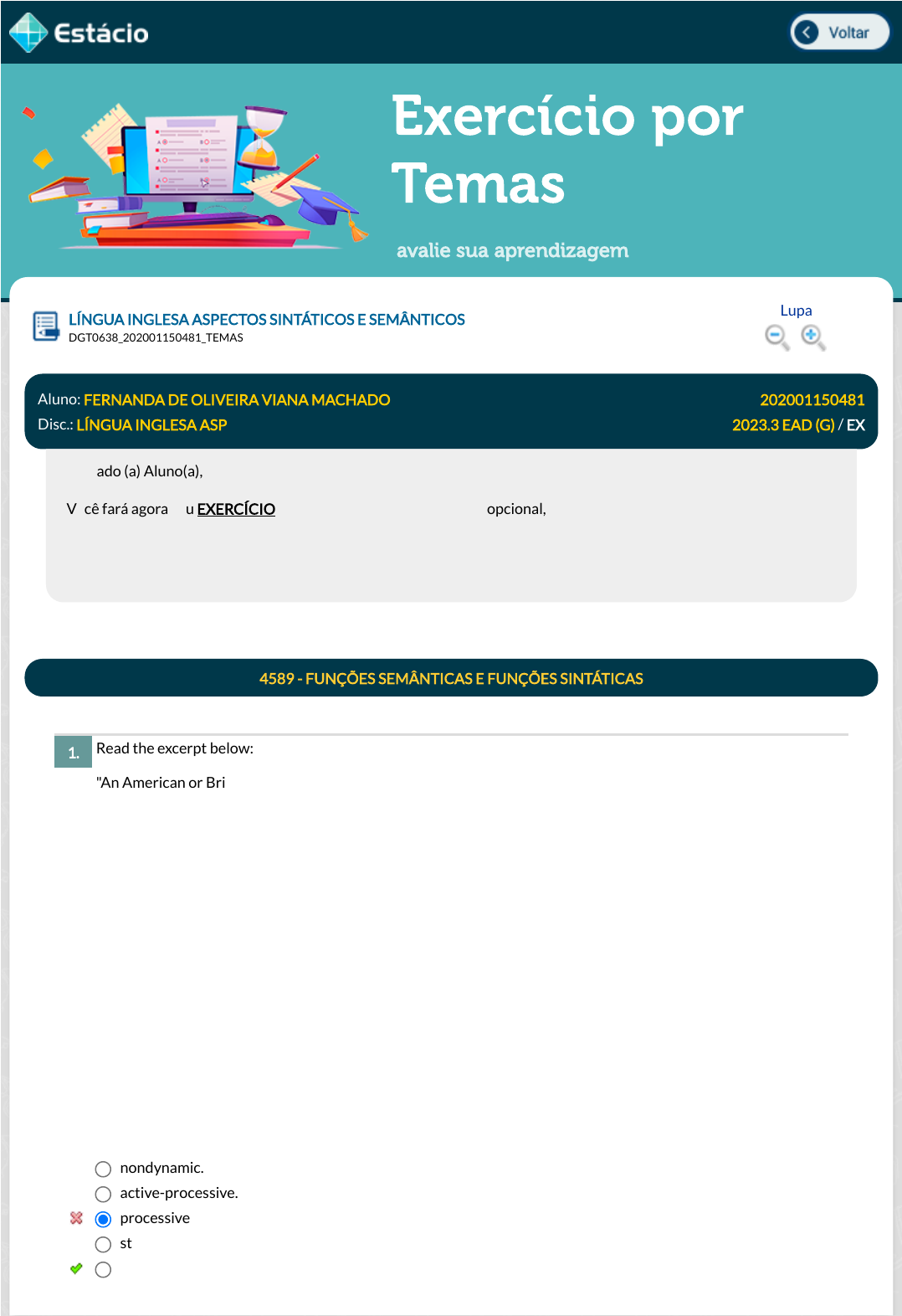 30/09/2023, 20:57 Estácio: Alunos https://simulado.estacio.br/alunos/ 1/8 Exercício por Temas avalie sua aprendizagem Read the excerpt below: "An American or British person might be looking their client in the eye to show that they are paying full attention to what is being said, but if that client is from Japan or Korea, they might �nd the direct eye contact awkward or even disrespectful. In parts of South America and Africa, prolonged eye contact could also be seen as challenging authority. In the Middle East, eye contact across genders is considered inappropriate, although eye contact within a gender could signify honesty and truthfulness. Having an increased awareness of the possible differences in expectations and behaviour can help us avoid cases of miscommunication, but it is vital that we also remember that cultural stereotypes can be detrimental to building good business relationships. Although national cultures could play a part in shaping the way we behave and think, we are also largely in�uenced by the region we come from, the communities we associate with, our age and gender, our corporate culture and our individual experiences of the world. The knowledge of the potential differences should therefore be something we keep at the back of our minds, rather than something that we use to pigeonhole the individuals of an entire nation." Retrieved from: https://learnenglish.britishcouncil.org/skills/reading/c1-reading/cultural-behaviour-in-business. Verbs establish dynamic or static relations with the other elements of the sentence. There are two major types of sentences: dynamic and stative. Dynamic sentences may be further divided into three categories: active, processive and active-processive. The sentence "An American or British person might be looking their client in the eye" exempli�es the following category: LÍNGUA INGLESA ASPECTOS SINTÁTICOS E SEMÂNTICOS Lupa DGT0638_202001150481_TEMAS Aluno: FERNANDA DE OLIVEIRA VIANA MACHADO Matr.: 202001150481 Disc.: LÍNGUA INGLESA ASP 2023.3 EAD (G) / EX Prezado (a) Aluno(a), Você fará agora seu EXERCÍCIO! Lembre-se que este exercício é opcional, mas não valerá ponto para sua avaliação. O mesmo será composto de questões de múltipla escolha. Após responde cada questão, você terá acesso ao gabarito comentado e/ou à explicação da mesma. Aproveite para se familiarizar com este modelo de questões que será usado na sua AV e AVS. 4589 - FUNÇÕES SEMÂNTICAS E FUNÇÕES SINTÁTICAS 1. nondynamic. active-processive. processive. stative. active. Data Resp.: 30/09/2023 20:56:39 javascript:voltar(); javascript:voltar(); javascript:voltar(); javascript:voltar(); javascript:diminui(); javascript:diminui(); javascript:aumenta(); javascript:aumenta(); 30/09/2023, 20:57 Estácio: Alunos https://simulado.estacio.br/alunos/ 2/8 Read the text bellow: "In 2020 it became the �rst such game to be approved by the US Food and Drug Administration (FDA) for use in the treatment of ADHD in children. Currently only available on prescription from doctors in the US, EndeavorRx at �rst glance looks very similar to countless other games. You control a little alien that races on a spaceship through different worlds having to collect things. But the app-based game was developed in conjunction with neuroscientists, and is designed to stimulate and improve areas of the brain that play a key role in attention function. The idea is that it trains a child with ADHD to both better multitask and ignore distractions, with a computer algorithm measuring his or her performance and customising the dif�culty of the game in real time. When doctors prescribe it, the child's parents get sent an activation link that is needed before the game will play. Kelcey says she was "a little sceptical", but at the end of 2020 Owain started a three-month programme, playing the game for 25 minutes a day. He then did another round last year. "He admitted it was a little harder than he expected," she says. "But he understood that he was doing it to help improve his focus. He remained super motivated despite the dif�culties and frustrations that came along with it." After each of Owain's sessions she noted his daily behaviour in the app, and tracked his progress. Soon she started to see small, positive changes in his behaviour. For example, getting ready for school had become smoother, and there were no negative messages from teachers. And after failing �fth grade, Owain subsequently shot up to getting As and Bs for his work. "It has been amazing to see my son so successful, but more so, seeing him have con�dence in himself," Kelcey says. "He is no longer upset and confused about why he just does not get it." Eddie Martucci, chief executive of Akili, the Boston-based tech �rm behind EndeavorRx, says the game has been designed to boost cognitive progressing." Retrieved from: https://www.bbc.com/news/business-62060542. Verbs may establish dynamic or static relations with the other elements that are part of the sentence. Dynamic sentences may be even further categorized into: active, processive and active-processive. The sentence "In 2020 it became the �rst such game to be approved by the US Food and Drug Administration (FDA) for use in the treatment of ADHD in children" is: Explicação: In this sentence, the verb "look" implies an action with an intention of someone to look something. Therefore, it is an active sentence. Active sentences are composed of action verbs. Consequently, they require a subject that does something. Therefore, since the subject does something in the sentence, it exempli�es an active sentence. 2. active-processive. processive. dynamic. active. stative. Data Resp.: 30/09/2023 20:56:43 Explicação: In this sentence, the subject "it (the game)" is in a speci�c condition. Moreover, it is constructed by a state verb (to become), which means that it is a stative sentence. Stative sentences are constructed by less dynamic verbs, or