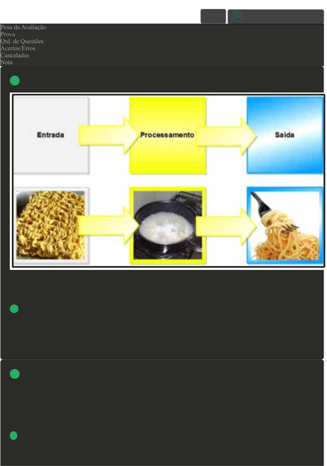 01/10/2023, 10:08 Avaliação I - Individual about:blank 1/4 Prova Impressa GABARITO | Avaliação I - Individual (Cod.:823257) Peso da Avaliação 1,50 Prova 63804978 Qtd. de Questões 10 Acertos/Erros 7/2 Canceladas 1 Nota 8,00 A construção de um algoritmo apresenta três etapas distintas: Entrada, Processamento e Saída. Analise a figura a seguir: Agora, analise a descrição: é o resultado esperado; são os dados produzidos na etapa de processamento. A qual das três etapas essa descrição pertence? A Processamento. B Saída. C Recursividade. D Entrada. Sobre as formas de representação de algoritmos, algumas técnicas tratam apenas da representação lógica, ignorando detalhes de programação que dependem de uma tecnologia específica (linguagem de programação). Em contrapartida, existem técnicas que de tão detalhistas acabam dificultando a compreensão da solução proposta. Nesse contexto, assinale a alternativa CORRETA que apresenta quando é usada a descrição narrativa: A Quando há a preocupação com detalhes de nível físico da implementação do algoritmo, em que figuras geométricas diferentes representam a entrada e a saída de informações de dispositivos distintos. B Quando se deseja que o receptor da mensagem entenda o que será feito, mesmo não tendo domínio acerca da elaboração de algoritmos. VOLTAR A+ Alterar modo de visualização 1 2 01/10/2023, 10:08 Avaliação I - Individual about:blank 2/4 C Quando se deseja usar a PDL como referência genérica para uma linguagem de projeto de programação, tendo como finalidade mostrar uma notação para elaboração de algoritmos, os quais serão utilizados na definição, criação e desenvolvimento de uma linguagem computacional e sua documentação. D Quando o seu uso consiste no fato de que é mais fácil representar as estruturas que tem um ponto de entrada e um ponto de saída e são compostas pelas estruturas básicas de controle de sequência, seleção e repartição. Algoritmo exige prática, não é possível estudar ou copiar algoritmos. Somente aprendemos algoritmos no processo de construí-los e testá-los. Algoritmo não é um termo exclusivo e usado somente no setor computacional para codificar programas de computador. Pode ser usado para descrever os passos que devem ser seguidos na execução de processos, tarefas ou solução de qualquer tipo de problema. O conceito só foi documentado e reconhecido em 1936, por meio de um estudioso. Com base nesse estudioso, assinale a alternativa CORRETA: A Alan Turing. B Issac Newton. C Stefhen Hawking. D Albert Einstein. Várias são as práticas adotadas para a construção de algoritmos. Com base no exposto, assinale a alternativa INCORRETA: A Construir o algoritmo para representar a sequência de execução dos passos. B Descrever os passos para resolver o problema. Basicamente descrever o processo de soma dos dois números. C Definir os dados de entrada ignorando os dados de saída. Na situação proposta, o resultado da soma dos dois números usados como saída do problema. D Identificar e definir as entradas do algoritmo. No caso do problema proposto, você teria como entrada dois números. Há vários tipos ou classificações para a lógica. Dentre os principais tipos, com base nas suas respectivas definições, associe os itens, utilizando o código a seguir: I- Lógica aristotélica. II- Lógica de programação. III- Lógica de argumentação. IV- Lógica matemática. V- Lógica Proposicional. ( ) É uma área da lógica que examina os raciocínios de acordo com as relações entre as orações, as unidades mínimas do discurso, que podem ser verdadeiras ou falsas. ( ) Essa lógica tem como objeto de estudo o pensamento. ( ) É a linguagem usada para criar um programa de computador. ( ) Estuda a lógica segundo a sua estrutura ou forma. ( ) Permite verificar a validade ou se um enunciado é verdadeiro ou não. Assinale a alternativa que apresenta a sequência CORRETA: A I - III - IV - V - II. B V - I - II - IV - III. C V - I - II - III - IV. D I - V - III - IV - II. 3 4 5 01/10/2023, 10:08 Avaliação I - Individual about:blank 3/4 Na programação, existem várias formas de representar um programa. Nesse sentido, essas formas possuem diversas características associadas. Com base no exposto, assinale a alternativa CORRETA: A O pseudocódigo é diferente do portugol, sendo uma representação parecida com a forma de escrita de programas escritos em versão computacional. B O pseudocódigo ou portugol é uma representação parecida com a forma de escrita de programas escritos em versão computacional. C VisioALG é uma forma de representação de algoritmos, é praticamente um programa de linguagem que, depois, podemos passar para o computador. Para escrevermos códigos com VisioALG precisaremos conhecer alguns comandos básicos. D PascalALG é uma forma de representação de algoritmos, é praticamente um programa de linguagem que, depois, podemos passar para o computador. Para escrevermos códigos com PascalALG precisaremos conhecer alguns comandos básicos. Há um tipo de operador utilizado na expressão a seguir, considerando que uma expressão pode conter mais que um operador: (Parar = Sim) ou (Sinal = “Vermelho”) Com base no exposto, assinale a alternativa CORRETA: A Lógico. B Aritmético e Lógico C Lógico e Relacional. D Aritmético e Relacional Há algumas formas de representação mais conhecidas para a representação de algoritmos. Com base no Diagrama de Chapin, assinale a alternativa CORRETA: A O criador foi Nerd Chapin. B A recursividade é dificilmente representada neste tipo de diagrama. C Foi criado com a intenção de substituir os diagramas tradicionais. D O objetivo era apresentar uma visão menos hierárquica e estruturada da lógica do sistema. Atenção: Esta questão foi cancelada, porém a pontuação foi considerada. Os operadores aritméticos relacionam as operações aritméticas básicas. Como exemplo, 