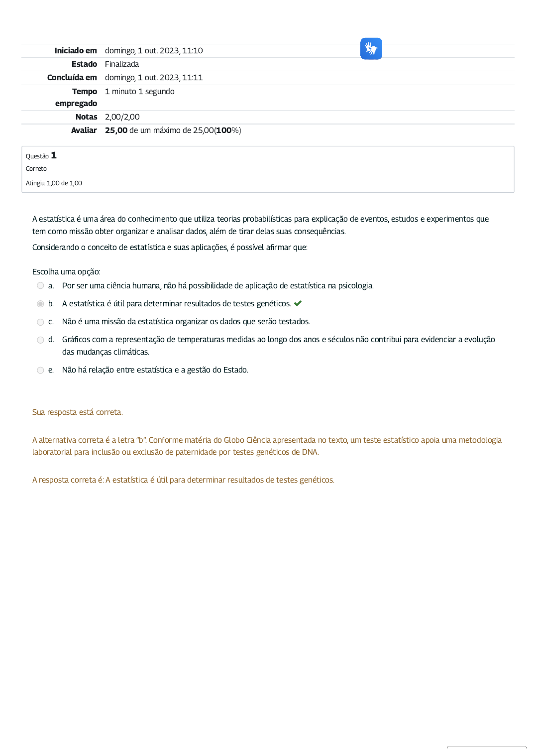 Iniciado em domingo, 1 out. 2023, 11:10 Estado Finalizada Concluída em domingo, 1 out. 2023, 11:11 Tempo empregado 1 minuto 1 segundo Notas 2,00/2,00 Avaliar 25,00 de um máximo de 25,00(100%) Questão 1 Correto Atingiu 1,00 de 1,00 A estatística é uma área do conhecimento que utiliza teorias probabilísticas para explicação de eventos, estudos e experimentos que tem como missão obter organizar e analisar dados, além de tirar delas suas consequências. Considerando o conceito de estatística e suas aplicações, é possível a�rmar que: Escolha uma opção: a. Por ser uma ciência humana, não há possibilidade de aplicação de estatística na psicologia. b. A estatística é útil para determinar resultados de testes genéticos. c. Não é uma missão da estatística organizar os dados que serão testados. d. Grá�cos com a representação de temperaturas medidas ao longo dos anos e séculos não contribui para evidenciar a evolução das mudanças climáticas. e. Não há relação entre estatística e a gestão do Estado. Sua resposta está correta. A alternativa correta é a letra “b”. Conforme matéria do Globo Ciência apresentada no texto, um teste estatístico apoia uma metodologia laboratorial para inclusão ou exclusão de paternidade por testes genéticos de DNA. A resposta correta é: A estatística é útil para determinar resultados de testes genéticos. Questão 2 Correto Atingiu 1,00 de 1,00 Considerando as áreas de aplicação da estatística, descritiva; inferencial; e probabilidade, é possível a�rmar que: Escolha uma opção: a. A análise exploratória de dados é a mais recente abordagem para estatística descritiva e apoia-se fortemente no uso de grá�cos. b. As medidas de centralidade trabalhadas na estatística descritiva não têm aplicabilidade no estudo de probabilidades. c. Usando métodos de estatística inferencial não é possível generalizar achados de uma amostra. d. A probabilidade do lançamento de um dado não viciado apresentar a face 6 é de 2/6. e. O uso de ferramentas estatísticas conseguiu provar que a idade média de pessoas que tiveram alta após internação por COVID é maior do que as que foram a óbito após a internação. Sua resposta está correta. A alternativa correta é a letra “a”. Conforme Bussab e Morettin a análise descritiva de dados “limita-se a calcular algumas medidas de posição e variabilidade, como a média e variância, por exemplo” com o fortalecimento da AED passou-se a investir mais em técnicas grá�cas em contraposição ao mero resumo numérico. A resposta correta é: A análise exploratória de dados é a mais recente abordagem para estatística descritiva e apoia-se fortemente no uso de grá�cos. Selecione o idioma Powered by Tradutor https://translate.google.com/ https://translate.google.com/