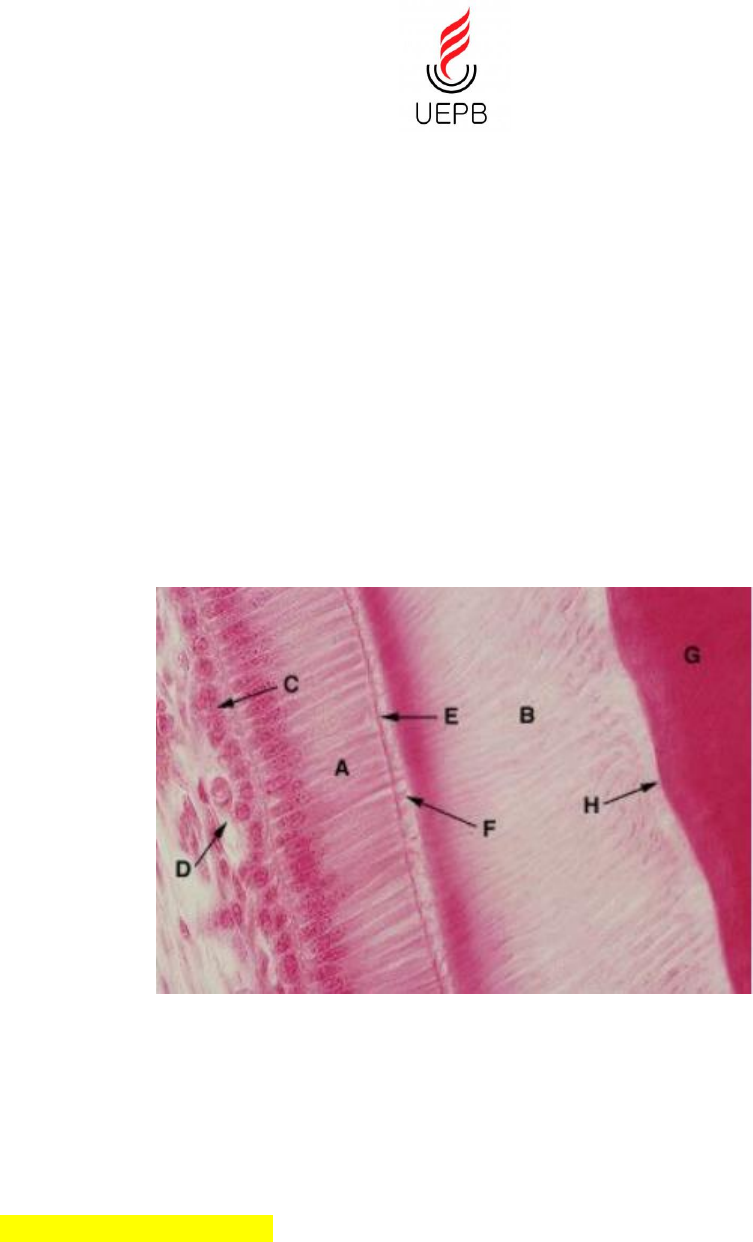 UNIVERSIDADE ESTADUAL DA PARAÍBA – UEPB CAMPUS VIII – CENTRO DE CIÊNCIAS, TECNOLOGIA E SAÚDE CURSO DE ODONTOLOGIA CONCEPÇÃO E FORMAÇÃO DO CORPO HUMANO II Professora:Aldelany Ramalho Freire (aldelanyramalho@hotmail.com) Monitora: Thaís Santos de Souza MATERIAL DE APOIO PRÁTICA: ESMALTE A: AMELOBLASTOS B: ESMALTE C: CÉLULAS DO ESTRATO INTERMÉDIO D: CAPILAR SANGUÍNEO E: TERMINAÇÕES DOS AMELOBLASTOS (BARRAS TERMINAIS) F: PROCESSO DE TOMES G: DENTINA H: JUNÇÃO AMELO-DENTINÁRIA http://www.google.com.br/url?sa=i&rct=j&q=&esrc=s&frm=1&source=images&cd=&cad=rja&uact=8&ved=0ahUKEwiS9OPZy8LLAhVGfpAKHTikAe4QjRwIBw&url=http://www.uepb.edu.br/conselho-universitario-aprova-novo-logotipo-da-universidade-estadual-da-paraiba-por-unanimidade/&psig=AFQjCNHR4WMilLK_9ivYr2dqxFwy9lSwhQ&ust=1458127856429253 Importância do processo de Tomes: Como consequência da deposição da primeira camada de esmalte, os ameloblastos afastam- se em direção ao estrato intermediário, desenvolvendo uma curta projeção cônica a partir do seu citoplasma distal, é o processo de Tomes. Com o surgimento desse processo de Tomes no polo distal dos ameloblastos, inicia a segunda parte da fase secretora, pois essas projeções passam a comandar a orientação do esmalte em formação. A formação do esmalte prismático ocorre pelos processos de Tomes: Após o desenvolvimento dos processos de Tomes, os ameloblastos formam um esmalte estruturalmente diferente, constituído pelo arranjo dos cristais de mineral em unidades características denominadas prismas, devido à mudança na movimentação dos ameloblastos durante a deposição da matriz e mineralização. Com o avançar da secreção, os outros componentes do órgão do esmalte (o estrato intermediário, o retículo estrelado e o epitélio externo) completam seu colapso. Ao finalizar a fase secretora, o ameloblasto não mais apresenta processo de Tomes. Entretanto, mais algumas camadas podem ser ainda depositadas, estabelecendo o esmalte aprismático superficial. Tufo do esmalte Fuso do esmalte B: LAMELA DO ESMALTE TUFOS, LAMELAS E FUSOS: são três estruturas encontradas no esmalte e se originam em diversas fases da amelogênese, e são detectadas nas preparações de dente desgastado, principalmente em cortes transversais. TUFOS – são áreas levemente hipomineralizadas que contêm a proteína tufelina. São finas e curtas fitas onduladas que se originam na junção amelodentinária, alcançando no máximo um terço da espessura do esmalte. Como as preparações por desgaste têm espessura considerável, a ondulação dessas áreas levemente hipomineralizadas resulta na aparência de tufos. FUSOS – originam-se nos primeiros momentos da amelogênese, na fase de diferenciação. Quando os odontoblastos em diferenciação começam a secreção da matriz orgânica da dentina do manto e a lâmina basal torna-se descontínua, alguns dos seus processos penetram entre dois pré-ameloblastos em diferenciação, invadindo, portanto, a região do futuro esmalte. São a continuação dos túbulos dentinários. LAMELAS – são também áreas hipomineralizadas em forma de fita, porém, estas são mais longas, alcançando frequentemente a superfície externa do dente. Por essa razão, nas preparações por desgaste as lamelas parecem verdadeiras rachaduras do esmalte. Estrias de Retzius: durante a formação do esmalte, ocorrem períodos de repouso, que se refletem na formação de linhas incrementais de crescimento, são as Estrias de Retzius. Refletem a mudança de direção dos ameloblastos durante a formação dos prismas. - Após os períodos de repouso, os ameloblastos recomeçam a deposição de matriz, com a consequente mineralização inicial, mudando levemente de direção. Dessa maneira, aparecem linhas que nas preparações longitudinais de dentes desgastados são escuras, dando a falsa impressão de serem hipomineralizadas. Bandas de Hunter-Schreger: o trajeto sinuoso que seguem faz com que, quando observadas preparações por desgaste em sentido longitudinal de dentes não descalcificados, os prismas apareçam cortados em planos diferentes nas regiões em que ocorrem as leves curvaturas. Desse modo, ocorre desvio da luz incidente durante a observação ao microscópio de luz, originando bandas claras e escuras denominadas de Hunter-Schreger. Estrias de Retzius Bandas de Hunter- Schreger Esmalte nodoso: nas regiões dos vértices das cúspides, alguns prismas entrecruzam-se irregularmente uns com os outros desde a junção amelodentinária até a superfície externa do vértice da cúspide, constituindo a região denominada esmalte nodoso. Bandas de Hunter- Schreger Esmalte nodoso Estriações transversais: em algumas regiões de esmalte desgastado são observadas também leves estriações que aparecem transversais em relação ao longo eixo dos prismas; - Podem representar o ritmo circadiano na produção do esmalte pelos ameloblastos; - Em contrapartida, outras hipóteses sobre o significado dessas estriações têm sido formuladas: micrografias eletrônicas de varredura, às vezes, mostram leves constrições nos prismas, as quais poderiam ser observadas na microscopia de luz como estriações; - A dificuldade em se obterem cortes de esmalte devidamente orientados compromete a exata interpretação dessas estriações nas preparações por desgaste. Estriações transversais