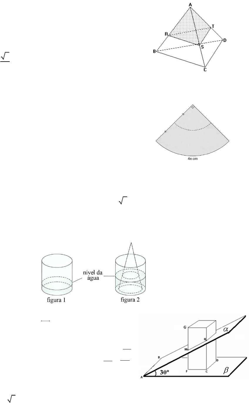 1. O plano (RST) é paralelo à base (BCD) da pirâmide triangular ABCD, cuja altura mede 3 cm, desenhada abaixo. Determine à distância do vértice A ao plano (RST), sabendo que ele divide a pirâmide em duas partes de mesmo volume. Resp.: 3 2 3 2. O setor circular a seguir representa a planificação da superfície lateral de um cone circular reto. A linha pontilhada demarca uma seção transversal que viria a ser feita no cone, determinando um tronco de cone. Determine a área total desse tronco. Resp.: 9 cm² 3. Um recipiente cilíndrico, cujo raio da base mede 7 cm, contém água até a altura de 2 cm (figura 1). Colocando-se um sólido em formato de cone circular reto dentro desse recipiente, de forma que a base do cone fique totalmente apoiada na base do recipiente, o nível da água sobe até a altura de 3 cm, conforme mostrado na figura 2. Se a medida da altura do cone é 6 cm, determine o raio desse cone. Resp.: 2 cm 4. Os planos e formam um ângulo de 30º e a sua interseção é a reta AB . O plano secciona um paralelepípedo retângulo cuja base quadrada CDEF está contida no plano , conforme indica a figura ao lado. O plano passa pelo ponto médio M da aresta lateral GF do prisma que mede 8 cm. Se 4MN cm e AB // CD , calcule a porcentagem de volume do paralelepípedo que está compreendido entre os planos e . Resp.: 40 3 cm³ 5. A base de um paralelepípedo oblíquo é um quadrado de lado a. Uma das arestas laterais é b e forma um ângulo de 060 com os lados adjacentes da base. Determine o volume desse paralelepípedo. 6. Um cilindro de revolução de raio da base r e um semicilindro de revolução de raio da base R são equivalentes e têm áreas laterais iguais. Calcular a razão entre r e R. 7. Mostre que: Quando um cone está circunscrito a uma esfera de raio a, o raio r e a altura h do cone estão ligados ao raio da esfera pela relação: 2 2 1 1 2 a r ah 8. Um cone circular reto, cujo raio da base é 3 cm, está inscrito em uma esfera de raio 5 cm, conforme mostra a figura ao lado. O volume do cone corresponde a que porcentagem do volume da esfera? a) 26,4% b) 21,4% c) 19,5% d) 18,6% e) 16,2% 9. Calcule o volume do sólido gerado pela rotação da superfície sombreada em torno do eixo e. Resp.: 32 3 r ( as duas)