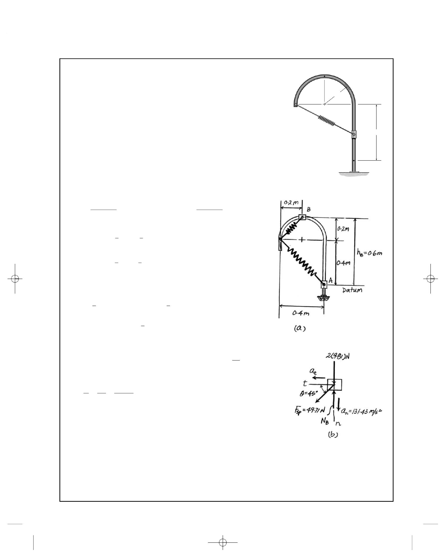 91962_03_s14_p0285-0354 08/06/09 09:54 Página 349 C B © 2010 Pearson Education, Inc., Upper Saddle River, NJ. Todos os direitos reservados. Este material está protegido por todas as leis de direitos autorais conforme atualmente D A 0,2m existir. Nenhuma parte deste material pode ser reproduzida, de qualquer forma ou por qualquer meio, sem permissão por escrito do editor. k 600 N/m 0,4m 0 + (0 + 40,118) = . = força exercida no colar nesta posição. A primavera tem 2 R 0,2 2 mvA 2 AVg B A AVg B B = mghA = 2(9,81)(0) = 0 = mghB = 2(9,81)(0,6) = 11,772 J 1 Resp. . você = tan-1 a 0,2 (600)(0,36572 ) = 40,118J Conservação de energia: *14–100. O colar de 2 kg é liberado do repouso em A e e (600)(0,082842 ) = 2,0589J 0,2 + c AVg B B = um = (2)vB e 1 energia potencial do colar nas posições A e B são = Resp. 2 as posições são AVe B A 349 = 131,43m>s 1 = Nota = -208,09N = 208NT Fsp = ksB = 600(0,08284) = 49,71 N + (Ve)Ad = 2 + (Ve) Bd Energia Potencial: Com referência ao dado definido na Fig. a, a energia gravitacional ; . vB = 5,127m>s = 5,13m>s = 1 o diagrama de corpo livre. (5.127)2 sA = 20,42 + 0,42 - 0,2 = 0,3657 m sB = 20,22 + 0,22 e Assim, a energia potencial elástica da mola quando o colar está nesses dois AVe B B 2 mvB 2 2 2(9,81) + 49,71 sen 45°- NB = 2(131,43) Equação do Movimento: Quando o colar está na posição B, + c AVg B A - 0,2 = 0,08284m 2 do colar quando atinge a posição B. Além disso, encontre o normal ©Fn = mãe . Aqui, = + (11,772 + 2,0589) comprimento não esticado de 200 mm. 1 e 1 Quando o colar está nas posições A e B, a mola estica 1 Nota: O sinal negativo indica que NB atua no sentido oposto ao mostrado na Referindo-se ao diagrama de corpo livre do colar mostrado na Fig . ksA 0,2 b = 45° viaja ao longo da guia vertical suave. Determinar a velocidade . ksB v2 vB 2 2 TA + VA = TB + VB 2 2 n 2 Machine Translated by Google = ap - 2 br •14–101. Um tubo quarto de círculo AB de raio médio r contém uma corrente lisa que tem massa por unidade de comprimento igual a . m0 Se a corrente for liberada do repouso a partir da posição mostrada, determine sua velocidade quando ela emerge completamente do tubo. 2r. Assim, o centro de massa está em h1 = r - m0r 2 Com referência ao dado definido na Fig. a, a energia potencial gravitacional da cadeia nas posições (1) e (2) é Média B 2 0 + ap - 2 2 bm0r2 g = 2 ap 2 m0rbv2 2 Conservação de energia: Ó p 1 Energia Potencial: A localização do centro de gravidade G da corrente nas posições (1) e (2) é mostrada na Fig. A massa da cadeia é p + Média B 1 Resp. 91962_03_s14_p0285-0354 08/06/09 09:54 Página 350 + Média B 2 2 rb = Média B 1 350 e = p A = mgh2 = 0 =A2 R + 0 . T1 + V1 = T2 + V2 B p 1 2 mv1 2 p(p - 2)g = mgh1 = ap 2 m0rgb ap - 2 p br = ap - 2 2 bm0r2 g m = m0 uma 1 2 mv2 2 v2 © 2010 Pearson Education, Inc., Upper Saddle River, NJ. Todos os direitos reservados. Este material está protegido por todas as leis de direitos autorais existentes atualmente. Nenhuma parte deste material pode ser reproduzida, de qualquer forma ou por qualquer meio, sem permissão por escrito do editor. Machine Translated by Google
