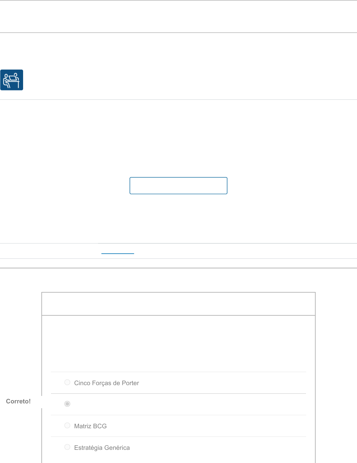 Unidade 4: Lição 3: Atividade Não Avaliativa - Verificação de Conhecimento Entrega Sem prazo Pontos 100 Perguntas 2 Limite de tempo Nenhum Tentativas permitidas Sem limite Instruções Histórico de tentativas Tentativa Tempo Pontuação MAIS RECENTE Tentativa 1 Menos de 1 minuto 100 de 100 Enviado 26 fev em 13:18 Verificação de Conhecimento Após a atividade anterior, faça este teste para verificar sua compreensão. Como este exercício é corrigido automaticamente, você verá seus resultados no final do teste. Estude cuidadosamente as explicações para qualquer pergunta que você responda incorretamente. Esse feedback ajudará a redirecioná-lo no início do seu aprendizado se um conceito não estiver claro. Fazer o teste novamente 50 / 50 ptsPergunta 1 Quando o estrategista está apresentando a relação de causa e efeito entre os indicadores de desempenho, ele está utilizando qual ferramenta estratégica? Cinco Forças de Porter Mapa Estratégico Correto!Correto! Matriz BCG Estratégia Genérica https://online.instructure.com/courses/1636/quizzes/46212/history?version=1 https://online.instructure.com/courses/1636/quizzes/46212/take?user_id=8390 Matriz de Ansoff Sua resposta está correta, pois neste caso, o estrategista está utilizando o mapa estratégico. As demais alternativas não representam o enunciado. 50 / 50 ptsPergunta 2 O desenvolvimento da estratégia organizacional é um processo complexo e exigente, em que os líderes que dedicaram tempo, esforço e recursos à seleção de uma estratégia que acreditam que garantirá o sucesso contínuo de sua empresa podem sentir que têm motivos para estarem confiantes sobre o futuro. Se a estratégia é ser mais do que uma expressão de esperanças e aspirações para o futuro, as implicações práticas para as operações e atividades organizacionais devem ser pensadas e colocadas em prática. A implementação da estratégia exige que as organizações coloquem iniciativas focadas e concretizáveis. A respeito da estratégia organizacional, podemos dizer que as iniciativas estratégicas devem ser: Inalcançáveis, mas aplicáveis. Irrealistas, mas alcançáveis. Alcançáveis e irrealistas. Realistas, mas alcançáveis. Correto!Correto! Realistas e inalcançáveis. Um foco estratégico deve encorajar uma organização a desenvolver processos disciplinados para alimentar iniciativas estratégicas, em toda a organização, de forma significativa, realista e alcançável.