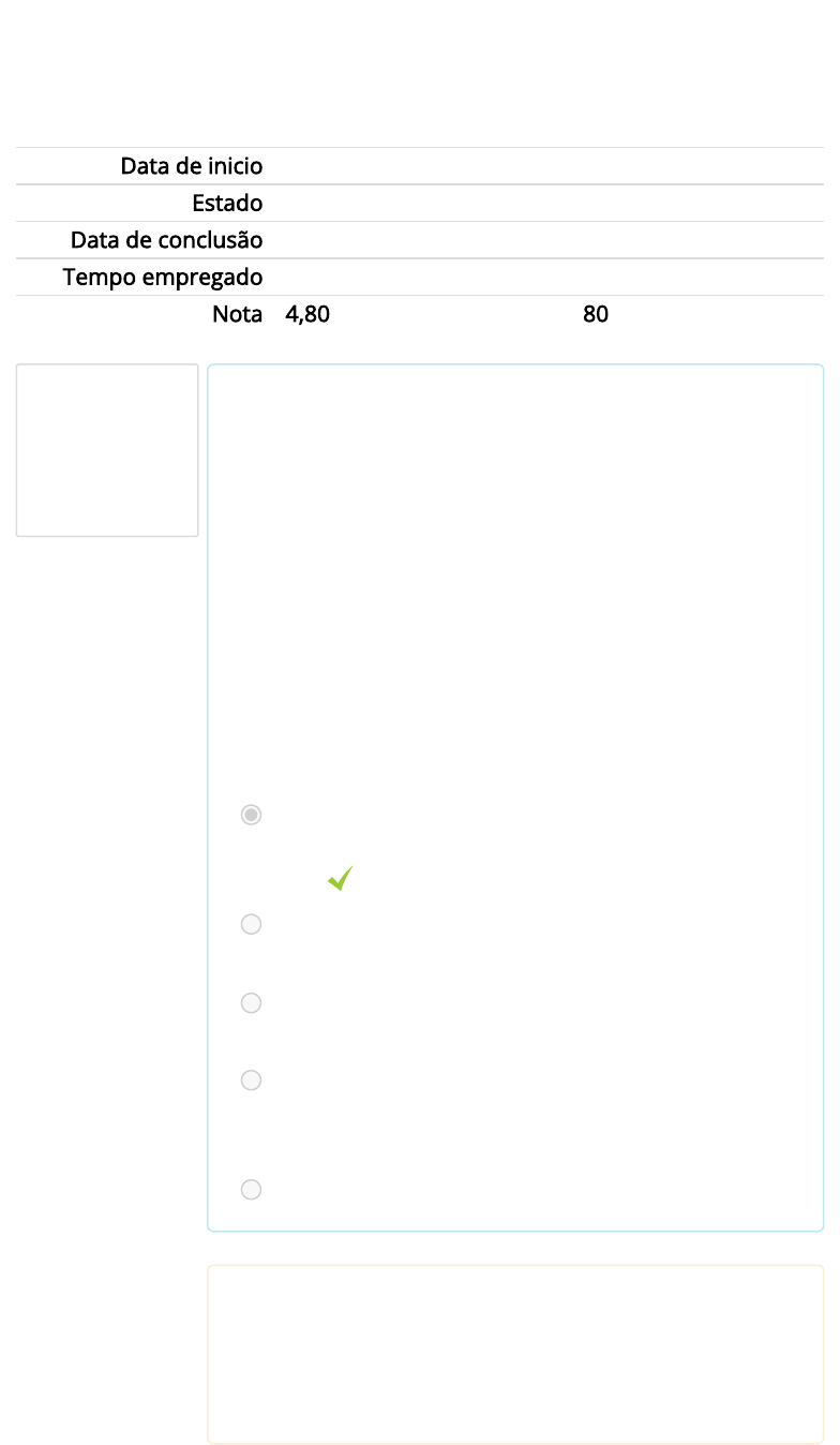 Questão 1 Correto Atingiu 0,60 de 0,60 Análise de Projetos de Investimentos de Capital ► AVALIAÇÃO ► PROVA Data de inicio domingo, 1 Out 2023, 21:44 Estado Finalizada Data de conclusão domingo, 1 Out 2023, 22:57 Tempo empregado 1 hora 13 minutos Nota 4,80 de um máximo de 6,00(80%) A empresa MIX encerra o período de atividade com os seguintes saldos nessas contas: ● Lucro Bruto: R$117.250,00 ● Vendas: R$126.789,00 ● Lucro Líquido: R$92.444,00 ● Patrimônio Líquido: R$105.000,00 Assinale a alternativa que indica os índices que correspondem à lucratividade e à rentabilidade dessa empresa: Escolha uma: a. A margem líquida é de 0,73 e o retorno sobre o patrimônio líquido dos acionistas é de 0,88. b. O retorno sobre o investimento é de 0,92 e a margem líquida é de 0,73. c. A margem bruta é de 0,92 enquanto a margem líquida é de 0,79. d. O retorno sobre o patrimônio líquido dos acionistas é de 0,88 e o retorno operacional é de 0,79. e. Nenhuma das alternativas está correta. Sua resposta está correta. A resposta correta é: A margem líquida é de 0,73 e o retorno sobre o patrimônio líquido dos acionistas é de 0,88.. https://moodle.universoead.com.br/course/view.php?id=361 https://moodle.universoead.com.br/mod/quiz/view.php?id=11108 Questão 2 Correto Atingiu 0,60 de 0,60 A criação das planilhas eletrônicas facilitou a elaboração e a correção de cálculos complexos. Sobre a utilização �nanceira das planilhas eletrônicas, assinale a alternativa INCORRETA: Escolha uma: a. Na função PPGTO, o valor das amortizações é crescente. b. Ao representar o �uxo de caixa nas planilhas eletrônicas, os investimentos devem ser representados com sinais positivos. c. Com a função de valor presente, é possível encontrar o valor atual de uma série de pagamentos futuros. d. A função TAXA permite encontrar a taxa de juros que é cobrada em um período desde que as parcelas sejam de acordo com o sistema PRICE. e. Nenhuma das alternativas está correta. Sua resposta está correta. A resposta correta é: Ao representar o �uxo de caixa nas planilhas eletrônicas, os investimentos devem ser representados com sinais positivos.. Questão 3 Correto Atingiu 0,60 de 0,60 São utilizadas diversas técnicas matemáticas que avaliam as opções reais. Sobre as técnicas mais utilizadas, assinale a alternativa correta: Escolha uma: a. As equações diferenciais são um método muito extensivo e por isso �cam distantes da aplicação prática. b. A simulação de Monte Carlo não é muito indicada para avaliar relacionamentos complexos entre o valor da opção e o ativo objeto. c. A programação dinâmica faz uma avaliação intuitiva e transparente dos objetos de avaliação. d. O método da simulação de Monte Carlo é uma das técnicas mais recomendadas para análise de opções do tipo americano. e. Nenhuma das alternativas está correta. Sua resposta está correta. A resposta correta é: A programação dinâmica faz uma avaliação intuitiva e transparente dos objetos de avaliação. . Questão 4 Correto Atingiu 0,60 de 0,60 A análise pelo método de Monte Carlo resulta também em grá�cos que permitem visualizar as simulações. Sobre o diagrama de dispersão de Monte Carlo, assinale a alternativa INCORRETA: Escolha uma: a. Os resultados que são encontrados pelo modelo mostram, além o que poderia ocorrer, a probabilidade de cada ocorrência; b. As combinações realizadas pelo modelo são ilimitadas. c. Esse método de análise ainda é pouco utilizado no Brasil. d. Cada projeto tem uma relação com cada um dos quadrantes do diagrama. e. O diagrama de dispersão de Monte Carlo permite que sejam relacionadas duas variáveis distintas. Sua resposta está correta. A resposta correta é: As combinações realizadas pelo modelo são ilimitadas.. Questão 5 Correto Atingiu 0,60 de 0,60 Em relação ao método de avaliação payback, julgue as a�rmativas e assinale a alternativa CORRETA: I. No método payback simples, a taxa mínima de atratividade utilizada é nula. II. O cálculo do payback simples é utilizado apenas para planejamentos de curto prazo, pois caso contrário pode causar resposta errônea. III. O payback adota remuneração mínima do capital investido e busca saber o tempo de recuperação do investimento. IV. O payback só pode ser obtido em projetos que têm lucros operacionais constantes. Escolha uma: a. Somente as a�rmativas I, e II estão corretas. b. Somente as a�rmativas I, II e IV estão corretas. c. Nenhuma das alternativas está correta. d. Somente as a�rmativas I, II e III estão corretas. e. Somente as a�rmativas I, e IV estão corretas. Sua resposta está correta. A resposta correta é: Somente as a�rmativas I, e II estão corretas.. Questão 6 Incorreto Atingiu 0,00 de 0,60 Determinada empresa faz a aquisição de uma máquina com vida útil de cinco anos pelo valor de R$160.000,00. O valor residual dessa máquina ao �nal da vida útil é de R$10.000,00 e a taxa de mercado �nanceiro é de 10% a.a. Considere as seguintes assertivas: ( ) A quota anual de depreciação pelo método linear é de R$30.000,00. ( ) A quota anual de depreciação pelo método da soma dos dígitos é de R$30.000,00. ( ) A quota de depreciação do terceiro ano pela soma dos dígitos é de R$30.000,00. ( ) a quota de depreciação anual do fundo de amortização é de R$24.659,62. A alternativa que indica a sequência correta é: Escolha uma: a. Nenhuma das alternativas está correta. b. V, F, V, V. c. V, F, F, V. d. F, V, F, F. e. F, V, V, V. Sua resposta está incorreta. A resposta correta é: V, F, V, V.. Questão 7 Correto Atingiu 0,60 de 0,60 A moeda é indispensável nas transações �nanceiras pois facilita a produção, a circulação e a comercialização de bens e serviços. Sobre as funções da moeda, é correto a�rmar que: Escolha uma: a. Nenhuma das alternativas está correta. b. Quanto maior a in�ação de um p