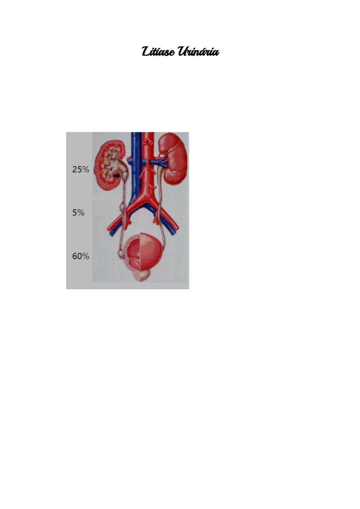 Litíase Urinária ● Introdução: ○ frequente no trato urinário ○ 1 a 5% da população adulta ○ 3 homens / 1 mulher ○ cristais de cálcio 80% ○ outros cristais (ácido úrico, triantereno, xantina, cistina) 20% ● Apresentação clínica: inicia com dor em região lombar que irradia para flancos e baixos ventres podendo chegar até os testículos. 25%- JUP - junção ureter com pelve renal 5%- Cruzamento com vasos ilíacos 60%- JUV - Junção uretereovesical ● Junção ureterovesical: Topografia da dor: dor em região lombar com irradiação para flancos e região de pequenos lábios ou testículos. ● Diagnóstico: ○ Sinais vitais: temperatura, hipotensão, taquicardia? ○ Inspeção: abaulamentos? ○ Palpação ○ Sinal da punho-percussão: Giordano +? ○ Sensibilidade testicular (homem) ● Diagnóstico diferencial: ○ cólica biliar ○ MIPA ○ cólica uterina ○ apendicite ○ pielonefrites ○ malformações renais (+ comum é a estenose de JUP) ● Exame complementares: ○ Urina tipo 1: ■ hematúria microscópica ou macroscópica ■ leucocitúria, bacteriúria ■ pH > 7,6: bactérias produtoras de urease ● pH alcalino + ITU + cálculo urinário = PROTEUS MIRABILIS ● hemograma, ureia, creatinina, potássio ● urocultura e antibiograma ● exames de imagem: RX, US e TC ○ RX de abdome: ■ baixa sensibilidade: 50 - 90% ○ USG: ■ pontos cegos para o ultrassom ■ ureter médio ■ ureter distal antes da JUV ■ bom para cálculo maior que 5 mm ■ baixo custo ■ acesso fácil ○ RX - Urografia excretora: ■ contraste iodado venoso ■ contraindicado com creatinina acima de 2 mg/dL ■ cólica renal recidivante ■ cólica renal nos últimos 30 dias ■ cirurgia urológica anterior ○ Tomografia computadorizada de abdome: ■ padrão - ouro ■ sem contraste ■ qualquer localização ■ qualquer tamanho ■ 96% de sensibilidade ■ 97% de especificidade ○ Urotomografia: ● IMPORTANTE: ○ Cálculos indinavir - Radiotransparentes: ■ diagnóstico pela USG - imagem hiperecogênica com sombra acústica e hidronefrose ● Apresentações clínicas e Tratamento: ○ 1- Cálculo ureteral ○ 2- Cálculo renal ○ 3- Litíase do trato urinário inferior ● Cálculo ureteral: ○ Tratamento conservador: ■ cálculos até 6 mm ■ terapia expulsiva medicamentosa ■ alfabloqueador para dilatação da JUV (tansulosina) ● Tamsulon, Secotex 1 cp 0,4 mg usados em HPB para melhora do fluxo urinário ■ intervenção em relação ao tamanho do cálculo: ● até 4 mm: 90% eliminação espontânea ● de 4 a 6 mm: 50% eliminação espontânea ○ Intervenção imediata: ■ alto grau de obstrução ■ risco de perda de função / rim único ● ITU por uropatia obstrutiva ■ Duplo J / nefrostomia percutânea Toda a urina produzida pelo rim atraves do duplo J, a urina consegue chegar na bexiga para ser eliminado. Em casos que o duplo J não consegue ser passado devido a obstrução, fazemos uma nefrostomia (punção, colocando um cateter da pelve até o cateter). ○ Ureterolitotripsina: Quando indicado, devemos tratar. Colocamos o cateter e tratamos o cálculo. ■ Indicação: ● cálculo obstrutivo com repercussão sistêmica (alteração da função renal) ● dor refratária ao tratamento ● falha da litotripsina extracorpórea ● fragmentos múltiplos obstruindo o ureter (“rua de cálculos” ou steintrasse) ● FALHA no tratamento clínico ■ Ureterolitotripsina a laser (cálculos maiores): ● litotripsina extracorpórea por ondas de choque ● até 1 cm ● ureter proximal e distal ■ Litotripsia extracorpórea por ondas de choque (fatores de sucesso): ● distância pele-cálculo < 10 cm ● cálculo < ou = 1 cm ● densidade < 1.000 UH (unidades Hounsfield) ■ Litotripsina extracorpórea por ondas de choque (contraindicação): ● distúrbios de coagulação ● gravidez ● suspeita de infecção ● obstrução a jusante ● hipertensão descontrolada ● aneurisma arterial próximo ao cálculo ■ Ureterolitotripsina laparoscópica: ● cálculos ureterais > 2 cm ● ureterolitotomia aberta convencional ● lembrem-se, o “segredo” é o DUPLO J ● Cálculo renal: ○ LECO (litotripsina extracorpórea): ■ cálculos até 2 cm de diâmetro, 1 cm no cálice inferior ■ complicações: hematúria, hematomas, cólica renal ○ Litotripsina extracorpórea por ondas de choque (contraindicação): ■ distúrbios de coagulação ■ gravidez ■ suspeita de infecção ■ obstrução a jusante ■ hipertensão descontrolada ■ aneurisma arterial próximo ao cálculo ○ Ureterorrenolitotripsia flexível: ■ cálculos no ureter proximal ■ cálculos renais: introduzimos o ureteroscópio flexível através de uma bainha ureteral até o rim ○ Nefrolitotripsia percutânea: ■ cálculos > 2 cm ou > 1 cm no cálice inferior ○ Cirurgia laparoscópica / robótica ○ Cirurgia aberta convencional ○ LEMBRE-SE: ○ Gestação - Duplo J ■ LECO contraindicada ○ Cálculo coraliforme ■ nefrolitotripsia percutânea - 85% ■ LECO - 40 a 60% ■ cirurgia aberta ou laparoscópica ○ Cálculos urinários na infância: ■ dor abdominal difusa e ITU - mais frequente ■ mesmo tratamento de adultos ● Análise metabólica: ○ Análise bioquímica do cálculo urinário ○ dosagem sérica de cálcio, fósforo, ácido úrico, creatinina ○ Urina 24 h: creatinina, cálcio, fósforo, ácido úrico, oxalato, citrato, pH, volume urinário. ● Hipercalciúria: ○ Reabsortiva: hiperparatireoidismo → paratireoidectomia ○ Absortiva: aumento da absorção intestinal → restrição de cálcio (400mg/d) e sódio (100 meq) ○ Renal - hipercalciúria renal: diuréticos tiazídicos (hidroclorotiazida e clortalidona) ● Hiperuricosúria (excesso de ácido úrico): ○ cerca de 10% ○ radiotransparentes ○ depende do pH ácido ○ 25% com gota e doença malignas ○ Tratamento: ■ hidratação (3 L por dia) ■ alcalinização da