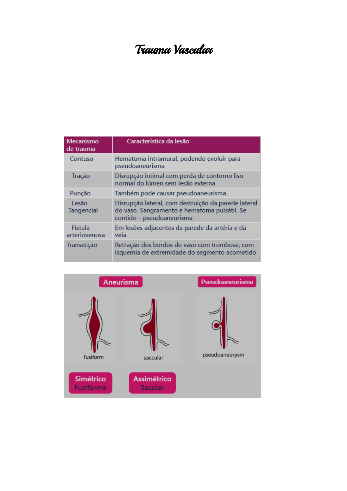 Trauma Vascular ● Introdução: ○ trauma vascular no politraumatizado alerta para outras lesões. ○ aumento das lesões por arma de fogo ○ melhora do serviço pré-hospitalar ● Etiologia: ○ trauma penetrante - 90% (arma branca e de fogo) ○ Arma branca - melhor prognóstico ○ trauma contuso - associado a fraturas ● Classificação das lesões vasculares pelo mecanismo de lesão: ● Aneurisma X falso aneurisma: → pseudoaneurisma: bloqueio inflamatório que forma um lesão ● Fístula arteriovenosa traumática: aumento do retorno venoso, causando uma isquemia do membro, que não tem a resistência vascular com aumento da pressão no vaso, podendo ter sopro e frêmito no membro. ● Trauma vascular: ○ Exame primário: ■ A - vias aéreas com cervical: ● lesão comprimindo via aérea? ■ B - Ventilação ● lesão vascular torácica? ■ C Circulação ● reposição da volemia ● para o sangramento ● compressão externa (torniquete?) ● IMPORTANTE: ○ Torniquete: ■ amputação traumática ■ hemorragia fora de controle ● tempo máximo = 1 hora ● Trauma vascular: ○ Exame secundário: ■ Elementos propedêuticos no exame secundário ■ Sd tumoral - hematoma pulsátil ● Conduta: ○ pacientes estáveis: ■ Arteriografia: → pseudoaneurismas com stent ■ Angiotomografia: ■ Doppler - fístula arteriovenosa: ○ sem sangramento ativo ○ sem sinais de isquemia aguda ○ conduta = exames complementares ● CAI NA PROVA: ○ Dispensa exames de imagem - cirurgia imediata: ■ sangramentos maciço ■ hematomas pulsáteis ■ hematomas expansivos ■ sintomas isquêmicos agudos ■ cirurgia indicada por outro motivo ● Continuação - Conduta do trauma vascular: ○ princípios técnicos ○ controle do sangramento ○ prevenir isquemia com reparo rápido ○ diagnóstico preciso (previne fístula arteriovenosa - pseudoaneurisma) ○ princípios cirúrgicos - controle e exposição ■ acesso ao sítio da lesão ○ Tática cirúrgica: ■ ressecção com anastomose terminoterminal ■ ressecção com interposição de enxerto ● veia safena invertida ● enxertos sintéticos (PTFE ou Dacron) ■ shunts intralumminais temporários: até 6 horas ● Tratamento cirúrgico - lesão arterial: ● Lesões vasculares específicas: ○ Cervicais: ■ oclusão completa da carótida - hemiplegia ■ carótida comum e carótida interna - reparo ■ carótida externa - pode ser ligada ■ veia jugular interna - preferencialmente reparo ■ veia jugular externa - pode ser ligada ○ Torácicas: ■ lesões graves - 10% chega com vida em hospital ○ Ruptura traumática de aorta: ■ lesões incompletas ■ próximos a ligamento arterial (botalho) ■ hematoma restrito ao mediastino ■ alto índice de suspeita no raios x ● Pegadinha: ○ Achados radiológicos da ruptura traumática de aorta: ■ alargamento do mediastino ■ obliteração do cajado aórtico ■ desvio da traqueia para a direita ■ obliteração do espaço entre a artéria pulmonar e a aorta ■ rebaixamento do brônquio-fonte esquerdo ■ desvio do esôfago (sonda nasogástrica) à direita ■ alargamento da faixa paratraqueal ■ alargamento das interfaces paraespinais ■ fratura do primeiro e do segundo arcos costais e/ou escápula ● Ruptura traumática de aorta: ○ Mecanismo e lesões: ● Continuação das lesões vasculares específicas: ○ Abdominais: ■ difícil resolução ● artéria mesentérica superior ● veia cava retro-hepática ■ grande importância: hematoma retroperitoneal ■ manobra de pringle: ● UP DATE: ○ Cava retro hepática - shunt átrio caval ● Hematoma retroperitonial: ○ Zonas de hematomas retroperitoneais: zona C ou zona 3: não abordamos. ○ Manobra de Kocher: ○ Manobra de Cattell: ● Continuação - lesões vasculares específicas: ○ Extremidades: ■ trauma penetrante ■ trauma contuso (fraturas) ■ diagnóstico ■ estabilidade do paciente ■ alinhamento de fraturas ■ hemorragia externa ■ reparo cirúrgico: ● sutura primária ● próteses ● shunts temporários ■ Dispensam exames complementares: ● sangramentos maciço ● hematomas pulsáteis ● hematomas expansivos ● sintomas isquêmicos agudos ● cirurgia indicada por outro motivo ○ Síndrome do compartimento: ■ Dor intensa ■ estiramento do compartimento ■ pulso ausentes em fases tardias ■ medida do compartimento > 35 mmHg ● IMPORTANTE: ○ Rabdomiólise: ■ lesão muscular - mioglobina ■ eliminação renal - mioglobinúria ■ hipercalcemia ■ hiperpotassemia (possibilidade de arritmias) ■ hiperfosfatemia ■ acidose metabólica ■ Tratamento: fasciotomia