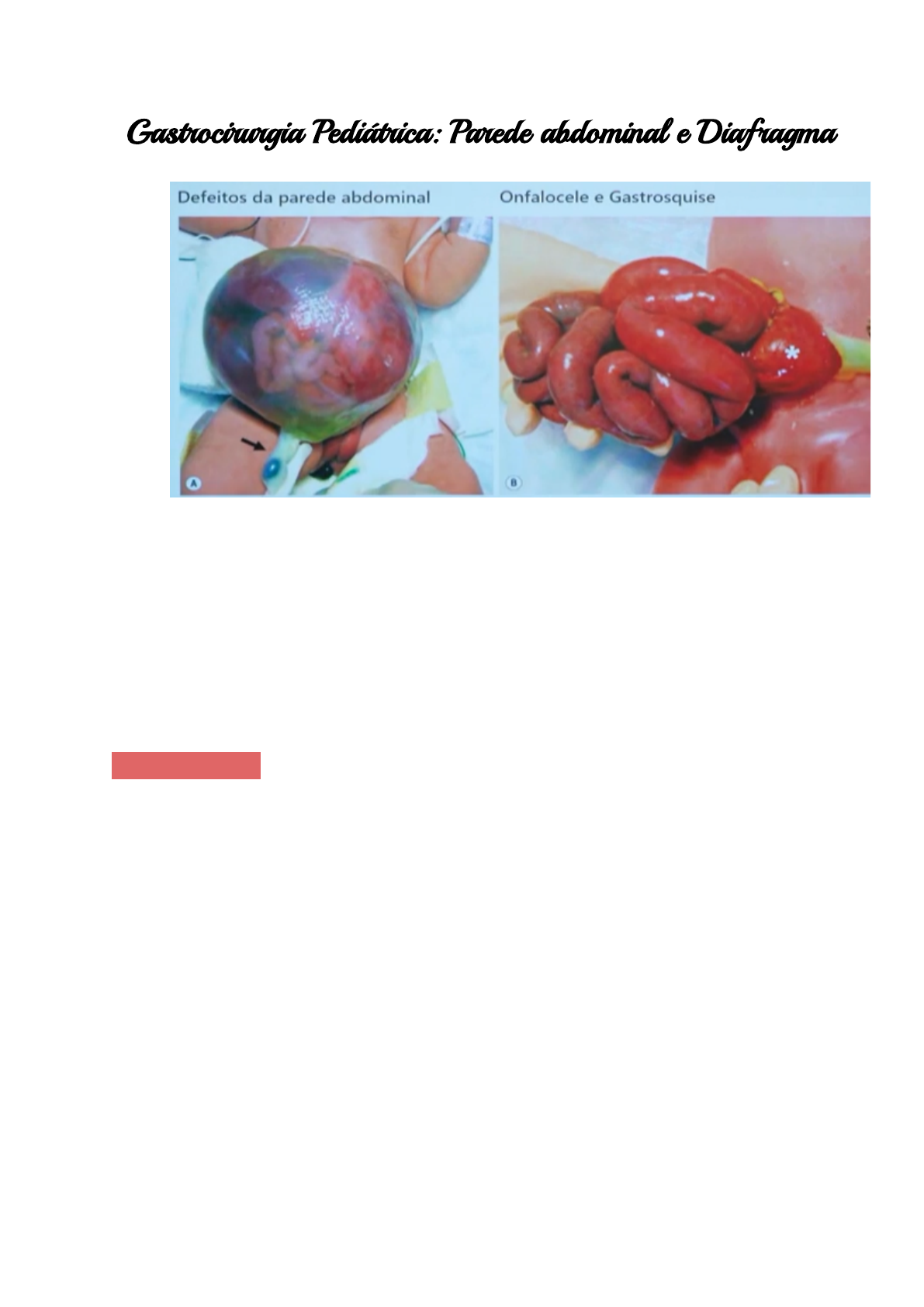 Gastrocirurgia Pediátrica: Parede abdominal e Diafragma ● Onfalocele e Gastrosquise: ● Defeitos da parede: ○ Embriologia / Etiologia: ■ 4ª semana de gestação: dobramento dos folhetos craniocaudal e mediolateral ■ 6ª semana: rápido crescimento intestinal e hepático leva à herniação umbilical ■ 10ª semana: retorno para cavidades e fixação duodeno e cólon no retroperitônio ■ Onfalocele: não retorna para cavidade ■ Gastrosquise: falha na formação do folheto anterior - lateral (d) Gastrosquise ● IMPORTANTE: ○ Gastrosquise: ■ 1: 4.000 nascidos vivos ■ mãe jovem, condição socioeconômica baixa, tabagismo, parto prematuro 28% x 6%, diagnóstico 20ª semana, AFP (alfafetoproteina) aumentada. ■ Programar parto pelo espessamento de alça; exposição da alça no líquido amniótico (interleucina 6,8 e ferritina aumentados) ■ Anomalia associada: atresia intestinal 6,9 - 28% ■ Estudos recentes: anomalias associadas - cardíaca, pulmonar e anomalia cromossômica. ● Gastrosquise: ○ Cuidados no perinatal: ■ parto vaginal x cesariano: indicação obstétrica ou sofrimento fetal ■ Parto prematuro: menor exposição ao líquido amniótico (interleucina 6,8 e ferritina elevados) - dano às células, marca-passo e plexo nervoso. ○ Depois do nascimento devemos cuidar da seguinte maneira: ■ Grande perda de água por evaporação (cavidade abdominal aberta e exposição de alças intestinais) ■ Acesso venoso e sonda nasogástrica ■ Proteger as alças da perda de líquido e de calor ■ Decúbito lateral direito - kinking do mesentério ■ Observar as alças - atresia, necrose ou perfuração. 1- atresia com sinal de necrose associada na alça 2- atresia, porém sem presença de necrose. ● Manejo Cirúrgico da Gastrosquise: ○ Objetivo: colocar as alças para dentro minimizando traumas e evitando aumento da PIA (pressão intra abdominal). ○ Cirurgia assim que nasce ○ Fechamento primário: atenção para a PIA (10 - 15 mHg diminuição da perfusão renal e intestinal // > 20 mmHg isquemia renal e intestinal) → SILO ○ Fechamento por etapas (SILO) 1 - 14 dias. ○ 10% atresia intestinal associada: jejunal ou ileal. ● Pós operatório e Complicações da Gastrosquise: ○ Pós-operatório: ■ motilidade e absorção alimentar anormais - demora para introdução alimentar. ○ Complicações: ■ intestino curto, doença hepática (uso prolongado NPP), enterocolite necrotizante 18,5% ■ atenção ao reparo: até 60% das crianças têm estresse psicossocial pela falta do umbigo. Onfalocele ● Introdução: ○ manejo pré-natal ○ diagnóstico: US 2D 18 semanas (caso 3D pode ser diagnosticado antes) ○ detecta anomalias associadas também pela USG ■ cardíaca (14 - 47%) ■ SNC (3 - 33%) ○ Algumas medidas podem ser úteis, mas nada comprovado: O/circunferÊncia abdominal, O/circunferência do fêmur ou O/circunferência da cabeça. ● IMPORTANTE: ○ Onfalocele: ■ Manejo perinatal: ● parto: indicação obstétrica ● triagem de malformações associadas: ○ ECO, US abdome total e rins e vias urinárias, hipoglicemia (Sd. Becjwith - Wiedemann), laboratótio. ● cobrir o defeito com gaze e solução salina, além de evitar perda de água e calor (impermeável), SNG ■ Manejo Cirúrgico: ● muitas técnicas diferentes: fechamento estagiado ou fechamento postergado. ● Onfalocele gigante: tamanho, presença do fígado, quantidade de alças? ● Fechamento primário (assim que possível - descartadas anomalias associadas) ○ menor que 1,5 cm (hérnia de cordão) ● Fechamento postergado: flaps de pele, SILO. ● Fechamento estagiado: perda de domicílio, auxílio de telas biológicas Proteção por uma capa, que armazena alça intestinal e resquícios do fígado. ● Tratamento não operatório: ○ Escarificação: agentes que permitem escarificação no saco amniótico → epitelização com o tempo → hérnia ventral → correção posterior. ○ Defeito muito grandes para fechamento primário ou cardiopatia / pneumopatia importante associada - Sd. Compartimental ou ausência de pele suficiente. ○ Substâncias: mercurocromo, álcool, nitrato de prata (todos muito efetivos, porém tóxicos) → sulfadiazina de prata, iodopovidona, curativos com prata, neomicina, bacitracina. 4 - 10 semanas, com curativos compressivo. ○ Hérnia ventral (1 - 5 anos), expansor de tecido, uso de telas. ● Pós-operatório da Onfalocele: ○ Avaliar o retorno do trânsito intestinal para iniciar dieta, antibiótico 48 h, observar infecção de ferida operatória. ○ Podem evoluir com: DRGE, insuficiência pulmonar, infecção pulmonar de repetição, asma, dificuldade em alimentar (60% nas onfaloceles gigantes) ● Descomplicando: Defeito Diafragmático 1- Hérnia diafragmática congênita ● Introdução: ○ Doença congênita de incidência rara, grandes centros atendem 10 por ano, manejo e tratamento continuam um desafio: mortalidade significativa e sequelas. ○ Morbimortalidade: hipoplasia pulmonar e hipertensão pulmonar ○ ECMO, ventilação de alta frequência, hipercapnia permissiva → aumento da sobrevida (50 - 90%) ● Epidemiologia: ○ 2,4 : 10.000 nascidos vivos ○ ⅓ morrem assim que nascem (anomalias associadas) ○ HDC isolada - maioria do sexo masculino ○ 80% do lado esquerdo ○ bilateral raro: geralmente associado a anomalias ○ mães abaixo do peso ○ esquerdo: Bochdalek ○ anterior: Morgagni ● Etiologias: ○ Genética: ■ associação com mais de 70 síndromes ● defeito principal: Sd Fryns e Donnai-Barrow ● alguns casos de Beckwith-Wiedemann ○ Anomalias associadas: ■ aproximadamente 50% são defeitos isolados ■ cardiovascular 50%, urogenital 17,7%, musculoesquelético 15,7% e SNC 9,8%. ■ consequências da hérnia: hipoplasia pulmonar, má rotação intestinal, malformação cardíaca e ducto arterioso patente. ■ cardíaco: lesão importante co 8% de sobrevida, lesão menor com 67%, se