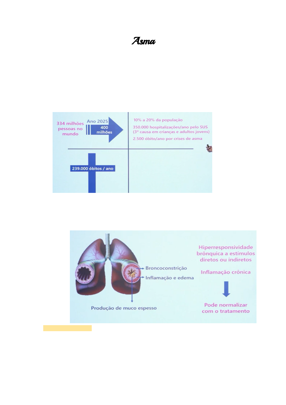 Asma ● Definição de Asma segundo Gina 2021: ○ Asma é uma doença inflamatória crônica das vias aéreas, na qual muitas células e elementos celulares têm participação. A inflamação crônica esta associada a hiperresponsividade das vias aéreas, que leva a episódios recorrentes de sibilos, dispneia, opressão torácica e tosse, particularmente à noite ou no início da manhã esses episódios são uma consequência da obstrução ao fluxo aéreo intrapulmonar generalizada e variável, reversível espontaneamente ou com tratamento. ● Epidemiologia da asma: ● Fisiopatologia: ○ múltiplas células inflamatórias ○ padrões diversos, bem como a clínica ○ inflamação crônica → persiste mesmo quando sintomas são episódios ○ Parênquima pulmonar não afetado = doença de via aérea. ● CAI NA PROVA: ○ Diagnóstico: ■ clínico e funcional → espirometria pode ser normal no paciente asmático. ● Quadro clínico: ○ DISPNEIA + TOSSE + SIBILÂNCIA ○ podem melhorar espontaneamente ○ melhora total / parcial espontaneamente ○ opressão / desconforto torácico ○ piora com exposição a alérgenos ○ sintomas: noturnos / primeiras horas do dia ○ período intercrise: ■ assintomático / oligossintomático ● Diagnóstico: ○ Antecedentes: ■ início de sintomas respiratórios na infância ■ rinite = 80% dos asmáticos tem RA ■ história familiar de asma ou alergias ● Espirometria: ○ Diagnóstico: ■ demonstrar limitação ao fluxo de ar (obstrução da via aérea) e ou resposta ao BD (broncodilatador) ○ Avalia gravidade da obstrução: pior VEF1 > exacerbação ○ Acompanhamento e resposta ao tratamento (3/6 meses após início do tratamento) ○ Pode ser normal - remissão ● Curva fluxo-volume: ○ Achados na asma: ■ Sinais de obstrução: VEF1 / CVF e VEF1 ■ Resposta positiva após broncodilatador: aumento - 7% e 200 ml no VEF1 e/ou CVF; GINA utiliza 12%. ● Teste de Broncoprovocação: ○ Inserimos uma substância que vai causar uma irritação/provocação nos brônquios, causando uma queda do VEF1 e ser for uma queda < 20% é dito como POSITIVO e confirma a ASMA. ○ A queda do valor do VEF1 (volume expiratório forçado no 1º minuto da espirometria) > ou = 20% em qualquer etapa infere teste de broncoprovocação positivo e define a interrupção do exame. ● Pico do Fluxo Expiratório (PFE): ○ Mede, de forma longitudinal, o grau diurno de obstrução da vias aéreas e sua instabilidade ○ Em fase estável, não há variação ○ Flutuação indica asma não controlada. ○ PFE seriado em 10 - 14 dias ■ se PFE maior-menor / média: > ou = 20% para adultos; > ou = 30% para crianças. ● Radiografia de tórax: ○ NÃO SERVE PARA FAZER DIAGNÓSTICO DE ASMA ○ Normal ○ Hiperinsuflação: ■ retificação de costelas ■ aumento dos espaços intercostais ■ retificação do diafragma ○ espessamento de paredes brônquicas ○ pequenas áreas de atelectasias (diferenciando da pneumonia) ○ raio x tórax inespecífico: excluir outros diagnósticos ● Exame físico do paciente asmático: ○ FTV: normal ou diminuído ○ Percussão: normal ou hipersonoridade ○ MV: diminuído, roncos e sibilos expiratórios. ○ Na ausência de sibilos não exclui o DX, mesmo na exacerbação. ● Diagnóstico diferencial: ○ DPOC versus ASMA BRÔNQUICA: ● Fluxograma: ● UP DATE: ○ Adultos e adolescentes (> 12 anos): ● Dose baixa, média e alta de corticosteróides inalados: ● Remédios para asma: LABA: Broncodilatador de longa duração. ● Avaliando o nível de controle: Sintomas ○ Memorize: “De Li Si A” ■ De: despertar noturno ■ Li: limitação de atividades físicas ■ Si: sintomas ■ A: utilização de medicação para alívio ● Reavaliar tratamento a cada 3 meses: ○ Escalonar, se necessário: ■ sintomas não controlados ou exacerbações ■ rever técnica e adesão antes ○ Descalonar, se possível: ■ sintomas controlados por 3 meses ■ baixo risco de exacerbações ■ não suspender ICS ● IMPORTANTE: ○ Gravidade da asma: avaliada pela medicação usada → leve, moderada e grave. ○ Controle da asma: avaliado de acordo com sintomas nas últimas 4 semanas (GINA) → controlada, parcialmente controlada e não controlada. ● Crise de Asma: ○ Definição: episódio agudo ou subagudo de piora progressiva da falta de ar, chiado, tosse e aperto no peito. ○ Causas: ■ tratamento irregular ■ infecção viral ■ exposição a alérgenos / irritantes ■ comorbidades: apneia do sono, DPOC, etc. ○ Clínica: ■ agitação ■ fala entrecortada ■ taquipneia ■ tempo expiratório prolongado ■ inclinação para a frente com ombros elevados ■ uso da musculatura acessória ■ sibilos - principalmente expiratórios ■ roncos - muco ■ MV diminuídos ou ausentes ○ Exacerbações: ■ avaliação clínica rápida ■ adultos (espirometria, pico de fluxo expiratório) ■ oximetria de pulso ■ exames com elementares: normalmente são dispensáveis ○ Gravidade da crise de asma: ○ Fluxograma para a Crise de asma: ○ Outros medicamentos usadas nas crises de asma: ■ oxigênio: manter SpO2 entre 93 - 95% ■ beta-2-agonista EV ou SC (terbutalina ou salbutamol): sem evidências para uso (A). Muita taquicardia e tremores. ■ Adrenalina: IM crise de asma com anafilaxia. Não deve ser usado rotineiramente ■ Corticoide oral é tão efetivo quanto EV: mais barato, mais rápido e menos invasivo. Preferencialmente usado na primeira hora. ■ Ipratrópio (Atrovent): crise moderada ou grave, sem resposta adequada às condutas inicias (antimuscarínicos) ■ Aminofilina e teofilina: não devem ser usadas pelo alto risco de efeitos colaterais, além de não apresentarem benefício em comparação ao SABA sozinho. ■ Sulfato de magnésio: usado para pacientes graves e crises graves recorrentes. Paciente com PFE ou VEF1 < 30%, 2g EV em 20 minutos. ■ antileucotrienos: EV ou VO, pode melh