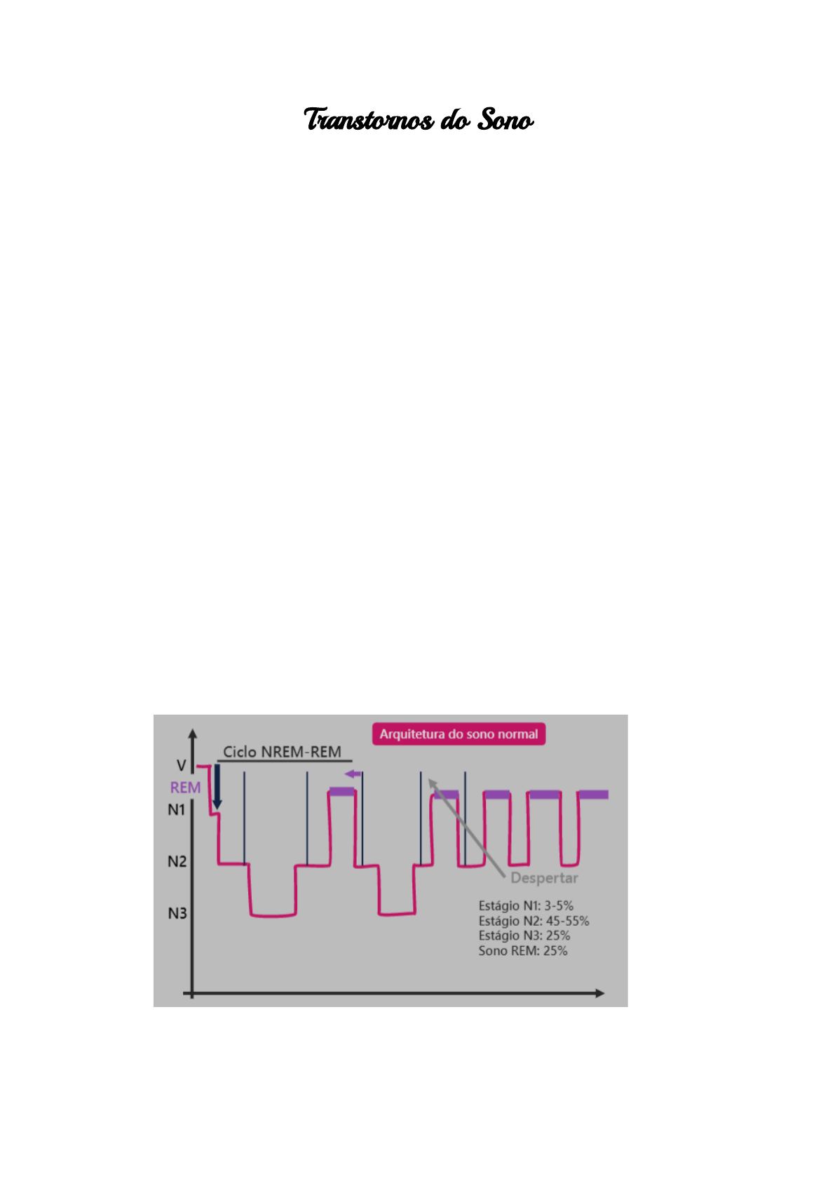 Transtornos do Sono ● Sono normal: ○ sono é um estado comportamental único representado por uma alteração temporária do nível de mobilidade, motricidade e principalmente pelo nível de consciência. O sono se diferencia do estado de coma e da anestesia profunda devido a sua pronta e total reversibilidade. ● Estágios do sono: ○ Sono sincronizado ou sono NÃO REM, representa progressivamente a profundidade do sono: ■ N1: fase transitória e curta (5%) ■ N2: fase mais longa (45 - 55%) ■ N3: sono profundo ou sono de ondas lentas (25)% ○ Sono dessincronizado ou sono REM (25%) ● Sono NÃO REM: ○ estado de relativa inatividade do cérebro, em um sistema neuromuscular parcialmente inativo ○ caracteriza-se por atividade cerebral síncrona ○ redução do consumo energética, do metabolismo somático e da atividade do sistema nervoso central e autônomo ○ redução do tônus muscular ○ mínimo de atividade mental ○ não há sonhos ● Sono REM: ○ não é dividido em estágios e caracteriza-se pela dessincronização eletroencefalográfica ○ há movimentos oculares rápidos e atonia muscular ○ há ativação do SNA ○ relato de sonhos indicam atividade mental ● Hipnograma: ● Funções do sono: ○ não existe uma resposta única: ■ economia de energia e reversão de alterações metabólicas ■ secreção de hormônios somáticos ■ sono REM: aprendizagem, consolidação da memória, organização de informações ■ plasticidade neuronal ● Descomplicando: ○ Sistema ativador reticular ascendente: ○ Interruptor de sono-vigília: ○ Vigília: ○ Sono: ● Polissonografia (PSG): ○ Avaliação objetiva do sono e seus transtornos: ■ o registro classificado como nível 1 é o padrão ouro. Consiste no exame de noite inteira realizado em laboratório especializado, sob supervisão contínua e registro simultâneo de diversos parâmetros: ● EEG e ECG ● eletro-oculograma e eletromiograma ● fluxo aéreo (nasal e oral ● esforço respiratório (torácico e abdominal) ● saturação arterial de oxigênio ● ronco e posição corporal. ■ tempo total de registro ■ tempo total de sono ■ eficiência do sono (tempo total de sono / tempo total de registro): normal é maior que 85% ■ latência do sono NREM: normal é até 30 minutos ■ latência do sono REM: tempo entre o início do N2 e o início do primeiro sono REM: normal é de 70 - 120 minutos ■ porcentagem de distribuição das fases do sono ● IMPORTANTE: ○ Polissonografia: ■ índice: define o número de determinado evento por hora de sono ● microdespertares: duração entre 3 - 15 segundos. Normal é entre 10 - 15 / hora ● índice de apneias-hipopneias: número de pausas respiratórias por hora de sono (leve: 5 - 15 / h; moderada: 15 - 25 / h; grave > 50 / h) ● Teste de latências múltiplas do sono (TLMS): ○ exame para quantificação objetiva de sonolência diurna e para o diagnóstico de narcoplesia ○ consiste em 4 - 5 registros poligráficos feitos durante o dia, obtido em intervalos de 2 horas e duração de 20 minutos em cada registro ○ o paciente é orientado a “não resistir ao sono” ○ cada registro mede o tempo que o paciente demora para dormir; depois é calculado a latência média de sono e um valor inferior a 8 minutos é anormal ○ também detecta sono REM precoce Insônia ● Introdução: ○ A insônia é um transtorno caracterizado pela dificuldade de iniciar ou manter o sono, ou ainda pela insatisfação com a qualidade do sono, resultando em sintomas diurnos, físicos e emocionais, com impacto no desempenho das funções sociais e cognitivas. ● Classificação das insônias: ○ insônia aguda ou transitória: há um fator precipitante causal e identificável, duração de dias ou, no máximo, 3 meses ○ transtorno da insônia: duração mínima de 3 meses, não sendo causado por transtorno mental, neurológico ou clínico, pelo uso de medicações, pelo abuso de substâncias ou por higiene do sono inadequada. ○ insônia inicial: dificuldade para iniciar o sono com duração maior que 30 minutos (relaciona-se com TAG) ○ insônia de manutenção: caracterizada por despertares durante a noite, de curta ou longa duração (relaciona-se com apneia do sono) ○ insônia terminal: quando há despertar precoce (relaciona-se com depressão) ○ comumente, as três formas de insônia podem coexistir no mesmo paciente ● Etiopatogenia do transtorno da insônia: ● Insônias sintomáticas: ○ define-se quando o sintoma insônia ocorre paralelamente a outras condições médicas e ambientais, os quais tem participação importante na manutenção da insônia: ■ transtornos mentais (depressão, ansiedade generalizada) ■ higiene do sono inadequada ■ dores crônicas ■ uso de substâncias e medicamentos ■ outros transtornos do sono ● Transtornos do ritmo circadiano e SPI: ○ atraso de fase do sono: incapacidade persistente para adormecer e acordar com horários convencionais, com início do sono e despertar atrasados 3 - 6 horas relativamente aos tempos de vigília e sono habituais ○ fase avançada do sono: caracterizada por horários de sono 3 horas mais cedo do que estabelece a sociedade. Pode ser confundido com insônia terminal ○ síndrome das pernas inquietas (SPI): manifestações sensitivas desagradáveis que acometem principalmente os MMII, antes do adormecer e que dificultam o início do sono. ● CAI NA PROVA: ○ Síndrome da apneia - Hipopneia obstrutiva do sono (SAHOS): ■ desordem com períodos de apneia e hipopneia obstrutivas, causadas por colapso repetitivo das vias aéreas superiores durante o sono ■ consequências: hipercapnia, hipoxemia e fragmentação do sono ■ fatores de risco: obesidade, homens, idade avançada, pescoço largo, estreitamento das vias aéreas (retrognatia, micrognatia), tabagismo, história familiar ■ clínica: sonolência excessiva diurna, fadiga, roncos ou períodos de apnei