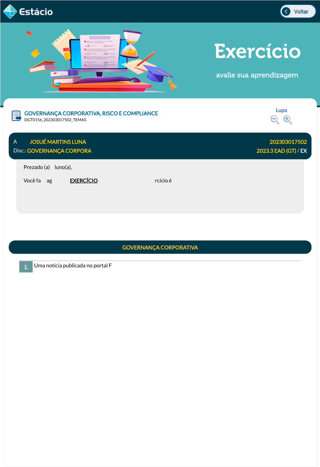 02/10/2023, 09:27 Estácio: Alunos https://simulado.estacio.br/alunos/ 1/6 Exercício avalie sua aprendizagem Uma notícia publicada no portal FGV pelo professor da Escola Brasileira de Educação Pública e de Empresas, professor Joaquim Rubens Fontes Filho, sobre economia no tempo de COVID-19, destaca: "Governança corporativa tem papel fundamental em tempos de crise". "É importante que controladores, conselheiros e administradores tenham um bom canal de relacionamento explicando claramente a sociedade e seus pequenos acionistas o que está ocorrendo e o que está sendo feito para melhorar a situação da empresa pelo menos no médio prazo", Joaquim Rubens destaca que, nesse momento a governança corporativa assume um papel fundamental, pois trata da relação entre os sócios e com a própria sociedade. Ele lembra de dois grupos importantes nessa estrutura. O primeiro deles são os pequenos investidores, que, com menos possibilidade de diversi�carem suas aplicações, serão severamente impactados pela crise. Ele destaca que a saída desses agentes pode trazer problemas de liquidez para as empresas, que terão muito mais di�culdades de captar recursos. Outro grupo importante são os empregados, que fazem parte do conjunto fundamental de stakeholders de uma empresa. "Governança corporativa signi�ca equidade de tratamento dos sócios e transparência nas relações. É importante então que controladores, conselheiros e administradores tenham um bom canal de relacionamento explicando claramente a sociedade e seus pequenos acionistas o que está ocorrendo e o que está sendo feito para melhorar a situação da empresa pelo menos no médio prazo", destaca. Disponível em https://portal.fgv.br/noticias/governanca- corporativa-tem-papel-fundamental-tempos-crise-destaca-especialista. acesso em 13/09/20 (adaptado) Sobre Governança Corporativa, analise os itens abaixo e assinale a única alternativa correta. I - Sistema que, usando principalmente o conselho de administração, a auditoria externa e o conselho �scal, estabelece regras e poderes para conselhos, comitês, diretoria e outros gestores, procurando prevenir abusos de poder e criando instrumentos de �scalização, princípios e regras que possibilitem uma gestão e�ciente e e�caz. II - As boas práticas de Governança Corporativa têm a �nalidade de aumentar o valor da sociedade, facilitar seu acesso ao capital e contribuir para sua perenidade. GOVERNANÇA CORPORATIVA, RISCO E COMPLIANCE Lupa DGT0156_202303017502_TEMAS Aluno: JOSUÉ MARTINS LUNA Matr.: 202303017502 Disc.: GOVERNANÇA CORPORA 2023.3 EAD (GT) / EX Prezado (a) Aluno(a), Você fará agora seu EXERCÍCIO! Lembre-se que este exercício é opcional, mas não valerá ponto para sua avaliação. O mesmo será composto de questões de múltipla escolha. Após responde cada questão, você terá acesso ao gabarito comentado e/ou à explicação da mesma. Aproveite para se familiarizar com este modelo de questões que será usado na sua AV e AVS. GOVERNANÇA CORPORATIVA 1. javascript:voltar(); javascript:voltar(); javascript:voltar(); javascript:voltar(); javascript:diminui(); javascript:diminui(); javascript:aumenta(); javascript:aumenta(); 02/10/2023, 09:27 Estácio: Alunos https://simulado.estacio.br/alunos/ 2/6 III - Sistema para recuperar e garantir a con�abilidade em uma determinada empresa para os seus acionistas, criando um conjunto e�ciente de mecanismos, tanto de incentivos como de monitoramento, a �m de assegurar que o comportamento dos executivos esteja sempre alinhado com o interesse dos acionistas, cujas ações serão executadas pelo Conselho de Administração. IV - Contribui para um desenvolvimento econômico sustentável, proporcionando melhorias no desempenho das empresas. Por estes motivos, torna-se tão importante ter conselheiros indicados pelo fundador, por questão de con�ança, independente da quali�cação, e sistemas de Governança Corporativa de qualidade, evitando-se assim diversos fracassos empresariais como abusos de poder, erros e fraudes. Em uma sociedade empresária foi realizada a análise SWOT, com isso, foi constatada uma crise sanitária (pandemia) capaz de provocar prejuízos �nanceiros em virtude da legislação que obrigou o fechamento das empresas por um longo período. Com base nesse diagnóstico da análise SWOT, pode-se a�rmar que se trata de um caso de Ética empresarial e governança corporativa são conceitos distintos, mas relacionados. Sobre eles podemos a�rmar que: Os itens I e II estão corretos. Os itens III e IV estão corretos. Apenas o item I está correto. Apenas o item II está correto. Os itens I, II e IV estão corretos. Data Resp.: 02/10/2023 10:15:13 Explicação: Sobre o conselho de administração, é um órgão deliberativo, não de execução; sobre a indicação dos componentes do conselho, estes devem ser pessoas quali�cadas, não por ser indicado pelo fundador, se for o caso. 2. oportunidade. fraqueza. força. compliance. ameaça. Data Resp.: 02/10/2023 10:16:03 Explicação: As ameaças representam os cenários alheios à organização que podem trazer-lhe algum tipo de risco ou danos. São aqueles produtos ou serviços ofertados por concorrentes que se assemelham às atividades da empresa. Elas também podem indicar as possibilidades de novos entrantes no mercado ou de novas regulações e leis. 3. Determinam os padrões de desempenho operacional, gestão centralizadora e consideram as prioridades organizacionais acima das demandas da sociedade. É uma ferramenta de gestão fundamental para a realização da análise ambiental, constituindo a base do planejamento estratégico das organizações. Visam o planejamento de longo prazo e abordam a responsabilidade dos níveis mais altos da administração em formular e reformular suas estratégias empresariais. Têm como objetivos demarcar os princípios que guiarão as ações a serem realizadas e em quanto tempo o resultado se