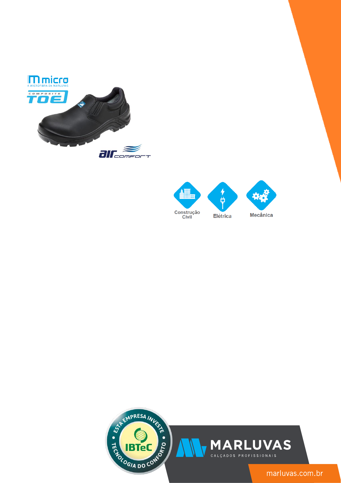 ESPECIFICAÇÃO TÉCNICA Cabedal Confeccionado em M Micro microfibra (microfilamentos de poliaramida poliéster e viscose, com fios termoligados e acabamento em PU) com espessura de 18 linhas. Contraforte Termoplástico 1,5mm Linha Em nylon 30 na cor cinza Biqueira Confeccionada em plástico polímero ultra-resistente, resistente a impactos de 200J e compressão de até 1500Kg (N), mais leve em cerca de até 51% às biqueiras de aço, não detectável por detectores de metal, são ainda antimagnéticas e anticorrosiva. Forro de Gáspea e Suador Em tecido não tecido de fibra curta com espessura mínima de 1,9mm; Palmilha de montagem Não tecido 100% poliéster, agulhado e resinado com espessura de 2.0 mm, costurada pelo processo strobel. Palmilha de limpeza Em EVA antifungo antibactéria acabamento em tecido não tecido três mm de espessura. Solado O solado é constituído de duas camadas de poliuretano (Pu) expandido bi-densidade, injetado diretamente no cabedal, sendo a 1º camada (entressola) mais macia e leve (densidade de 0,4g/cm3) proporcionando maior conforto, e a 2º camada (densidade 1,0g/cm3) é a mais resistente a objetos cortantes perfurantes e a abrasão pelo fato de ser a mais compacta. Nesta 2º camada o sistema antiderrapante é constituído de ranhuras especiais de 3mm de altura, 6mm de largura entre os desenhos de planta. Peso por pé de calçado 0,390kg Altura do cano 8,4cm Embalagem - Caixa coletiva para até 10 pares: C 414mm x L 315mm x A 505mm - Caixa coletiva para até 5 pares: C 565mm x L 300mm x A 245mm 70T19 C Tênis de segurança com fechamento em elástico nas laterais, confeccionada em M Micro e forração interna em tecido não-tecido, não contém componentes metálicos. Requerimento NBR ISO 20345:2015 Cor Preto Numeração PU Bidensidade 33 a 47 CA 34556 Validade: 36 meses Nota: A validade do equipamento se inicia pela data de fabricação gravada no calçado.
