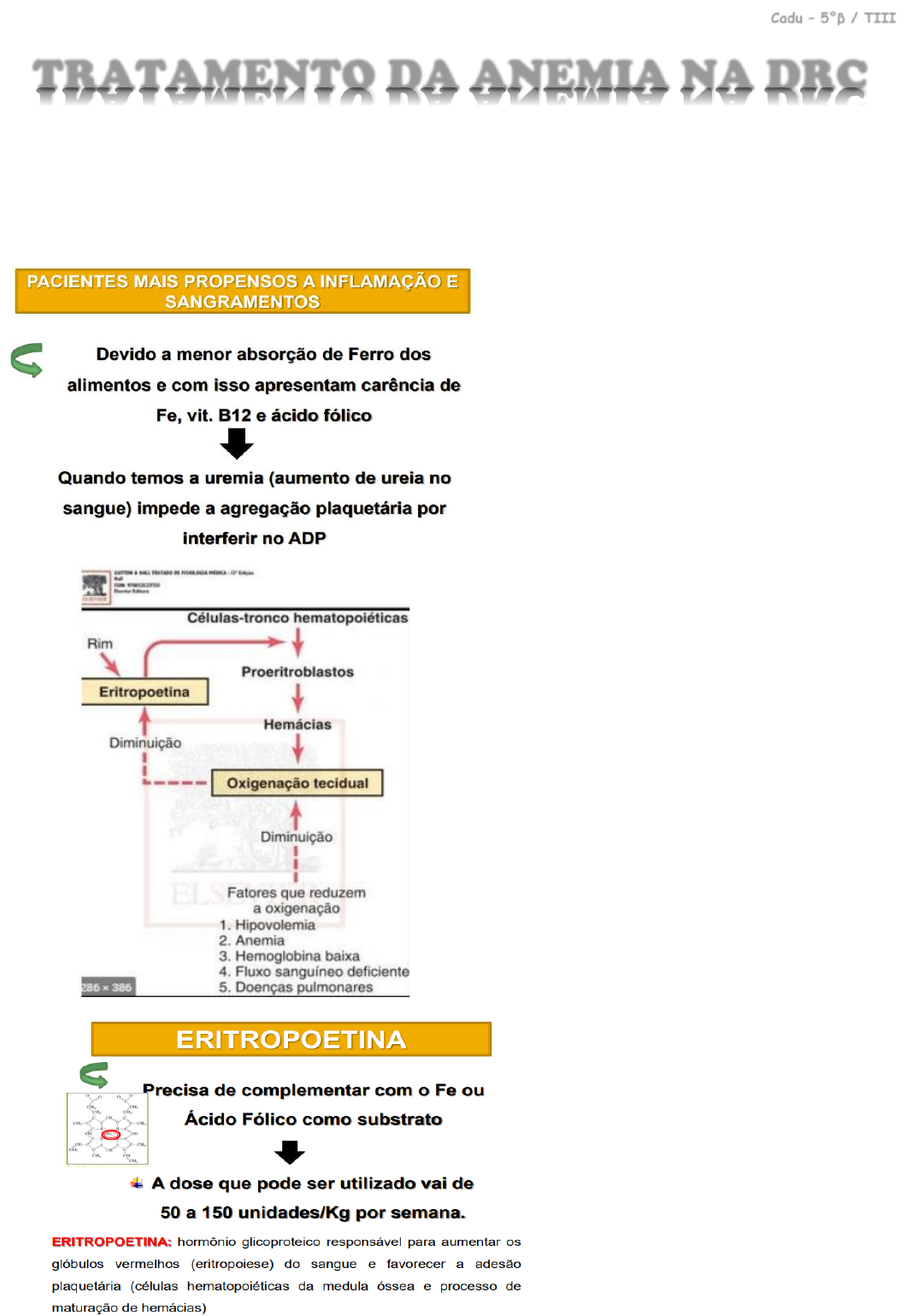 Cadu – 5°β / TIII • Precisa fazer reposição de eritropoetina, ác. fólico, vit. B12 e Fe. Precisa também saber os níveis de ferritina. • Prescrever alfaepoetina. TRATAMENTO DA ANEMIA NA DRC