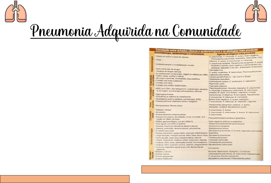 Maria Eduarda de Souza Trigo Fernandes – 7º Semestre Uma pneumonia consiste em uma inflamação do parênquima pulmonar, que corresponde à área do pulmão onde se dão as trocas gasosas, essenciais para a manutenção da vida. Pneumonia adquirida na comunidade (PAC) é a infecção do trato respiratório inferior causada por agentes adquiridos na comunidade ou com surgimento em até 48 horas após admissão hospitalar. Estão excluídos dessa definição aqueles que apresentam internação hospitalar por mais de 2 dias nos últimos 90 dias; residem em casa de repouso; receberam antibióticos endovenosos e/ou quimioterapia nos últimos 30 dias e tratam-se em clínicas de hemodiálise. Esses pacientes apresentam maior risco de infecção por germes multirresistentes e, por isso, serão abordados como pneumonia associada à assistência à saúde. No Brasil, a pneumonia afeta cerca de 2,1 milhões de brasileiros todos os anos, segundo dados do DATASUS. Com mais de 960 mil casos por ano, é a principal causa de internação hospitalar e a quinta causa de morte no Brasil em 2011. O custo das admissões hospitalares por PAC também é elevado, especialmente daquelas que requerem internação em UTI. ETIOLOGIA O avanço de métodos diagnósticos como PCR para múltiplos agentes e também a pesquisa de antígenos urinários aumentaram a capacidade de diagnóstico etiológico para até 80% dos casos de PAC e associada aos cuidados da saúde. Os agentes etiológicos variam de acordo com a localidade, características do paciente e gravidade da PAC. Streptococcus pneumoniae (bactéria, gram +) era o agente responsável por 95% dos casos de pneumonia. Apesar de permanecer como o principal agente causador dessa entidade, sua frequência decaiu após uso da vacina antipneumocócica para adultos e da pneumocócica conjugada para crianças, além da redução da taxa de tabagismo. Outras bactérias que causam PAC são Haemophilus influenza, Staphylococcus aureus, Moraxella catarrhalis, Pseudomonas aeruginosa e outros bacilos Gram-negativos. Os agentes atípicos, Mycoplasma pneumoniae e Chlamydophila pneumoniae, além das espécies de Legionella completam os principais agentes bacterianos das PAC. Algumas características do hospedeiro podem aumentar a chance de PAC por agentes específicos. FISIOPATOLOGIA A pneumonia resulta da proliferação dos patógenos microbianos nos espaços alveolares e da resposta do hospedeiro a esses agentes patogênicos. Os pulmões são constantemente expostos a partículas e microrganismos que estão presentes nas vias aéreas superiores e, por microaspiração, chegam ao trato respiratório inferior. O desenvolvimento da infecção indica deficiência da defesa do hospedeiro, exposição a agente altamente virulento ou inoculação excessiva do agente. Além da microaspiração, a disseminação hematogênica é outro mecanismo fisiopatológico presente, principalmente na infecção por Staphylococcus aureus. Quando essas barreiras são superadas ou quando os microrganismos são suficientemente pequenos para serem inalados até os alvéolos, os macrófagos alveolares residentes são extremamente eficientes na eliminação e destruição dos patógenos. Os macrófagos são auxiliados por proteínas produzidas pelas células epiteliais locais e têm propriedades intrínsecas de opsonização ou atividade antibacteriana ou antiviral. Depois de serem fagocitados, os patógenos – mesmo que não sejam destruídos – são eliminados pelo sistema elevatório mucociliar ou pelos vasos linfáticos e não causam mais risco de infecção. A pneumonia evidencia-se apenas quando a capacidade dos macrófagos alveolares ingerirem ou destruírem os microrganismos é suplantada. Nessa condição, os macrófagos alveolares ativam a resposta inflamatória para reforçar as defesas das vias respiratórias inferiores, que vai desencadear a síndrome clínica da pneumonia. A liberação de mediadores inflamatórios como a IL-1 e o TNF provoca febre. As quimiocinas como a IL-8 e o fator de estimulação das colônias de granulócitos estimulam a liberação dos neutrófilos e sua atração ao pulmão e isso causa leucocitose periférica e secreções purulentas aumentadas. Os mediadores inflamatórios liberados pelos macrófagos e pelos neutrófilos recém- recrutados acarretam extravasamento alveolocapilar semelhante ao que é observado na síndrome da angústia Maria Eduarda de Souza Trigo Fernandes – 7º Semestre respiratória aguda (SARA), embora na pneumonia esse processo fique localizado (ao menos inicialmente). Até mesmo os eritrócitos conseguem atravessar a membrana alveolocapilar, e isso causa hemoptise. O extravasamento capilar é responsável pelos infiltrados radiográficos e pelos estertores detectáveis à ausculta, enquanto a hipoxemia é atribuída ao preenchimento dos espaços alveolares. A dispneia tem como causas a redução da complacência pulmonar secundária ao extravasamento capilar, a hipoxemia, a hiperestimulação do centro respiratório, as secreções profusas e, ocasionalmente, o broncospasmo desencadeado pela infecção. Se a doença for grave, as alterações da mecânica pulmonar secundárias às reduções do volume e da complacência pulmonares, bem como o shunt intrapulmonar do sangue, podem levar o paciente à insuficiência respiratória e à morte. *Acometimento da pneumonia tende a se iniciar na base, e por contiguidade pode evoluir* QUADRO CLÍNICO Os pacientes com PAC geralmente apresentam-se com início agudo ou subagudo de febre (78%), tosse (82%) com ou sem expectoração e dispneia (40 a 90%). Outros sintomas comuns, como dor torácica, dor pleurítica e escarro com hemoptoicos, além de sintomas inespecíficos, como mialgias, anorexia e fadiga, podem estar presentes. Os achados de exame físico como taquipneia, taquicardia, hipotensão, crepitações localizadas e sinais sugestivos de consolidação podem estar presentes em frequência e