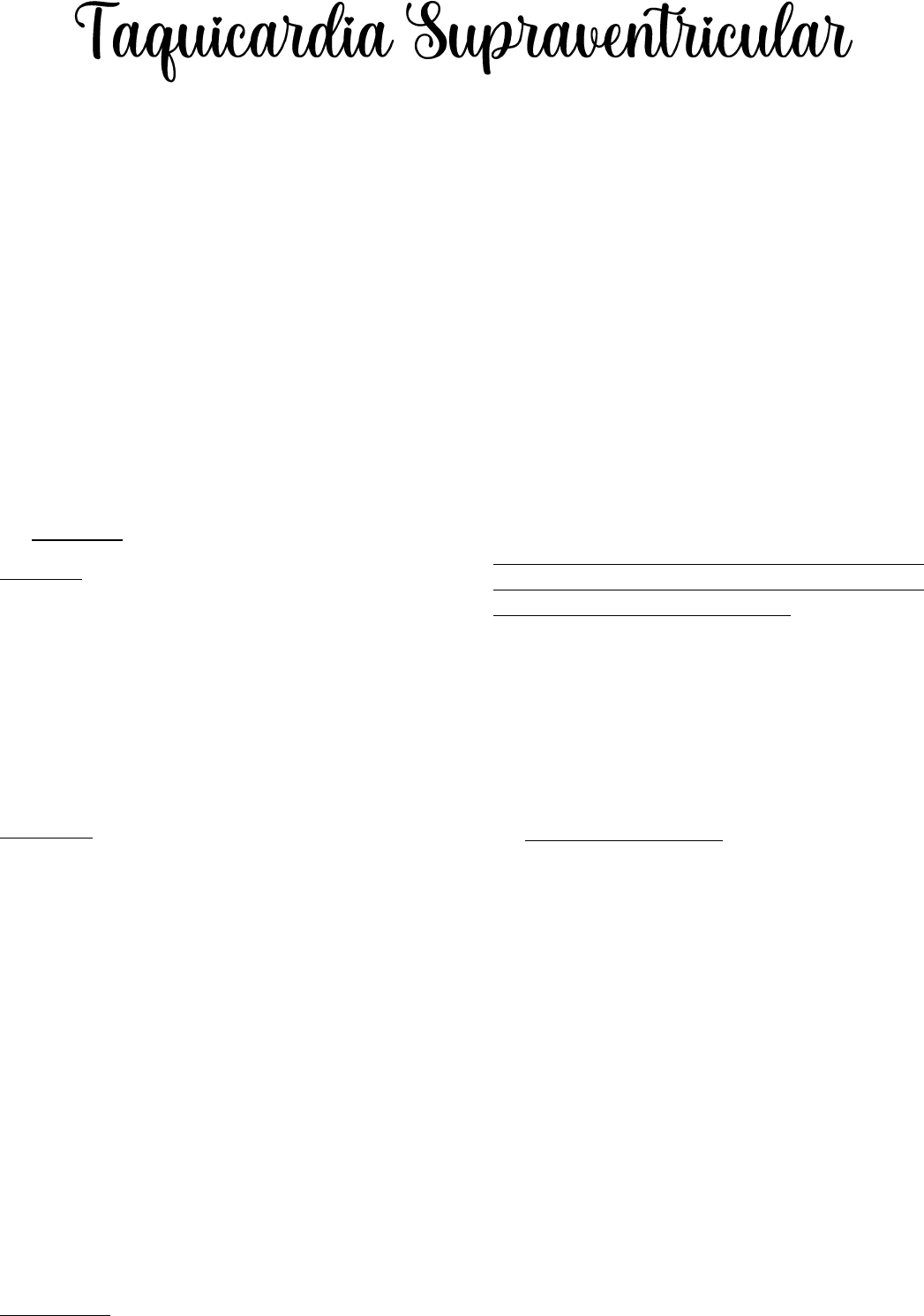 Maria Eduarda de Souza Trigo Fernandes – Laboratório de Simulação Realística 7º Semestre Taquicardia supraventricular (TSV) é uma taquiarritmia comum e de início súbito, que apresenta ritmo regular e pode chegar à frequência cardíaca acima de 200 bpm, cujos impulsos são originados acima do nó atrioventricular. Usualmente, é encontrada em adultos jovens sem nenhuma doença cardíaca subjacente e costuma acometer majoritariamente mulheres. Vale salientar que, em alguns casos, o álcool, café ou apenas uma pura excitação ou ritmo de extrassístole atrial podem levar a uma TSV. Caracteristicamente, se apresenta como uma taquicardia de R-R regular com QRS estreito, por ser originada em região atrial. Entretanto, há situações em que essa arritmia se apresenta com QRS alargado, simulando uma taquicardia ventricular. • Diagnóstico - Sintomas O quadro clínico varia desde assintomático à presença sintomas como palpitações, mal-estar inespecífico, dispneia, dor torácica, transtornos visuais e alteração no nível de consciência e hipotensão. A aceleração da frequência cardíaca pode persistir por poucos minutos a várias horas. Deve-se caracterizar as palpitações: duração, início, percepção e entrada e saída do episódio. - Anamnese Na anamnese devemos interrogar ativamente sobre dispneia, síncope, precordialgia ou tontura, assim como episódios de confusão mental. Nos antecedentes patológicos, deve-se incluir perguntas sobre histórico de arritmias (quais tipos e tratamentos realizados), cardiopatias no geral (sobretudo infarto prévio, insuficiência cardíaca), doenças respiratórias, endocrinológicas (hipertireoidismo, feocromocitoma) e fatores de risco para distúrbios hidroeletrolíticos (doença renal crônica, vômitos, diarreia). Uma investigação detalhada também deve ser realizada em relação aos medicamentos em uso pelo paciente, assim como drogas de abuso. Indivíduos com sinais de gravidade devem ser examinados na sala de emergência, ao mesmo tempo que são monitorizados e recebem o tratamento inicial. - Exame Físico No exame físico buscamos a regularidade do pulso e comparação com frequência cardíaca; pulsação visível em fúrcula (frogging); medida de pressão arterial em ambos os membros, e/ou em decúbito dorsal e posição ortostática. Na ausculta cardíaca, avaliar presença de B3 ou B4, atrito pericárdico ou abafamento de bulhas. Por fim, atentar para edema assimétrico de membros inferiores e sinais de hipertireoidismo. O diagnóstico deve ser iniciado pelo exame físico em busca de sinais de repercussão hemodinâmica, como rebaixamento do nível de consciência, hipotensão, edema agudo de pulmão, entre outros. Deve-se realizar a anamnese para investigar a existência de patologias associadas, cardiopatias, história familiar de morte súbita, atividades precipitantes e uso de substâncias e medicamentos. Sinais e sintomas de instabilidade podem indicar tratamento imediato com cardioversão ou desfibrilação elétrica. São critérios de instabilidade: 1. Hipotensão (PAS < 90mmHg), choque. 2. Rebaixamento do nível de consciência. 3. Dor precordial. 4. Dispneia (insuficiência cardíaca/edema agudo de pulmão). • Exames Complementares O eletrocardiograma é exame fundamental para o diagnóstico das taquiarritmias, em especial se realizado durante os sintomas. A depender dos diagnósticos diferenciais, outros exames podem ser solicitados, como eletrólitos, função renal, marcadores de necrose miocárdica, dosagem sérica de substâncias (p. ex., digoxina). Uma abordagem sistematizada pode facilitar a identificação das principais taquiarritmias (Figura 2). Diante de uma taquicardia, fazemos três perguntas: 1. O QRS é estreito ou largo? QRS estreito são ritmos cardíacos com frequência cardíaca (FC) maior que 100 bpm e duração do QRS menor que 120 ms. Todas as taquicardias de QRS estreito são taquicardias supraventriculares (TSV). R-R irregular = fibrilação atrial (FA), flutter atrial e taquicardia atrial multifocal; Maria Eduarda de Souza Trigo Fernandes – Laboratório de Simulação Realística 7º Semestre R-R regular = taquicardia por reentrada nodal (TRN), taquicardia atrial, flutter atrial e taquicardia por reentrada átrio-ventricular (TRAV). • Tratamento -> Com critérios de instabilidade - Sedação: Midazolam 3-5 mg bolus (repetir até sedação) Etomidato 20 mg bolus (2 min após Fentanil) Propofol * 30-50 mg bolus (máximo até 200 mg). - Analgesia: Fentanil 1-2 μg/kg; Morfina 1-2 mg. - Cardioversão elétrica: Realizar sedação e analgesia antes da CVE. Em pacientes com QRS estreito e R-R regular: Iniciar com 50 J. -> Sem critérios de instabilidade - QRS estreito e R-R regular: 1. Manobra Vagal: A massagem do seio carotídeo (MSC) é realizada com o paciente em posição supina, com o pescoço hiperestendido. Realiza-se uma pressão estável em região inferior ao ângulo da mandíbula, perto do pulso arterial carotídeo por 5 a 10 segundos. Se não houver uma resposta positiva, pode-se repetir a manobra do outro lado, após 2 minutos. Contraindicações: presença de sopro carotídeo, AVE ou AIT prévios (exceto se exame de imagem de carótidas sem doença aterosclerótica), IAM nos últimos 6 meses e história de arritmia ventricular grave (TV/FV); 2. Adenosina: realizada se não houver reversão com manobras vagais. É importante orientar previamente o paciente que poderá apresentar pressão torácica importante com sensação de “morte iminente”, porém tais efeitos são transitórios. Inicia-se com 6 mg em bolus, seguida de flush de soro fisiológico 20 ml. Se não houver reversão, pode-se aumentar a dose para 12 mg em bolus e repetir mais uma vez esta dose, se necessário. Efeitos colaterais: flush facial, hipotensão, palpitação, dor torácica, bradicardias, broncoespasmo, dispnéia, hiperventilação, cefaléia, tonturas e turvação visual. Contraindicaç