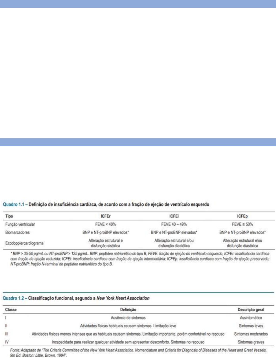 Insuficiência cardíaca DEFINIÇÃO Insuficiência cardíaca (IC) é uma síndrome clínica complexa, na qual o coração é incapaz de bombear sangue de forma a atender às necessidades metabólicas tissulares, ou pode fazê-lo somente com elevadas pressões de enchimento. Tal síndrome pode ser causada por alterações estruturais ou funcionais cardíacas e caracteriza-se por sinais e sintomas típicos, que resultam da redução no débito cardíaco e/ou das elevadas pressões de enchimento no repouso ou no esforço. O termo “insuficiência cardíaca crônica” reflete a natureza progressiva e persistente da doença, enquanto o termo “insuficiência cardíaca aguda” fica reservado para alterações rápidas ou graduais de sinais e sintomas resultando em necessidade de terapia urgente. Embora a maioria das doenças que levam à IC caracterizam-se pela presença de baixo débito cardíaco (muitas vezes compensado) no repouso ou no esforço (IC de baixo débito), algumas situações clínicas de alto débito também podem levar a IC, como tireotoxicose, anemia, fístulas arteriovenosas e beribéri (IC de alto débito). Implícito na definição de IC está o conceito de que a ela possa ser causada por anormalidade na função sistólica, produzindo redução do volume sistólico (IC sistólica) ou anormalidade na função diastólica, levando a defeito no enchimento ventricular (IC diastólica), que também determina sintomas típicos de IC. No entanto, é importante salientar que, em muitos pacientes, coexistem as disfunções sistólica e a diastólica. Assim, convencionou-se definir os pacientes com IC de acordo com a fração de ejeção do ventrículo esquerdo (FEVE). CLASSIFICAÇÃO A IC pode ser determinada de acordo com a fração de ejeção (preservada, intermediária e reduzida), a gravidade dos sintomas (classificação funcional da New York Heart Association − NYHA) e o tempo e progressão da doença (diferentes estágios). 1. Classificação de acordo com a fração de ejeção: • FEVE normal (≥ 50%), denominada IC com fração de ejeção preservada (ICFEp) • FEVE reduzida (< 40%), denominados IC com fração de ejeção reduzida (ICFEr) • IC de fração de ejeção intermediária (mid-range ou ICFEi). 2. Classificação de acordo com a gravidade dos sintomas: Esta classificação se baseia no grau de tolerância ao exercício e varia desde a ausência de sintomas até a presença de sintomas mesmo em repouso. 3. Classificação de acordo com a progressão da doença: Esta classificação inclui desde o paciente com risco de desenvolver IC, cuja abordagem deve ser feita no sentido de prevenir seu desenvolvimento, quanto o paciente em estágio avançado da doença, que requer terapias específicas, como transplante cardíaco e/ou dispositivos de assistência ventricular. EPIDEMIOLOGIA A síndrome mantém-se como patologia grave, afetando, no mundo, mais de 23 milhões de pessoas. A sobrevida após 5 anos de diagnóstico pode ser de apenas 35%, com prevalência que aumenta conforme a faixa etária (aproximadamente de 1% em indivíduos com idade entre 55 e 64 anos, chegando a 17,4% naqueles com idade maior ou igual a 85 anos). Dados recentes distinguem a mortalidade tardia (1 ano) entre portadores de IC crônica, de acordo com a classificação por fração de ejeção, atingindo maior taxa para portadores da ICFEr (8,8%), seguida da ICFEi (7,6%) e da ICFEp (6,3%). Em nosso país, dados do registro BREATHE mostraram como principal causa de re-hospitalizações a má aderência à terapêutica básica para IC, além de elevada taxa de mortalidade intra-hospitalar, posicionando o Brasil como uma das mais elevadas taxas no mundo ocidental. Nosso país ainda apresenta controle inadequado de hipertensão arterial e diabetes, e a persistência de doenças negligenciadas está entre causas frequentes da IC. A doença reumática e a doença de chagas (DC), embora menos relevantes do que no passado, continuam presentes, gerando quadros graves. Esta última esteve relacionada ao atendimento ambulatorial de até 21% de portadores de IC. FISIOPATOLOGIA A IC pode ser resultado de inúmeras doenças cardíacas e/ou sistêmicas. A causa mais comum é a redução da contratilidade miocárdica (função sistólica alterada), que pode ser originada por Infarto agudo do miocárdio (IAM), fase dilatada da cardiopatia hipertensiva e miocardiopatias. Porém outras causas também são observadas, tais como as condições que interferem no enchimento ventricular (função diastólica alterada), as anormalidades mecânicas, os distúrbios da frequência e do ritmo cardíaco, a cardiopatia pulmonar e os estados de alto débito. Nos adultos, em aproximadamente 69% dos casos, a IC está associada à disfunção sistólica do ventrículo esquerdo. Já nos 40% restantes, a IC está relacionada com a disfunção diastólica, condição que vem sendo mais observada com o aumento da expectativa de vida da população. As manifestações iniciais da disfunção hemodinâmica (redução no volume de ejeção e elevação das pressões de enchimento ventriculares) apresentam efeitos em cascata nos reflexos cardíacos e na perfusão e função dos órgãos sistêmicos. Isso estimula respostas compensatórias interdependentes, envolvendo os sistemas cardiovascular e neuro-hormonal, além de alterações na fisiologia renal. As respostas neuro-hormonais consistem basicamente em três mecanismos: • liberação de norepinefrina pelos nervos simpáticos do coração (eleva a FC e aumenta a contratilidade do miocárdio e resistência vascular); • ativação do sistema renina-angiotensina-aldosterona • liberação do peptídeo natriurético atrial (estes últimos mecanismos responsáveis por ajustar os volumes de enchimento e pressão). Já a resposta cardíaca consiste principalmente no mecanismo Frank-Starling. De acordo com esse mecanismo, quanto maior for o volume diastólico final, maior ser