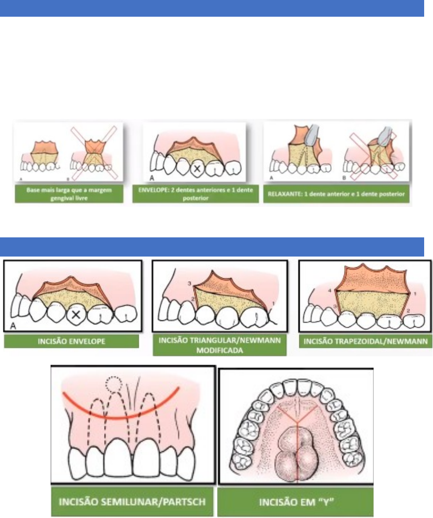 PRINCÍPIOS DE EXODONTIA COMPLEXA Desenho/desenvolvimento e manejo do retalho Secção de tecido mole que: 1. delimitado por uma incisão cirúrgica; 2. contém seu próprio suprimento sanguíneo; 3. permite acesso cirúrgico aos tecidos profundos; 4. pode ser recolocado em sua posição original; 5. mantido por suturas. Tipos de retalhos Princípios e técnicas para extração aberta Critérios para a permanência de fragmentos de raiz Sepultamento radicular Riscos: 1. e a remoção da raiz for causar destruição excessiva do tecido circundante; 2. se a remoção do dente põe em risco estruturas mais importantes (N.A.I, N. mentoniano); 3. risco de anestesia permanente/prolongada do N.A.I; 4. deslocamento da raiz para o seio maxilar/fossa nasal. Técnicas para extrações múltiplas Sequência de extração *dentes maxilares devem ser removidos primeiro; 1. infiltração anestésica desaparece mais rapidamente; 2. debris, parte de amálgama e fragmentos de coroas podem cair nos alvéolos dos dentes inferiores; 3. remoção com maior força vestibular.