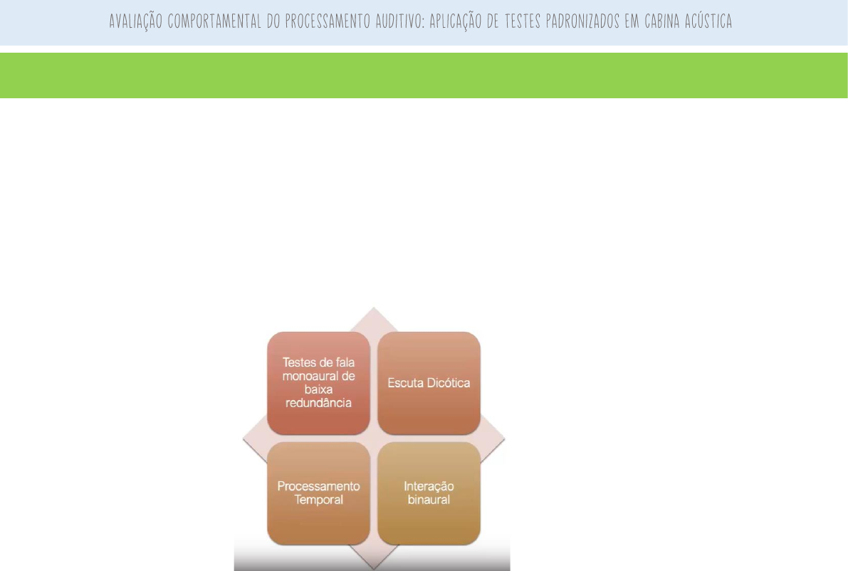 1) Bateria de Avaliação comportamental do processamento auditivo: - Constituída por testes padronizados realizados em cabina acústica (listas gravadas) • São testes que tentam reproduzir situações auditivas que vivenciamos no dia a dia e nas quais necessitamos utilizar nossas habilidades auditivas para compreensão da fala - A bateria de avaliação comportamental do processamento auditivo: • Dividido em 4 grupos: • É necessário que tenha pelo menos um teste dentro de cada um desses grupos para ter uma bateria de testes abrangentes e que consegue avaliar todas as habilidades auditivas. 2) Teste de fala monoaural de baixa redundância - Os processos auditivos envolvidos na aplicação destes testes, ou seja, as habilidades auditivas avaliadas com esses testes são: • Fechamento auditivo • Atenção seletiva • Figura-fundo auditiva 3) Fechamento auditivo • Fechamento auditivo: Refere-se à capacidade do ouvinte normal em utilizar redundâncias intrínsecas ou extrínsecas para preencher as partes ausentes ou distorcidas do sinal auditivo e reconhecer a mensagem completa (Bellis, 2002) - Redundâncias: Tudo que se refere ao meio e que pode facilitar ou dificultar a compreensão da mensagem são as redundâncias extrínsecas (iluminação do ambiente, Testes de fala monoaural de baixa redundância (fala com ruído e fala filtrada) acústica do ambiente, existência de fontes de ruído ou não, a distância que está do interlocutor, a forma como esse interlocutor fala), já as redundâncias intrínsecas se referem à pessoa, como processa, analisa e interpreta esses sons. Então, se tem alteração do processamento auditivo, a redundância intrínseca estará diminuída e será necessário fazer maior esforço para entender a mensagem. - Alteração na habilidade de fechamento auditivo: • Um indivíduo com deficiência de processamento do fechamento auditivo exibe uma falha na redundância intrínseca do SNAC, reduzindo ou eliminando a representação repetida do sinal que chega pelas vias auditivas. Portanto, qualquer intercorrência que reduza a redundância extrínseca do sinal auditivo pode interferir na capacidade do indivíduo em conseguir o fechamento auditivo. Em seu nível mais básico, uma deficiência do fechamento auditivo pode interferir na capacidade de decodificar os aspectos fonêmicos de um sinal de fala. - De maneira contrária, o ouvinte com uma deficiência na habilidade de fechamento auditivo, talvez não tenha dificuldade de entendimento da fala em um ambiente acústico ideal, contudo, ele pode apresentar maior dificuldade com ruidos de fundo ou com falantes desconhecidos. (Jacob et al, 2000) 4) Atenção seletiva - Atenção diferente de atenção seletiva • Atenção: Habilidade para deter-se num determinado estímulo durante um período • Atenção seletiva: Monitorar estímulo auditivo significativo, mesmo que a atenção primária esteja voltada a outra modalidade sensorial ou que exista a presença de um ruído de fundo 5) Figura fundo auditiva - Habilidade de identificar o sinal de fala em presença de outros sons competitivos 6) Testes de fala monoaural de baixa redundância 1. Fala com ruído - Monoaural: Testa uma orelha e depois a outra - Realizado a partir de 7 anos - Monossílabos apresentados com ruído ipsilateral (banda larga) - IPRF feito no silêncio: Intensidade de apresentação do estímulo = 40dBNS (média tritonal + 40dB= intensidade que tem que apresentar esse estímulo de fala gravado) - Como é realizado: No silêncio em uma orelha, em silêncio na outra orelha, depois colocando um ruído na primeira orelha testada, e para isso é necessário que tenha um audiômetro de 2 canais que vai ser capaz de direcionar estímulos distintos para o mesmo transdutor (é necessário escolher uma relação sinal ruído, pode ser zero quando a fala e o ruído forem na mesma intensidade, ou +10dB, ou seja, a fala 10dB mais intensa que o ruído) - A diferença do IPRF no silêncio e no ruído não pode estar acima de 20 pontos (Exemplo: se eu tenho 100% de desempenho no silêncio e 76% no ruído, a diferença está maior que 20 pontos e, portanto, está alterado, mesmo que os 76% esteja dentro do valor de normatização, porque essa discrepância do silêncio e do ruído também indica uma alteração do fechamento auditivo nesse teste de fala com ruído) → Valor de normatização para teste da prófono - Teste fala com ruído em crianças pequenas ou com distúrbios fonoarticulatórios • Usar figuras (PSI com palavras) • Normalidade: 90% - Mesma lista de palavras do teste de fala com ruído - Monoaural: Testa uma orelha e depois a outra - Estímulos degradados pois terá a filtragem das frequências e vai atenuar as frequências médias e altas, priorizando os sons de frequências baixas, dando a sensação de um som 2. Fala filtrada mais abafado, pois houve distorção e alteração desse sinal de fala filtrando as frequências, então aumenta o esforço para compreensão da palavra. - Avalia o fechamento auditivo, assim como a fala com ruído. 7) Interpretação dos resultados - Interpretação simples: baseada na porcentagem de acertos e erros • Se a porcentagem está dentro dos critérios de normalidade ou não, indicando normalidade ou alteração do fechamento auditivo