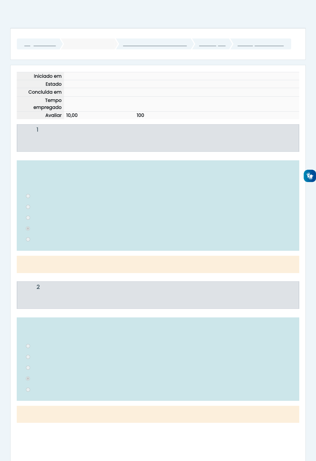 21/02/2023, 16:57 Avaliação do Curso: Revisão da tentativa https://ambienteonline.uninga.br/mod/quiz/review.php?attempt=1912355&cmid=21365 1/9 Página inicial Minhas disciplinas Nivelamento - Matematica AVALIAÇÃO Avaliação do Curso Iniciado em terça, 21 fev 2023, 16:55 Estado Finalizada Concluída em terça, 21 fev 2023, 16:57 Tempo empregado 2 minutos 14 segundos Avaliar 10,00 de um máximo de 10,00(100%) Questão 1 Correto Atingiu 0,50 de 0,50 Questão 2 Correto Atingiu 0,50 de 0,50 João foi à sua agência bancária realizar um saque, a qual recebeu um total de 12 notas totalizando R$ 95,00. Sabendo que João recebeu apenas notas de R$ 5,00 e R$ 10,00, qual o valor que João recebeu em notas de R$ 5,00? a. R$ 15,00. b. R$ 35,00. c. R$ 20,00. d. R$ 25,00. e. R$ 30,00. A resposta correta é: R$ 25,00. Em um baralho completo, com 52 cartas, qual a probabilidade de uma carta ser tirada aleatoriamente e ser do naipe de ouros? a. ¾ b. 5/8 c. ½ d. ¼ e. 1 A resposta correta é: ¼ https://ambienteonline.uninga.br/ https://ambienteonline.uninga.br/course/view.php?id=465 https://ambienteonline.uninga.br/course/view.php?id=465§ion=3 https://ambienteonline.uninga.br/mod/quiz/view.php?id=21365 21/02/2023, 16:57 Avaliação do Curso: Revisão da tentativa https://ambienteonline.uninga.br/mod/quiz/review.php?attempt=1912355&cmid=21365 2/9 Questão 3 Correto Atingiu 0,50 de 0,50 Questão 4 Correto Atingiu 0,50 de 0,50 Questão 5 Correto Atingiu 0,50 de 0,50 Dado o sistema linear , a solução para esse sistema é dado pelo par ordenado: a. (-1,2) b. (1,2) c. (1,3) d. (0,2) e. (2,1) A resposta correta é: (1,2) Dada a função f(x)=ax+b, e que f(1)=5 e f(3)=11, o valor de f(2) é igual a: a. 4. b. 8. c. 7. d. 5. e. 6. A resposta correta é: 8. Na função f(x)=2x-1, o gráfico de f intercepta o eixo y (eixo das ordenadas) no valor: a. -1. b. -2. c. 2. d. 1. e. 0. A resposta correta é: -1. 21/02/2023, 16:57 Avaliação do Curso: Revisão da tentativa https://ambienteonline.uninga.br/mod/quiz/review.php?attempt=1912355&cmid=21365 3/9 Questão 6 Correto Atingiu 0,50 de 0,50 Questão 7 Correto Atingiu 0,50 de 0,50 Questão 8 Correto Atingiu 0,50 de 0,50 A raiz ou zero da função f(x)=-5x+15 vale: a. 3. b. 5. c. -1. d. 1. e. -3. A resposta correta é: 3. A função f(x)=-x^2+8x-15 tem como ponto máximo: a. y=1 b. y=2 c. y=5 d. y=3 e. y=4 A resposta correta é: y=1 Seja definida como , é correto afirmar que f é negativa para todo x real, tal que: a. x é positivo. b. 1<x<7. c. x<1 ou x>7. d. x é zero. e. x é negativo. A resposta correta é: 1<x<7. 21/02/2023, 16:57 Avaliação do Curso: Revisão da tentativa https://ambienteonline.uninga.br/mod/quiz/review.php?attempt=1912355&cmid=21365 4/9 Questão 9 Correto Atingiu 0,50 de 0,50 Questão 10 Correto Atingiu 0,50 de 0,50 Carlos é comerciante, e em sua loja entre os produtos mais vendidos, estão os aparelhos celulares, a qual Carlos percebeu que seu lucro mensal é dado em função da quantidade de aparelhos vendidos, por meio da relação , em que x é dado em meses e f(x) é o lucro obtido em cada mês. Dessa forma, o lucro máximo que Carlos obteve foi no: a. 5° mês. b. 4° mês. c. 6° mês. d. 8° mês. e. 7° mês. A resposta correta é: 6° mês. O valor de k de modo que a função não tenha raízes, isto é, o gráfico da parábola não possui ponto em comum com o eixo x é: a. k<0 b. k=-1 c. k < -1 d. k=0 e. k>-1 A resposta correta é: k < -1 21/02/2023, 16:57 Avaliação do Curso: Revisão da tentativa https://ambienteonline.uninga.br/mod/quiz/review.php?attempt=1912355&cmid=21365 5/9 Questão 11 Correto Atingiu 0,50 de 0,50 Questão 12 Correto Atingiu 0,50 de 0,50 Questão 13 Correto Atingiu 0,50 de 0,50 A função quadrática definida por , em que , tem um único ponto em comum com o eixo das abscissas. O valor de y quando x=2 é igual a: a. y=2 b. y=3 c. y=1 d. y=4 e. y=0 A resposta correta é: y=1 Dada a função , definida por , temos que f(0) é igual: a. 0 b. 2 c. 3 d. 4 e. 1 A resposta correta é: 0 Uma aplicação financeira tem seu rendimento, que depende do tempo, dado pela função f, definida por e Dessa forma, é igual a: a. b. c. d. e. A resposta correta é: 21/02/2023, 16:57 Avaliação do Curso: Revisão da tentativa https://ambienteonline.uninga.br/mod/quiz/review.php?attempt=1912355&cmid=21365 6/9 Questão 14 Correto Atingiu 0,50 de 0,50 Questão 15 Correto Atingiu 0,50 de 0,50 Julgue em V se a afirmação for verdadeira e F se for falsa. A sequência que representa os valores lógicos de cada sentença é: a. V – V – F – F. b. V – F – V – F. c. V – F – F – F. d. F – F – V– F. e. V – V – V – V. A resposta correta é: V – V – F – F. Um grupo de biólogos está estudando o desenvolvimento de uma determinada colônia de bactérias e descobriu que sob condições ideais, o número de bactérias pode ser encontrado por meio da expressão , sendo t em horas. Considerando essas condições, quanto tempo, após o início da observação, o número de bactérias será igual a 8.192.000? a. 24 horas. b. 12 horas. c. 36 horas. d. 1 hora. e. 48 horas. A resposta correta é: 24 horas. 21/02/2023, 16:57 Avaliação do Curso: Revisão da tentativa https://ambienteonline.uninga.br/mod/quiz/review.php?attempt=1912355&cmid=21365 7/9 Questão 16 Correto Atingiu 0,50 de 0,50 Questão 17 Correto Atingiu 0,50 de 0,50 Questão 18 Correto Atingiu 0,50 de 0,50 Dado o polinômio e sabendo que P(1) = 2, então, o valor de P(3) vale: a. 405. b. 324. c. 81. d. 368. e. 386. A resposta correta é: 386. No lançamento de dois dados perfeitos, qual a probabilidade de que a soma dos resultados obtidos seja igual a 6? a. 3/12. b. 7/36. c. 4/9. d. 5/36. e. 1/36. A resposta correta é: 5/36. O resto da divisão do polinômio x^3+3x^2-5x+1 por (x-2) é: a. 12. b. 11. c. 2. d. 10. e. 1. A resposta correta é: 11. 21/02/2023, 16:57 Avaliação do Curso: Revisão da tentativa https://ambienteonline.uninga.br/mo