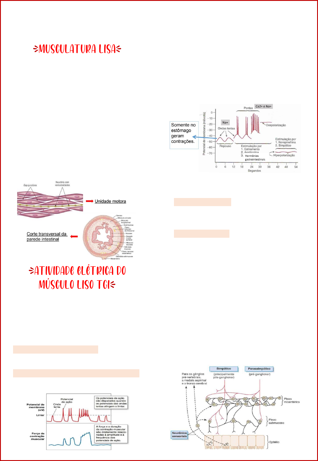 Motilidade → De fora para dentro a parede intestinal é composta por: camada serosa → músculo longitudinal → músculo circular, (contração e do relaxamento dessas duas camadas: motilidade) → submucosa → mucosa → A maioria das regiões são compostas por musculatura lisa (com exceção da cavidade oral, faringe, 1/3 superior do esôfago e esfíncter anal externo – musculatura estriada) → Músculo liso: características específicas, que fazem com que células musculares lisas fiquem agrupadas (junções comunicantes, que permitem a passagem elétrica de íons e 2º mensageiros) – garantindo que a contração ocorra como um sincício (quando contrai, contrai como um todo) → Contração tônica (esfíncteres e estômago proximal) – mantida e sustentada ter um estímulo inibitório para que ela relaxe → Contração fásica (esôfago, estômago distal e intestino) – contração rápida (contração seguida de relaxamento que funciona para propensão do alimento) → Potenciais de ondas lentas: 3 a 12/min → começa a partir de células de Cajal – não pode ser considerado um potencial de ação → Potenciais de ondas em ponta/espícula: 1 a 10/s - despolarização → abre canais de cálcio-sódio → cálcio que gera a contração → Quanto maior o número de potenciais gerados, maior o tempo/força de contração da região → Estímulos excitatórios: estiramento (não aumenta pressão), estímulo da acetilcolina (via nervo vago), hormônios gastrointestinais → Estímulos inibitórios: atividade simpática (NA impede o processo) Controle neural → Sistema Nervoso Entérico: • Plexo mioentérico: se localiza entre a camada muscular longitudinal e a camada muscular circular, está relacionado diretamente com a motilidade do TGI. • Plexo submucoso: se localiza na camada submucosa, está relacionado com as secreções, apenas uma contração de vilosidades acontece no intestino delgado • Os neurônicos que comunicam-se nesses plexos são chamados de intrínsecos, diretamente modulados por neurônios extrínsecos, vindos do SNA (principalmente parassimpático) • Estímulos que acontecem no epitélio → ativação de receptores → potenciais aferentes → tronco encefálico/medula espinal → modulações simpáticas/ parassimpáticas nos neurônios intrínsecos → Sistema Nervoso Autônomo: • Simpático: afasta do limiar • Parassimpático: aproxima do limiar Controle hormonal → MOTILINA • Secreção: Jejum: células M do estômago e duodeno Auxilia na motilidade do período interdigestivo Ação: Complexo motor migratório (peristalse) a cada 90min → COLECISTOCININA (CCK) • Secreção: Ácidos graxos e monoglicerídeos no intestino (células I do duodeno e jejuno) principalmente, frente à gorduras presentes no duodeno Ação: Forte contração da vesícula biliar para secreção da bile, inibição motora gástrica moderada → PEPTÍDEO INIBITÓRIO GÁSTRICO Peptídeo insulinotrópico glicose- dependente Secreção: Ácidos graxos, aas e carboidratos no intestino → mucosa duodeno e jejuno Ação: Inibição motora gástrica leve → SECRETINA Secreção: pH ácido no intestino → células S do duodeno frente à acidez do quimo Ação: inibição fraca do TGI → Segmentação: organização do movimento camada muscular ativa – diretamente envolvida a mistura desse conteúdo Principalmente no intestino delgado → precisa a mistura do alimento → exposição a diferentes enzimas e uma capacidade absortiva eficiente → Peristalse/Peristaltismo: Plexo mioentérico, organização do movimento, ação de cada camada muscular Movimento em direção boca-ânus Pode ser bidirecional, porem limitado Forte contração na camada circular – frente a presença de um conteúdo que distendeu-se (aproximadamente 2 cm) a frente dessa região → contração antes → Complexo motor migratório: organização do movimento Controle: ausência de alimento no estômago e duodeno secreção de motilina Movimento que acontece entre estômago e intestino quando não está se fazendo digestão É a remoção de todo o conteúdo do intestino que não foi utilizado anteriormente → atuação da motilina → Em repouso, permanecem tonicamente contraídos, funcionando como uma barreira Esfíncter esofágico inferior, esfíncter pilórico, esfíncter ileocecal → Reflexo miogênico, agentes neuro- humorais (vago – Ach) → Liberação de oxido nítrico e peptídeo intestinal vasoativo, substâncias inibitórias que relaxam esses esfíncteres para que eles consigam permitir a passagem desse conteúdo em um momento adequado → Integrados no SNE Controle de secreção, peristaltismo, segmentação, inibição local → Comunicação das células do intestino com gânglios pré-vertebrais simpáticos que voltam para TGI Gastrocólico – sinais do estômago para evacuação do cólon (conteúdo fecal seja enviado para o reto para ser eliminado) Enterogástrico – sinais do intestino delgado e cólon para inibir motilidade e secreção gástrica - quimo extremamente ácido, gorduroso, hipertônico... Colonoileal – sinais do cólon para inibir o esvaziamento do íleo no cólon. → Resposta do intestino para a medula espinal/tronco encefálico que volta para TGI Controle vagal motor e secretivo do estômago, inibição geral do TGI pela dor, defecação → Refere-se a um movimento reflexo, que pode a qualquer momento ser sobreposto pelo movimento voluntário → Vinculado a diferentes estímulos: córtex olfativo, córtex gustativo, amigdala, núcleo do trato solitário – o reflexo depende de uma atividade do trigêmeo (ramo mandibular) → Relaxamento da mandíbula (cai) → estira os músculos → sobe → movimentação da mandíbula e atuação dos dentes • Dentes incisivos (corte): capacidade de força de até 25 kg na cavidade oral • Dentes molares (vinculados a trituração): força de até 90 kg na cavidade oral → Funções da mastiga
