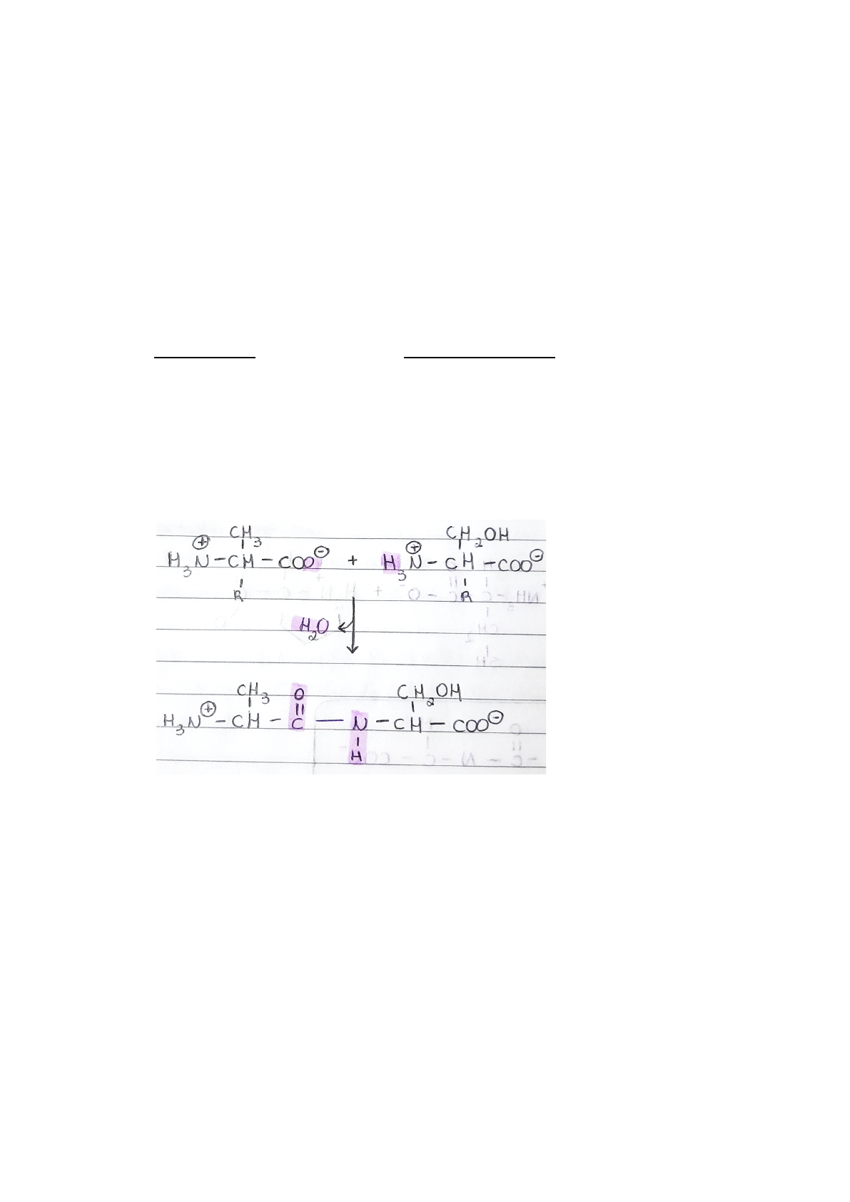 PEPTÍDEOS E PROTEÍNAS Proteínas: ● Catalisadores; ● Reguladores; ● Transporte e armazenamento de substâncias; ● Receptores e etc. ★ As proteínas são macromoléculas constituídas de um conjunto de aminoácidos ligados entre si por ligações peptídicas. Peptídeos: Ligação peptídica é a ligação covalente entre dois ou mais aminoácidos. ● Ocorre pela desidratação do grupo - carboxila de um aminoácido e do grupoα -amino do outro;α ● O grupo amina (NH3) vai perder 2 hidrogênios; ● O grupo carbox vai perder o oxigênio; ● Ao juntar os dos aminoácidos forma-se um grupo amida. ★ O número de ligações peptídicas sempre será a quantidade de aminoácidos -1. Composição: ❖ Proteína simples: Apenas resíduos de aminoácidos. ❖ Proteínas conjugadas: Componentes químicos associados além dos aminoácidos. ex: mioglobina ❖ A parte não aminoácida de uma proteína é chamada de grupo prostético. Proteínas fibrosas e globulares: Exemplo de fibrosa: Queratina e colágeno Exemplo de globular: Mioglobina ESTRUTURA DAS PROTEÍNAS ➔ Estrutura primária: É uma sequência de aminoácidos em uma cadeia polipeptídica. ex: Lyz-Ala-His-Glu-Lys-Val-Leu-Gly-Ala- ★ A sequência de resíduos é o que irá determinar a função daquela proteína. ★ A estrutura primária irá determinar como a proteína irá se dobrar em sua estrutura tridimensional. ➢ A troca de um resíduo na sequência primária de uma proteína pode ocasionar em sequelas para o indivíduo. Exemplo: Anemia falciforme (doença genética). ➔ Estrutura secundária: É o arranjo espacial do esqueleto de um polipeptídeo (padrões regulares de dobramento do esqueleto polipeptídico). ➔ Hélices, folhas pregueadas e voltas reversas. ● Três ligações separam os carbonos consecutivos em uma cadeiaα polipeptídica. ● Os grupos em sua maioria possuem configuração trans. ★ Alfa Hélice É quando se torce de forma regular em torno de cada um dos átomos C -α CONFORMAÇÃO HELICOIDAL (igual um cachinho). ➔ O que mantém essa estrutura são as LIGAÇÕES DE HIDROGÊNIO. ➔ Interações entre cadeias laterais dos aminoácidos podem estabilizar ou desestabilizar a estrutura -helicoidal.α ● Condições que favorecem a estabilidade -hélice:α 1. Tendência para formar um -hélice;α 2. Interações entre os grupos R (espaçamento entre 3-4 aminoácidos); 3. Se tiver: ALANINA, GLUMATO, SERINA, TREONINA CISTEÍNA, LISINA E ARGININA. 4. Cargas opostas, aumenta o favorecimento de formação helicoidal; 5. Interações dos resíduos das extremidades do segmento helicoidal. ➔ A ocorrência de Pro (prolina) e Gly (glicina) indicam a não formação α -hélice: ★ Folha β Uma forma mais estendida das cadeias polipeptídicas (forma de zigue zague) ➔ Os segmentos adjacentes são mantidos pelas ligações de hidrogênio. ★ Volta β São elementos conectores (ligam as extremidades de dois segmentos adjacentes de uma folha antiparalela).β ● Acontece a cada 4 resíduos de aminoácidos ➔ Estrutura terciária: Interações entre os grupos R ● São mantidas por meio de diversas interações fracas e às vezes por ligações covalentes como as ligações de dissulfeto entre os segmentos. ➔ Estrutura quaternária: Arranjo das subunidades em complexos tridimensionais ● Uma proteína de múltiplas subunidades também é chamada de multímero; ● Um multímero com apenas algumas subunidades é chamado de oligômero. ● A primeira proteína oligomérica que teve sua estrutura tridimensional determinada foi a HEMOGLOBINA. LISTA DE EXERCÍCIOS: 1. Explique por que, embora haja apenas vinte aminoácidos, há milhares de proteínas diferentes em nosso organismo. Apesar de existirem poucos aminoácidos, existem muitas proteínas, isso porque cada proteína difere-se entre si de acordo com a sequência específica de resíduos de aminoácidos presente na estrutura primária de cada proteína. 2. Duas proteínas possuem exatamente 456 aminoácidos. Com essa informação, podemos concluir que essas proteínas são iguais? Justifique sua resposta. Não, pois a estrutura primária pode mudar, sendo assim, exercendo funções diferentes uma da outra. 3. Conceitue os vários níveis de organização estrutural das proteínas. 1. Estrutura primária: É a sequência específica de resíduos de aminoácidos em uma cadeia polipeptídica; 2. Estrutura secundária: É o arranjo espacial local do esqueleto (padrões de dobramento) de um polipeptídeo. Pode-se ser subdividido em hélices, folhas pregueadas e voltas reversas. 3. Estrutura terciária: É uma estrutura tridimensional de uma cadeia polipeptídica inteira que se dá por causa das interações dos grupos R. 4. Estrutura quaternária: É o arranjo de duas ou mais estruturas terciárias tridimensionais. 5. 4. Escreva a equação química mostrando a formação de uma ligação peptídica. Descreva características desta ligação. Aminoácido 1+ 2 = dipeptídeo+água 5. Desenhe as estruturas dos dois oligopeptídeos seguintes com seus resíduos de cisteína estabelecendo ligações cruzadas por meio de ligações dissulfeto: Val-Cys, Ser-Cys-Pro. 6. Escreva a fórmula estrutural predominante do pentapeptídeo Thr-Tyr-His-Cys-Lys em pH 12,0. Para responder essa questão, considere os pKas de seus grupos ionizáveis como os mesmos que aqueles dos aminoácidos livres correspondentes. 7. Quais são os tipos de interações intra-moleculares (dentro da própria proteína) responsáveis em manter a estrutura terciária de uma proteína? A estrutura terciária se mantém por ligações fracas e às vezes por ligações covalentes como as de dissulfeto entre os segmentos. 8. Diferencie a estrutura secundária hélice- da folha .α β A estrutura hélice- é formada a partir de torções (formato helicoidal) deα forma regular em torno de cada átomo quiral ao decorrer do segmento polipeptídico. Já a folha é uma extensão da cadeia polipeptídi