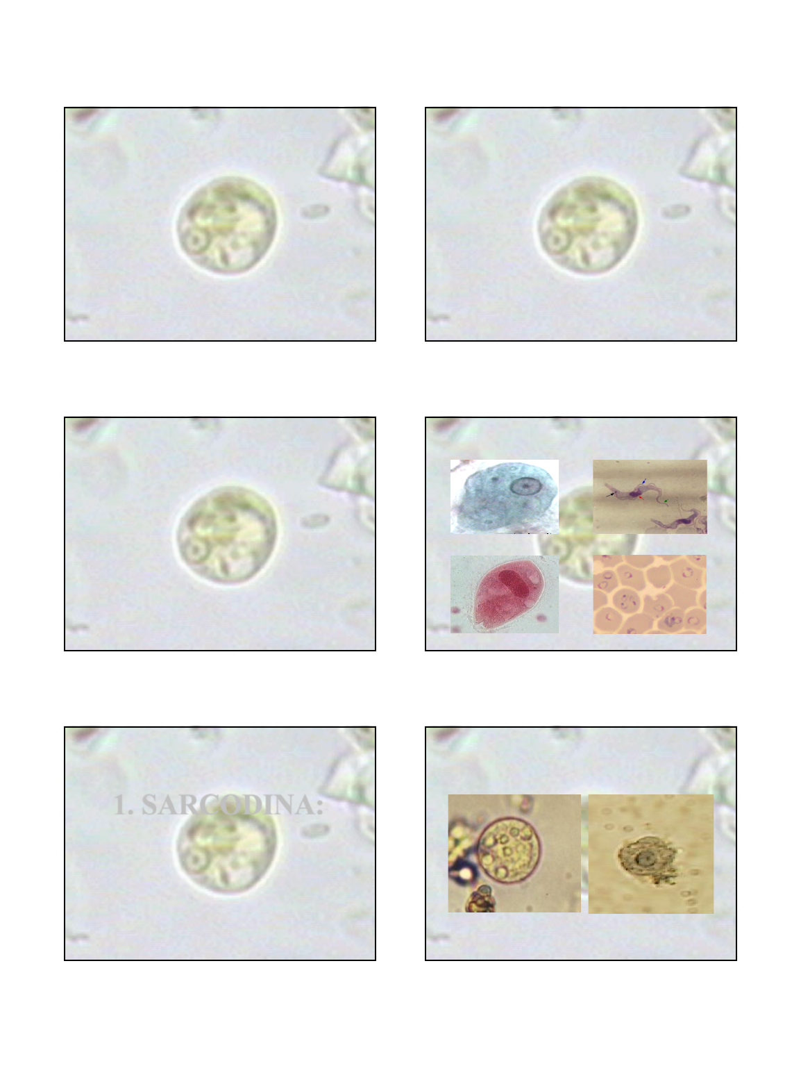 12/05/2020 1 HABILIDADES LABORATORIAIS I PARASITOLOGIA Prof. Dr. Marc Gigonzac 1 PROTOZOOLOGIA CLÍNICA ü Ciência que estuda os protozoários associados às doenças humanas 2 PROTOZOÁRIOS CARACTERÍSTICAS GERAIS ü Organismos Unicelulares ü Eucariotos ü Respiração aeróbia (sanguíneos) / anaeróbia ü Reprodução sexuada ou assexuada ü Produção de toxinas, enzimas e gazes üApresentam forma de resistência: Cisto ü Classificados de acordo com o meio de locomoção 3 Filos MASTIGOPHORA (Flagellata)SARCODINA (Rhizopoda) Balantidium coli Plasmodium falciparum SPOROZOA (Apicomplexa) Entamoeba histolytica CILIATA Trypanosoma cruzi 4 1. SARCODINA: AMEBÍASES 5 Amebíases 6 12/05/2020 2 Amebíases • Classificação: Sarcodinas (S.Classe: Rhizopoda) • Distribuição: Cosmopolita (500 milhões) • Agentes Etiológicos: a) Entamoeba coli (Grassi, 1979) b) Entamoeba hartmanni (Prowasek, 1912) c) Endolimax nana (Wenyon & O´Connor, 1917) d) Iodamoeba butschilii e) Entamoeba gingivalis (Gros, 1849) f) Complexo Histolytica (Entamoeba histolytica) 7 Amebíases a) Entamoeba coli (Grassi, 1979) ü Cistos com 8 nucleos ü Não invade tecidos ü Alimenta-se de detritos alimentares, bactérias e leveduras ü Não patogênica (não necessita tratamento) b) Entamoeba hartmanni (Prowasek, 1912) ü Cistos com 4 núcleos ü Não invade tecidos ü Alimenta-se de detritos alimentares, nunca hemácias ü Não patogênica (não necessita tratamento) 8 Amebíases c) Endolimax nana (Wenyon & O´Connor, 1917) ü Cistos com 1 a 4 núcleos ü Não patogênica p/ homem d) Iodamoeba butschilii ü Cistos com 1 núcleo ü Grandes vacúleos de glicogênio 9 Amebíases e) Entamoeba gingivalis (Gros, 1849) ü Não são conhecidos cistos ü Presente no tártaro dentário e em inflamações da gengiva ü Pode alimentar-se de bactérias, restos celulares e hemácias ü Transmissão através do beijo e perdigotos. 10 AMEBÍASE INTESTINAL PPD 11 Agente Etiológico: Entamoeba histolytica (Schaudinn, 1903) Classificação: Sarcodina (Classe: Rhizopoda) Distribuição: Cosmopolita (~50 milhões; e 500 milhões pelo complexo Entamoeba) Epidemiologia: 100.000 mortes/ano (2° causa de morte por protozoários) Propriedades: Anaeróbicos / fagocitários (hemácias,amido,...) CARACTERÍSTICAS GERAIS 12 12/05/2020 3 Transmissão: Cistos (única forma infectante) ü Água, verduras/legumes, insetos (moscas / baratas), ...sexo oral-anal, ... 13 Sinais Clínico: • Comensal / Assintomático • Colite não disentérica (crises diarréicas ocasionais) • Colite disentérica (cólica c/~10 evacuações diárias sanguinolentas= invasão da mucosa int.) • Colite Necrotizante (ulcerações, hemoragias e isquemia c/ perfurações: choque hipovolêmico: taquicardia e hipotensão): fezes mucopiosanguinolentas, febre, bactérias.. • Amebíase extra-intestinal: Fígado (abscesso) – pulmão, pele, cérebro 14 Diagnóstico Laboratorial EPF: A fresco ou Conserv. p/ trofo. (MIF) fezes líq. (hematox. ferrica.) Faust e cols. (3 amostras) Biópsias de ulceração / exsudatos Sorológicos: ELISA, Imunofluorescência indireta, radioimunoensaio *PCR: Diferenciação de E. histolytica Obs.: Tratamento: Metronidazol: 500-750mg IV (8h/8h) p/ 10 dias (colite necrotizante + antibioticos) Tinidazol: 2g p/ 2 dias Secnidazol: 2g – dose única 15 Diagnóstico Laboratorial Laudo do EPF: ATENÇÃO! Presença de cistos de E. histolytica / E. dispar 16 17 Obs.: • Dientamoeba fragilis Ameba X Flagelado ? 18