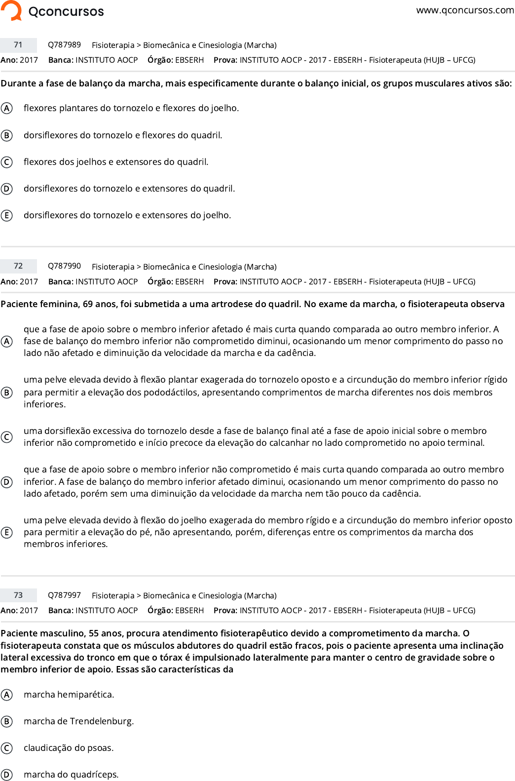 www.qconcursos.com Ano: 2017 Banca: INSTITUTO AOCP Órgão: EBSERH Durante a fase de balanço da marcha, mais especi�camente durante o balanço inicial, os grupos musculares ativos são: A �exores plantares do tornozelo e �exores do joelho. B dorsi�exores do tornozelo e �exores do quadril. C �exores dos joelhos e extensores do quadril. D dorsi�exores do tornozelo e extensores do quadril. E dorsi�exores do tornozelo e extensores do joelho. Ano: 2017 Banca: INSTITUTO AOCP Órgão: EBSERH Paciente feminina, 69 anos, foi submetida a uma artrodese do quadril. No exame da marcha, o �sioterapeuta observa A que a fase de apoio sobre o membro inferior afetado é mais curta quando comparada ao outro membro inferior. A fase de balanço do membro inferior não comprometido diminui, ocasionando um menor comprimento do passo no lado não afetado e diminuição da velocidade da marcha e da cadência. B uma pelve elevada devido à �exão plantar exagerada do tornozelo oposto e a circundução do membro inferior rígido para permitir a elevação dos pododáctilos, apresentando comprimentos de marcha diferentes nos dois membros inferiores. C uma dorsi�exão excessiva do tornozelo desde a fase de balanço �nal até a fase de apoio inicial sobre o membro inferior não comprometido e início precoce da elevação do calcanhar no lado comprometido no apoio terminal. D que a fase de apoio sobre o membro inferior não comprometido é mais curta quando comparada ao outro membro inferior. A fase de balanço do membro inferior afetado diminui, ocasionando um menor comprimento do passo no lado afetado, porém sem uma diminuição da velocidade da marcha nem tão pouco da cadência. E uma pelve elevada devido à �exão do joelho exagerada do membro rígido e a circundução do membro inferior oposto para permitir a elevação do pé, não apresentando, porém, diferenças entre os comprimentos da marcha dos membros inferiores. Ano: 2017 Banca: INSTITUTO AOCP Órgão: EBSERH Paciente masculino, 55 anos, procura atendimento �sioterapêutico devido a comprometimento da marcha. O �sioterapeuta constata que os músculos abdutores do quadril estão fracos, pois o paciente apresenta uma inclinação lateral excessiva do tronco em que o tórax é impulsionado lateralmente para manter o centro de gravidade sobre o membro inferior de apoio. Essas são características da A marcha hemiparética. B marcha de Trendelenburg. C claudicação do psoas. D marcha do quadríceps. 71 Q787989 >Fisioterapia Biomecânica e Cinesiologia (Marcha) Prova: INSTITUTO AOCP - 2017 - EBSERH - Fisioterapeuta (HUJB – UFCG) 72 Q787990 >Fisioterapia Biomecânica e Cinesiologia (Marcha) Prova: INSTITUTO AOCP - 2017 - EBSERH - Fisioterapeuta (HUJB – UFCG) 73 Q787997 >Fisioterapia Biomecânica e Cinesiologia (Marcha) Prova: INSTITUTO AOCP - 2017 - EBSERH - Fisioterapeuta (HUJB – UFCG) https://www.qconcursos.com/ https://www.qconcursos.com/questoes-de-concursos/bancas/instituto-aocp https://www.qconcursos.com/questoes-de-concursos/institutos/ebserh https://www.qconcursos.com/questoes-de-concursos/bancas/instituto-aocp https://www.qconcursos.com/questoes-de-concursos/institutos/ebserh https://www.qconcursos.com/questoes-de-concursos/bancas/instituto-aocp https://www.qconcursos.com/questoes-de-concursos/institutos/ebserh https://www.qconcursos.com/questoes-de-concursos/questoes/54a7ce2d-08 https://www.qconcursos.com/questoes-de-concursos/disciplinas/fisioterapia-fisioterapia https://www.qconcursos.com/questoes-de-concursos/disciplinas/fisioterapia-fisioterapia/biomecanica-e-cinesiologia-marcha https://www.qconcursos.com/questoes-de-concursos/provas/instituto-aocp-2017-ebserh-fisioterapeuta-hujb-ufcg https://www.qconcursos.com/questoes-de-concursos/questoes/54aa7c4c-08 https://www.qconcursos.com/questoes-de-concursos/disciplinas/fisioterapia-fisioterapia https://www.qconcursos.com/questoes-de-concursos/disciplinas/fisioterapia-fisioterapia/biomecanica-e-cinesiologia-marcha https://www.qconcursos.com/questoes-de-concursos/provas/instituto-aocp-2017-ebserh-fisioterapeuta-hujb-ufcg https://www.qconcursos.com/questoes-de-concursos/questoes/54bf89ec-08 https://www.qconcursos.com/questoes-de-concursos/disciplinas/fisioterapia-fisioterapia https://www.qconcursos.com/questoes-de-concursos/disciplinas/fisioterapia-fisioterapia/biomecanica-e-cinesiologia-marcha https://www.qconcursos.com/questoes-de-concursos/provas/instituto-aocp-2017-ebserh-fisioterapeuta-hujb-ufcg E marcha em tesoura. Ano: 2013 Banca: FGV Órgão: AL-MT Com relação aos exercícios em cadeia cinética fechada, assinale V para a a�rmativa verdadeira e F para a falsa. ( ) Estimulam um número maior de mecanoreceptores e desenvolve a propriocepção. ( ) Recrutam maior número de contrações musculares exclusivamente concêntricas. ( ) Exercem maior força compressiva articular que resulta em menor cisalhamento. As a�rmativas são, respectivamente, A F, V e F. B F, V e V. C V, F e V. D V, V e F. E F, F e V. Ano: 2017 Banca: IADES Órgão: Fundação Hemocentro de Brasília - DF A coluna vertebral está situada na região axial do esqueleto humano, e é formada pelo número variável de 32 vértebras e sustentada por numerosos ligamentos e músculos. Em relação aos aspectos cinesiológicos desse segmento do corpo humano, assinale a alternativa correta. A Os movimentos da coluna estão limitados aos planos sagital e coronal. B Os músculos oblíquos, ao se contraírem, comprimem a cavidade abdominopélvica e agem nos movimentos de extensão e rotação do tronco. C A contração bilateral do quadrado lombar puxa a cavidade torácica em direção à pelve ou estende a coluna vertebral; a contração unilateral inclina a coluna lateralmente para o lado que está sendo contraído. D A presença de curvaturas na coluna vertebral possui relevância biomecânica, contribuindo para que os movimentos sejam mais harmônicos. E A região torácica, em razão de estar a
