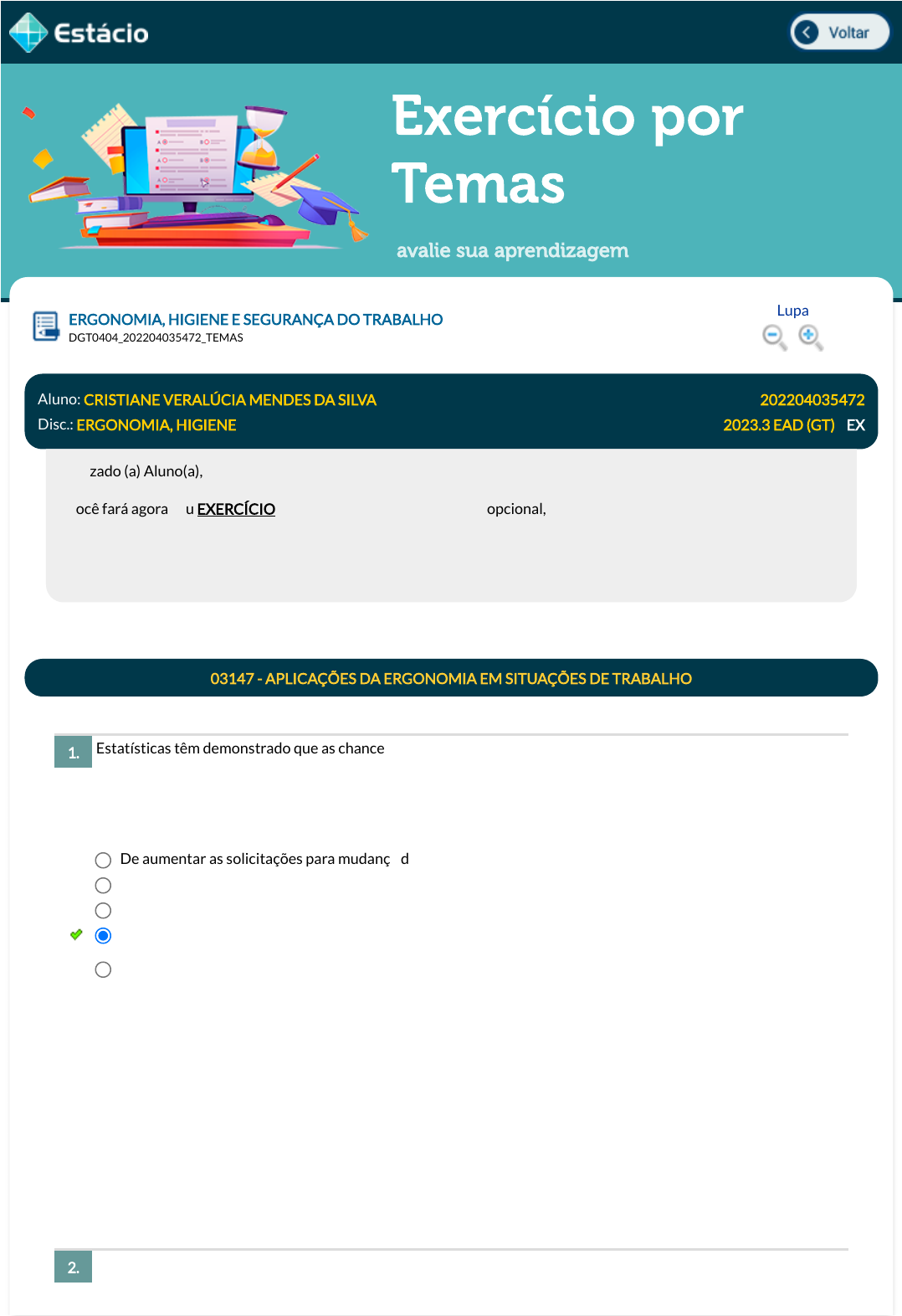 04/10/2023, 08:53 Estácio: Alunos https://simulado.estacio.br/alunos/ 1/6 Exercício por Temas avalie sua aprendizagem Estatísticas têm demonstrado que as chances de empregados terem um bom desempenho serão muito maiores se eles estiverem presentes em um ambiente que possua algum tipo de controle de riscos e com um maior nível de segurança possível. Seguindo esse pensamento, indique a alternativa que completa esta frase da melhor maneira: ''Possuindo a consciência sobre o cuidado com a ergonomia no ambiente de trabalho, existe uma tendência... Pode-se concluir que grande parte das doenças ocupacionais ocorre devido aos riscos ergonômicos que se manifestam no ambiente de trabalho. Isso porque o colaborador, em muitos casos, é obrigado a cumprir as metas estabelecidas pelas suas áreas. Com isso, ele pode passar muitas horas em seus locais de trabalho. Esse cenário é ERGONOMIA, HIGIENE E SEGURANÇA DO TRABALHO Lupa DGT0404_202204035472_TEMAS Aluno: CRISTIANE VERALÚCIA MENDES DA SILVA Matr.: 202204035472 Disc.: ERGONOMIA, HIGIENE 2023.3 EAD (GT) / EX Prezado (a) Aluno(a), Você fará agora seu EXERCÍCIO! Lembre-se que este exercício é opcional, mas não valerá ponto para sua avaliação. O mesmo será composto de questões de múltipla escolha. Após responde cada questão, você terá acesso ao gabarito comentado e/ou à explicação da mesma. Aproveite para se familiarizar com este modelo de questões que será usado na sua AV e AVS. 03147 - APLICAÇÕES DA ERGONOMIA EM SITUAÇÕES DE TRABALHO 1. De aumentar as solicitações para mudança de cargo ou função no trabalho De reduzir os pedidos para o uso de equipamentos de proteção individual De reduzir a carga de trabalho para cada trabalhador De reduzir os registros de faltas por motivos de saúde entre os trabalhadores. De aumentar o número de casos de trabalhadores com reclamações na Justiça sobre pedidos de indenização, mesmo que não tenha ocorrido qualquer tipo de incidente ou acidente. Data Resp.: 03/10/2023 08:43:56 Explicação: Do enunciado da questão, compreende-se que um ambiente de trabalho controla seus riscos e, com um maior nível de segurança, conta com trabalhadores mais comprometidos com as suas tarefas, tendo inclusive melhores desempenhos. Diante disso, existe uma tendência de que sejam menores os registros por motivos de saúde. Todavia, isso não quer dizer que haverá um aumento das reclamações ou das solicitações na Justiça, assim como mudanças de cargo ou redução de pedidos para o uso de EPI ou para carga de trabalho. 2. javascript:voltar(); javascript:voltar(); javascript:voltar(); javascript:voltar(); javascript:diminui(); javascript:diminui(); javascript:aumenta(); javascript:aumenta(); 04/10/2023, 08:53 Estácio: Alunos https://simulado.estacio.br/alunos/ 2/6 propício para a elevação do risco para o trabalhador, comprometendo sua saúde física e mental. A respeito desse contexto, assinale a alternativa que pode ser entendida como verdadeira. Um estudante de um curso de especialização aprendeu, por meio da leitura de um livro, sobre as quatro fases que abordam como o conhecimento de ergonomia foi construído ao longo do tempo. Quanto à segunda fase, está correto a�rmar que: Um pro�ssional que atue na segurança do trabalho deve orientar todas as áreas de sua empresa, principalmente aquelas que possuem empregados diante de computadores, para que sejam evitadas lesões decorrentes de exposições aos eventos de risco. Nesse contexto, analise cada uma das sentenças a seguir e assinale a única alternativa correta. I. Diante de computadores, o empregado deve permanecer com um dos seus braços esticados (180 graus) enquanto manuseia o mouse sobre a mesa. Cumprir metas é dever de qualquer trabalhador; quando for possível, ele deverá solicitar ao gestor de área longos períodos de descansos para recuperar as suas energias. Mesmo em trabalhos considerados simples, as boas práticas são recomendadas às organizações de negócios. O trabalhador tem de se preocupar essencialmente em desempenhar a sua tarefa e não tem a obrigação de avisar em caso da possibilidade da existência de riscos dentro do trabalho. Os riscos dentro do trabalho existem para serem controlados e eliminados pelo próprio trabalhador, e ele deve suportar o seu trabalho em qualquer condição ambiental. O empregado não deve assumir a responsabilidade quando existe algum tipo de ocorrência provocado por ele e que cause o seu afastamento. Data Resp.: 03/10/2023 08:46:19 Explicação: As boas práticas são recomendadas para qualquer organização independentemente de suas atividades serem simples ou complexas. Os riscos dentro do trabalho existem para serem controlados, mas não cabe ao próprio trabalhador a tarefa de eliminá-los. De fato, o cumprimento de metas é dever de qualquer trabalhador, mas é muito raro haver o pedido ao gestor de área para a concessão de longos períodos de descansos a �m de recuperar as suas energias, pois os trabalhos são dimensionados em função da carga de trabalho em muitos casos. O entendimento atual é que tanto o empregador como o empregado devem assumir a responsabilidade quando existe algum tipo de ocorrência provocada por este e que provoque o seu afastamento. O trabalhador tem de se preocupar em desempenhar a sua tarefa e tem a obrigação de avisar no caso da possibilidade da existência de riscos dentro do trabalho. 3. Estudou a interação entre humanos e máquinas, que ocorre por meio da interface do usuário formada por software e hardware. Os aspectos cognitivos serviram de base para todos os estudos cientí�cos realizados na segunda fase Buscou a compreensão melhor da relação do ser humano com seu meio ambiente (natural ou construído). Na segunda fase, os contextos organizacional, psicossocial e político ajudaram a compreender a relevância da ergonomia dentro do trabalho. Preocupou-se com efeitos de temperatura, ruído, vibra