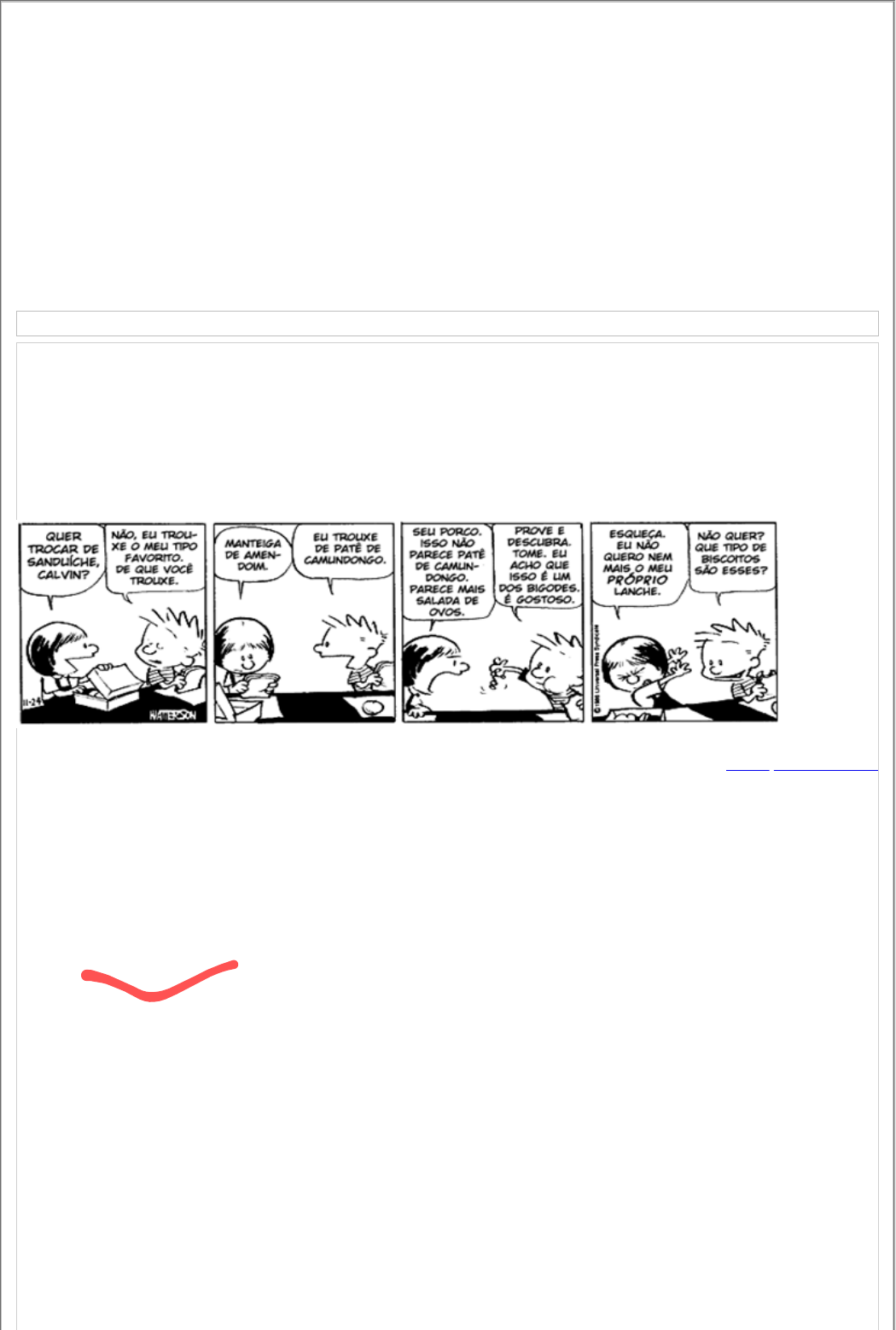 A compreensão da leitura abrange habilidades de linguagem de nível inferior e superior. As habilidades de nível inferior implicam a capacidade de decodificar, bem como a qualidade do léxico mental. No entanto, para obter uma compreensão completa de um texto e realizar um modelo de situação, o leitor precisa fazer inferências. A capacidade de fazer isso pode ser vista como uma habilidade linguística de nível superior. A inferência requer que o leitor faça etapas lógicas para deduzir uma conclusão com base nas premissas declaradas no texto. Isso ajuda no preenchimento de detalhes que não são explicitamente mencionados no texto. A capacidade de fazer inferências prevê parcialmente a compreensão de leitura. Uma distinção pode ser feita entre dois tipos de inferências: aquelas que são feitas com pouco ou nenhum esforço durante a leitura e aquelas que são feitas após a leitura do texto e requerem mais esforço Exercício 1: 1. Todo texto revela os valores e as crenças de um grupo social e algumas vezes ocorrem conflitos intergrupais. No texto da tirinha, a personagem do Calvin tem uma intenção ao dizer o que é dito. Assim, identifique na tirinha qual é a estratégia de Calvin para conseguir o que quer. www.depositodocalvin.com A) Imperativo. B) Persuasão. C) Conversação. D) Convencimento. E) http://www.depositodocalvin.com/ Discernimento. Exercício 2: A linguagem, de modo geral, reflete as atividades humanas. Assim, nas pesquisas de Habilidades Sociais um dos temas abordados é a assertividade que enfatiza as condições antecedentes e reforçadoras do comportamento humano, dependendo do contexto em que o indivíduo está inserido. Desse modo, considerando a tirinha, identifique qual é a assertiva: A) A fé na existência de Deus. B) A credulidade das pessoas de modo geral. C) A esperança de que “tudo vai dar certo”. D) O ceticismo de algumas pessoas. E) A crítica aos dogmas da Igreja. Exercício 3: O homem é um ser social e está sujeito a uma organização caracterizada pela solidariedade entre o individual e o social. Do ponto de vista social, podemos constatar que a construção do homem ocorre por meio da diversidade cultural, ou seja, pela maneira de se localizar no mundo, identificando fronteiras e possibilidades de atuação. Desse modo, considerando a tirinha, a construção da identidade ocorre por meio do raciocínio: A) Indutivo. B) Dedutivo. C) Abdutivo. D) Recíproco. E) Intencional. Exercício 4: De acordo com os pesquisadores, a intertextualidade pressupõe um universo cultural muito amplo e complexo, pois implica na identificação e no reconhecimento de retomadas e remissões a obras, textos mais ou menos conhecidos, além de exigir do leitor a capacidade de interpretar a função daquela citação ou alusão. Desse modo, os conectores contribuem para a construção dos textos adequados a cada modalidade de situação de comunicação. Considerando o fragmento de texto de Bertold Brecht, identifique os operadores argumentativos: “Do rio que tudo arrasta, diz-se que é violento. Mas ninguém chama violentas às margens que o comprimem.” (Bertold Brecht) A) Índice de domínio. B) Índice de justificativa. C) Índice de polifonia. D) Índice de avaliação. E) Índice de atitude. Exercício 5: Sócrates defendia que a ética decorre da sabedoria, ou seja, segundo ele basta saber o que é ser bom para que seja bom. Assim, é importante saber para ser ético. A cada contemporaneidade as noções de ética e moral modificam-se em decorrência das mudanças sociais e a necessidade de ganhos para a sobrevivência. Desse modo, considerando a tirinha da Mafalda, podemos afirmar que a moral: A) Refere-se às obrigações do indivíduo em sociedade. B) Refere-se aos costumes, condutas sociais do indivíduo em sociedade. C) Refere-se à construção do caráter do indivíduo. D) Refere-se aos aspectos culturais particulares. E) Refere-se às ações e aos pensamentos. Exercício 6: A comunicação mediada pelo computador traz uma nova abordagem no tratamento dos gêneros textuais discursivos, na medida em que repensa a relação entre as pessoas e suas práticas sociais. A internet para além da revolução tecnológica seja uma revolução dos modos sociais de interação por meio da língua. Desse modo, considerando a charge, pode-se concluir que: http://rizomas.net/images/phocagallery/charges/thumbs/phoca_thumb_l_educacao-charges-aula- virtual.jpg A) O conhecimento da tecnologia digital está totalmente democratizado no Brasil. B) A preocupação social é fazer planejamento para o domínio da informática. C) O apelo à inclusão digital atrai os jovens para o universo da computação. D) A dificuldade de acesso ao mundo digital torna o cidadão um excluído social. http://rizomas.net/images/phocagallery/charges/thumbs/phoca_thumb_l_educacao-charges-aula-virtual.jpg http://rizomas.net/images/phocagallery/charges/thumbs/phoca_thumb_l_educacao-charges-aula-virtual.jpg E) As novas tecnologias são imediatamente incorporadas à vida cotidiana. Exercício 7: O homem na pós-modernidade estabelece-se como centro do universo. Sendo assim, o imaginário decorre de um processo que constrói a realidade. Desse modo, considerando a tirinha do Calvin, podemos afirmar que entre a realidade e a ficção: www.depositodocalvin.com A) Ocorre uma construção por meio dos valores individuais, das crenças e dos costumes.O B) corre a construção segundo os valores instituídos pelo indivíduo em sociedade. C) Ocorre a construção da ficção por meio da realidade. D) Ocorre a construção da realidade por meio da ficção. E) Ocorre que a realidade não é possível de ser constatada. Exercício 8: Para Bauman (2010), o processo da tomada de decisão busca explicações na forma de resultados de uma causa; em geral, satisfazemos nossa curiosidade concluindo que o evento era inevitável ou pelo menos provável. Segundo o autor, a forma de explicar a condu