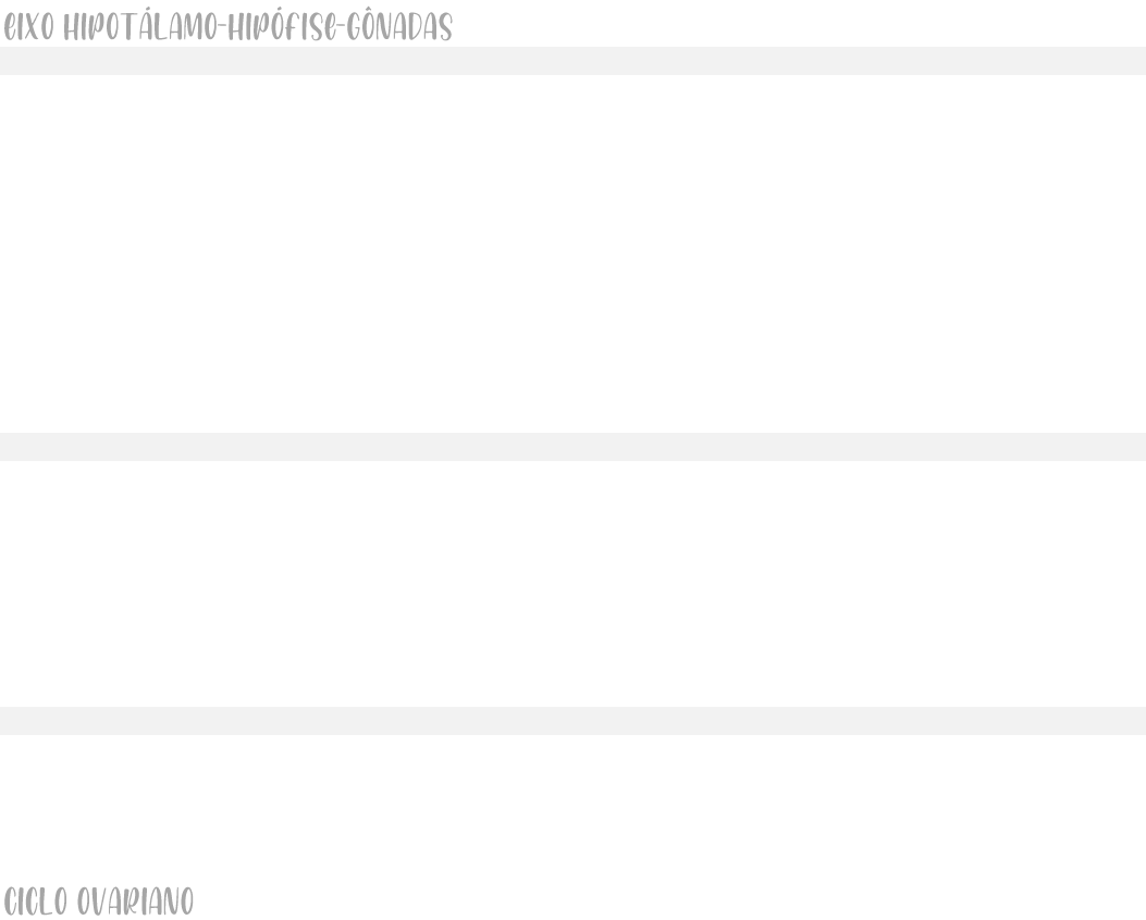 Devolutiva 5 Ciclo Menstrual Hipotálamo • A influência exercida pela secreção ovariana sobre o hipotálamo é denominada de feedback, sendo positivo quando os esteroides ovarianos estimulam a produção do GnRH, e negativo quando a secreção ovariana inibe a produção. Além disso, o próprio GnRH controla sua produção. Quando está em grande quantidade, reduz sua produção, e quando está presente em níveis baixos, estimula sua liberação. • O GnRH, produzido no hipotálamo, exerce papel obrigatório no controle da secreção de gonadotrofinas, sendo responsável pela indução da liberação destas substâncias pela hipófise anterior. • Na mulher o GnRH é liberado de uma forma pulsátil, sendo sua periodicidade e amplitude críticas para determinar a liberação correta e fisiológica do FSH e LH (produzidos na adenohipófise). Na menina, o centro hipotalâmico encontra-se bloqueado até o período da puberdade, quando ocorre sua liberação Hipófise • É uma glândula neuroendócrina dividida em adeno-hipófise e neuro-hipófise. A adeno-hipófise é responsável pela secreção dos hormônios folículo-estimulante (FSH) e luteinizante (LH) • O GnRH age nas células gonadotróficas da hipófise anterior (adeno-hipófise), estimulando-as a sintetizar e secretar na corrente sanguínea tanto o FSH quanto o LH. • No entanto, a secreção de LH é caracterizada por um pico no meio do ciclo menstrual. Já a de FSH caracteriza-se por um aumento na fase folicular inicial, um platô na fase lútea e acentuada elevação na fase lútea tardia. Os hormônios esteroides, como o estradiol e a progesterona, ou fatores ovarianos não-esteroides, como a inibida, são os moduladores da secreção de LH e FSH. Ovários • Ovário sintetiza e secreta hormônios esteroides sexuais (estrogênios, androgênios e progesterona) com padrão de controle preciso que é determinado pelas gonadotrofinas hipofisárias, FSH e LH. • Os hormônios esteroides sexuais desempenham papel no ciclo menstrual preparando o útero para implantação do óvulo. Se não ocorre, o endométrio degenera e ocorre a menstruação. → O ciclo ovariano é dividido em três fases: 1. Fase folicular: a primeira parte do ciclo ovariano, é um período de crescimento folicular no ovário. Essa fase é a que tem duração mais variável, de 10 a 21 dias. Durante a fase folicular do ciclo, o estrogênio é o hormônio esteroide dominante Fase folicular inicial: o 1º dia da menstruação é o dia 1 do ciclo. Pouco antes do início de cada ciclo, a secreção de gonadotrofinas pela adeno-hipófise aumenta, sob a influência do FSH, um grupo de folículos ovarianos terciários começa a crescer. Conforme os folículos crescem, as suas células da granulosa (sob a influência do FSH) e suas células da teca (sob a influência do LH) começam a produzir hormônios esteroides. Os estrogênios exercem retroalimentação negativa na secreção de FSH e de LH pela adeno-hipófise, o que impede o desenvolvimento adicional de folículos no mesmo ciclo. Ao mesmo tempo, o estrogênio estimula a produção de mais estrogênio pelas células da granulosa (folículos continuam sua produção de estrogênio mesmo que os níveis de FSH e de LH diminuam) Fase folicular tardia: secreção de estrogênio ovariano atinge o seu ponto máximo. As células da granulosa do folículo dominante começam a secretar inibina e progesterona, além do estrogênio. O estrogênio, muda para uma retroalimentação positiva, levando ao pico pré- ovulatório de GnRH. Como resultado, a secreção de LH aumenta significativamente. O FSH também aumenta, mas em menor grau. A meiose é retomada no folículo em desenvolvimento com a primeira divisão meiótica, divide o ovócito primário em ovócito secundário e em um primeiro corpúsculo polar (2n), que se degenera. 2. Ovulação: quando um ou mais folículos amadurecem, o ovário libera o(s) ovócito(s) durante a ovulação. A ovulação é desencadeada pelo pico de LH e de FSH. Cerca de 16 a 24 horas após o pico de LH, a ovulação ocorre. O folículo maduro secreta prostaglandinas e enzimas proteolíticas, como MMPs que dissolvem o colágeno e outros componentes do tecido conectivo que mantêm as células foliculares unidas. O óvocito é arrastado para dentro da tuba uterina para ser fertilizado ou para morrer 3. Fase lútea: conhecida como pós-ovulatória ou fase lútea. Transformação do folículo rompido em um corpo lúteo, assim denominado devido ao pigmento amarelo e aos depósitos de lipídeos. O corpo lúteo secreta hormônios que continuam a preparação para a gestação. Se a gestação não ocorre, o corpo lúteo para de funcionar após cerca de duas semanas, e o ciclo ovariano é reiniciado. A progesterona é dominante, embora o estrogênio ainda esteja presente. Fase lútea inicial: as células foliculares da teca migram para o espaço antral, misturando-se com as células da granulosa e preenchendo a cavidade e transformam-se em células lúteas do corpo lúteo (luteinização). Conforme a fase lútea progride, o corpo lúteo produz continuamente quantidades crescentes de progesterona, estrogênio e inibina. A combinação de estrogênio e progesterona exerce retroalimentação negativa sobre o hipotálamo e a adeno-hipófise. Fase lútea tardia e menstruação: corpo lúteo tem uma duração de aproximadamente 12 dias. Se a gestação não ocorrer, o corpo lúteo sofre apoptose espontânea. Conforme as células lúteas degeneram, a produção de progesterona e de estrogênio diminui. Essa queda retira o sinal de retro-alimentação negativa sobre a hipófise e o hipotálamo, e, assim, a secreção de FSH e de LH aumenta. Os remanescentes do corpo lúteo formam uma estrutura inativa, chamada de corpo albicante. Quando o corpo lúteo degenera e a produção hormonal diminui, os vasos sanguíneos da camada superficial do endométrio contraem. Sem oxigênio e nutrientes, as célul