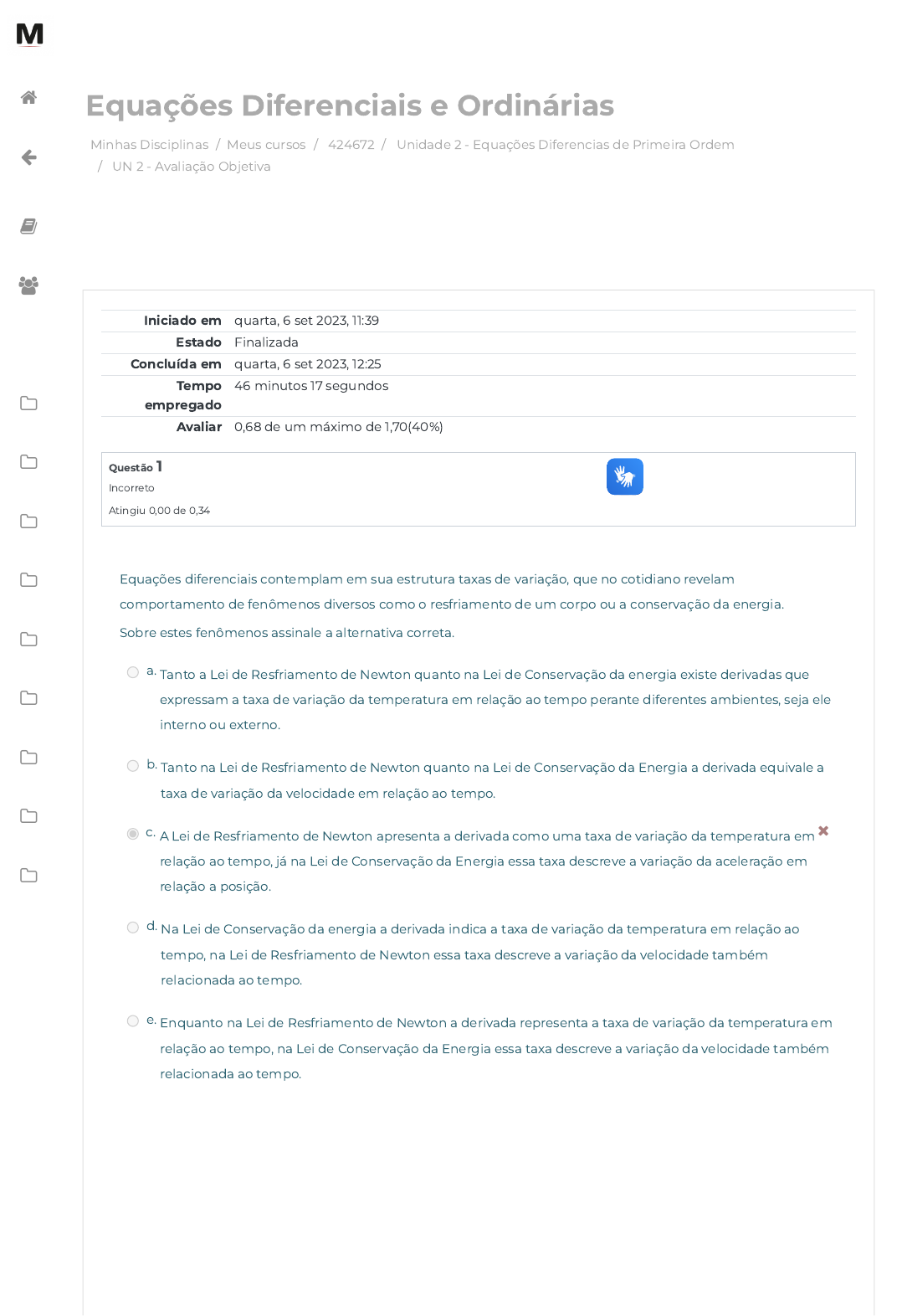 04/10/2023, 09:38 UN 2 - Avaliação Objetiva: Revisão da tentativa https://avap.multivix.edu.br/mod/quiz/review.php?attempt=3740240&cmid=1533316 1/4 Minhas Disciplinas / Meus cursos / 424672 / Unidade 2 - Equações Diferencias de Primeira Ordem / UN 2 - Avaliação Objetiva Equações Diferenciais e Ordinárias Iniciado em quarta, 6 set 2023, 11:39 Estado Finalizada Concluída em quarta, 6 set 2023, 12:25 Tempo empregado 46 minutos 17 segundos Avaliar 0,68 de um máximo de 1,70(40%) Questão 1 Incorreto Atingiu 0,00 de 0,34 Equações diferenciais contemplam em sua estrutura taxas de variação, que no cotidiano revelam comportamento de fenômenos diversos como o resfriamento de um corpo ou a conservação da energia. Sobre estes fenômenos assinale a alternativa correta. a. Tanto a Lei de Resfriamento de Newton quanto na Lei de Conservação da energia existe derivadas que expressam a taxa de variação da temperatura em relação ao tempo perante diferentes ambientes, seja ele interno ou externo. b. Tanto na Lei de Resfriamento de Newton quanto na Lei de Conservação da Energia a derivada equivale a taxa de variação da velocidade em relação ao tempo. c. A Lei de Resfriamento de Newton apresenta a derivada como uma taxa de variação da temperatura em relação ao tempo, já na Lei de Conservação da Energia essa taxa descreve a variação da aceleração em relação a posição. d. Na Lei de Conservação da energia a derivada indica a taxa de variação da temperatura em relação ao tempo, na Lei de Resfriamento de Newton essa taxa descreve a variação da velocidade também relacionada ao tempo. e. Enquanto na Lei de Resfriamento de Newton a derivada representa a taxa de variação da temperatura em relação ao tempo, na Lei de Conservação da Energia essa taxa descreve a variação da velocidade também relacionada ao tempo. https://avap.multivix.edu.br/my/ https://avap.multivix.edu.br/course/view.php?id=23775 https://avap.multivix.edu.br/course/view.php?id=23775§ion=3 https://avap.multivix.edu.br/mod/quiz/view.php?id=1533316 https://avap.multivix.edu.br/my/ https://avap.multivix.edu.br/course/view.php?id=23775 https://avap.multivix.edu.br/user/index.php?id=23775 https://avap.multivix.edu.br/course/view.php?id=23775§ion=1 https://avap.multivix.edu.br/course/view.php?id=23775§ion=2 https://avap.multivix.edu.br/course/view.php?id=23775§ion=3 https://avap.multivix.edu.br/course/view.php?id=23775§ion=4 https://avap.multivix.edu.br/course/view.php?id=23775§ion=5 https://avap.multivix.edu.br/course/view.php?id=23775§ion=6 https://avap.multivix.edu.br/course/view.php?id=23775§ion=7 https://avap.multivix.edu.br/course/view.php?id=23775§ion=8 https://avap.multivix.edu.br/course/view.php?id=23775§ion=9 https://avap.multivix.edu.br/course/view.php?id=23775§ion=10 https://avap.multivix.edu.br/ https://avap.multivix.edu.br/ https://avap.multivix.edu.br/ https://avap.multivix.edu.br/ https://avap.multivix.edu.br/ 04/10/2023, 09:38 UN 2 - Avaliação Objetiva: Revisão da tentativa https://avap.multivix.edu.br/mod/quiz/review.php?attempt=3740240&cmid=1533316 2/4 Questão 2 Incorreto Atingiu 0,00 de 0,34 Questão 3 Correto Atingiu 0,34 de 0,34 Solucionar uma equação diferencial consiste em encontrar um conjunto de funções que a satisfaz, que recebe o nome de solução geral. Nesse sentido, determine a solução da equação diferencial exata indicada por: (x² - y²)dx = 2xy dy = 0. a. b. c. d. e. A Equação de Friedmann é considerada um dos modelos mais signi�cativos para o estudo e desenvolvimento da Cosmologia – ciência que se dedica a compreender a origem, o estado atual e futuro do Universo. A equação de Friedmann é uma equação diferencial que descreve: a. A função correspondente à alteração nas distâncias dos cosmos por meio de um parâmetro chamado fator de escala. b. A expressão de modi�cação nas distâncias dos cosmos utilizando um parâmetro constante chamado fator de escala. c. A relação de alteração nas distâncias dos cosmos por meio de um parâmetro denominado fator de escala. d. A razão entre as distâncias dos cosmos, medida por um parâmetro denominado fator de escala. e. A proporção entre as distâncias dos cosmos, medida por um parâmetro denominado fator de escala. https://avap.multivix.edu.br/my/ https://avap.multivix.edu.br/course/view.php?id=23775 https://avap.multivix.edu.br/user/index.php?id=23775 https://avap.multivix.edu.br/course/view.php?id=23775§ion=1 https://avap.multivix.edu.br/course/view.php?id=23775§ion=2 https://avap.multivix.edu.br/course/view.php?id=23775§ion=3 https://avap.multivix.edu.br/course/view.php?id=23775§ion=4 https://avap.multivix.edu.br/course/view.php?id=23775§ion=5 https://avap.multivix.edu.br/course/view.php?id=23775§ion=6 https://avap.multivix.edu.br/course/view.php?id=23775§ion=7 https://avap.multivix.edu.br/course/view.php?id=23775§ion=8 https://avap.multivix.edu.br/course/view.php?id=23775§ion=9 https://avap.multivix.edu.br/course/view.php?id=23775§ion=10 https://avap.multivix.edu.br/ https://avap.multivix.edu.br/ https://avap.multivix.edu.br/ https://avap.multivix.edu.br/ https://avap.multivix.edu.br/ 04/10/2023, 09:38 UN 2 - Avaliação Objetiva: Revisão da tentativa https://avap.multivix.edu.br/mod/quiz/review.php?attempt=3740240&cmid=1533316 3/4 Questão 4 Correto Atingiu 0,34 de 0,34 Questão 5 Incorreto Atingiu 0,00 de 0,34 Assim a partir da EDO têm-se que: · a função é de�nida apenas para valores de y superiores a zero (y > 0), pois caso contrário não será possível aplicar a raiz quadrada. Logo, a alternativa A é incorreta; · a função , é contínua na metade superior do plano de R , incluindo o eixo X, sendo válida para (y > 0), permitindo garantir pelo Teorema da Existência e da Unicidade pelo menos uma solução nessa região. Logo, está correta a a�rmação B; · dada a função , sua derivada parcial com relação a y é dada por . Logo, a alt