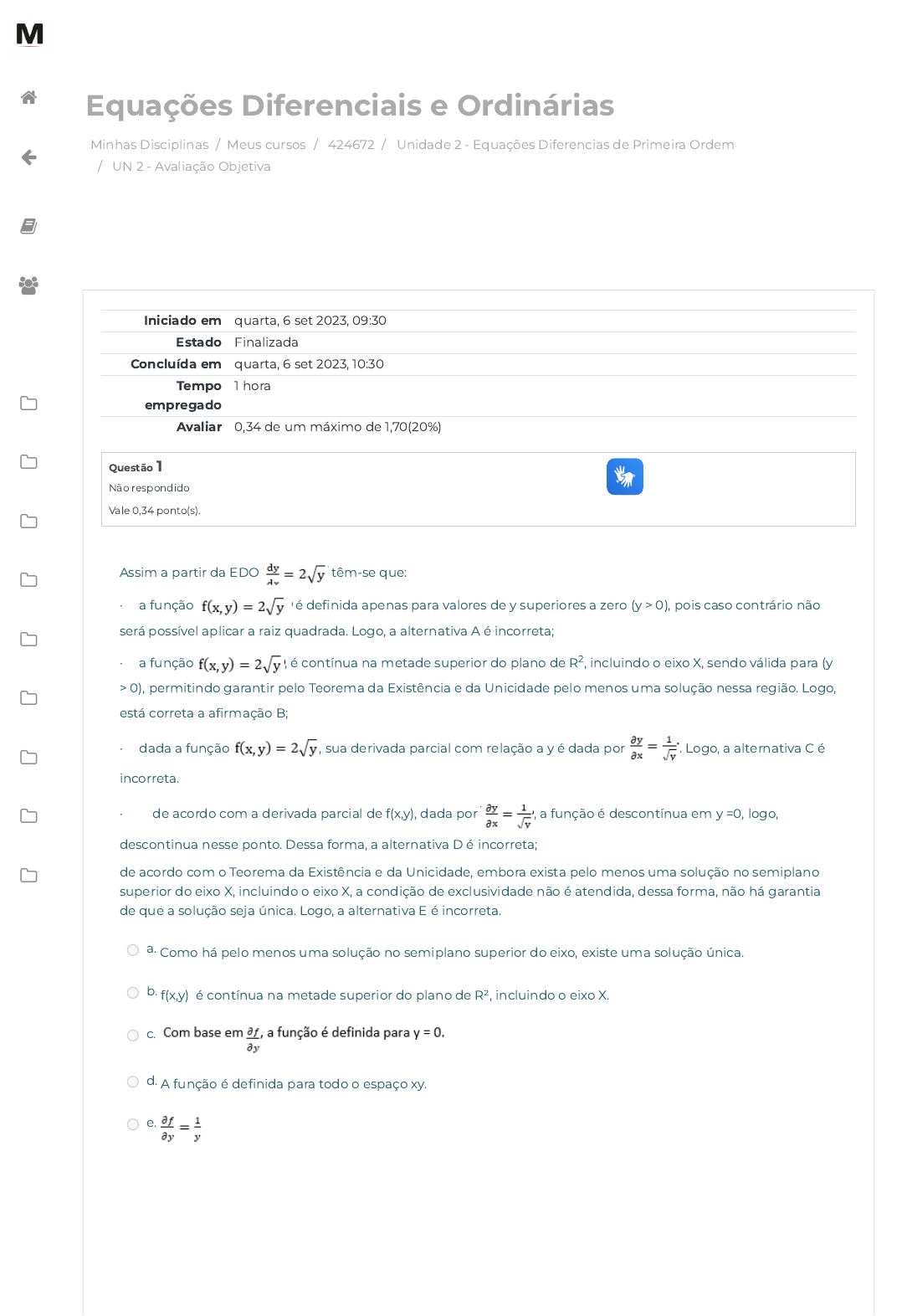 04/10/2023, 09:38 UN 2 - Avaliação Objetiva: Revisão da tentativa https://avap.multivix.edu.br/mod/quiz/review.php?attempt=3739428&cmid=1533316 1/3 Minhas Disciplinas / Meus cursos / 424672 / Unidade 2 - Equações Diferencias de Primeira Ordem / UN 2 - Avaliação Objetiva Equações Diferenciais e Ordinárias Iniciado em quarta, 6 set 2023, 09:30 Estado Finalizada Concluída em quarta, 6 set 2023, 10:30 Tempo empregado 1 hora Avaliar 0,34 de um máximo de 1,70(20%) Questão 1 Não respondido Vale 0,34 ponto(s). Assim a partir da EDO têm-se que: · a função é de�nida apenas para valores de y superiores a zero (y > 0), pois caso contrário não será possível aplicar a raiz quadrada. Logo, a alternativa A é incorreta; · a função , é contínua na metade superior do plano de R , incluindo o eixo X, sendo válida para (y > 0), permitindo garantir pelo Teorema da Existência e da Unicidade pelo menos uma solução nessa região. Logo, está correta a a�rmação B; · dada a função , sua derivada parcial com relação a y é dada por . Logo, a alternativa C é incorreta. · de acordo com a derivada parcial de f(x,y), dada por , a função é descontínua em y =0, logo, descontinua nesse ponto. Dessa forma, a alternativa D é incorreta; de acordo com o Teorema da Existência e da Unicidade, embora exista pelo menos uma solução no semiplano superior do eixo X, incluindo o eixo X, a condição de exclusividade não é atendida, dessa forma, não há garantia de que a solução seja única. Logo, a alternativa E é incorreta. a. Como há pelo menos uma solução no semiplano superior do eixo, existe uma solução única. b. f(x,y) é contínua na metade superior do plano de R², incluindo o eixo X. c. d. A função é de�nida para todo o espaço xy. e. 2 https://avap.multivix.edu.br/my/ https://avap.multivix.edu.br/course/view.php?id=23775 https://avap.multivix.edu.br/course/view.php?id=23775§ion=3 https://avap.multivix.edu.br/mod/quiz/view.php?id=1533316 https://avap.multivix.edu.br/my/ https://avap.multivix.edu.br/course/view.php?id=23775 https://avap.multivix.edu.br/user/index.php?id=23775 https://avap.multivix.edu.br/course/view.php?id=23775§ion=1 https://avap.multivix.edu.br/course/view.php?id=23775§ion=2 https://avap.multivix.edu.br/course/view.php?id=23775§ion=3 https://avap.multivix.edu.br/course/view.php?id=23775§ion=4 https://avap.multivix.edu.br/course/view.php?id=23775§ion=5 https://avap.multivix.edu.br/course/view.php?id=23775§ion=6 https://avap.multivix.edu.br/course/view.php?id=23775§ion=7 https://avap.multivix.edu.br/course/view.php?id=23775§ion=8 https://avap.multivix.edu.br/course/view.php?id=23775§ion=9 https://avap.multivix.edu.br/course/view.php?id=23775§ion=10 https://avap.multivix.edu.br/ https://avap.multivix.edu.br/ https://avap.multivix.edu.br/ https://avap.multivix.edu.br/ 04/10/2023, 09:38 UN 2 - Avaliação Objetiva: Revisão da tentativa https://avap.multivix.edu.br/mod/quiz/review.php?attempt=3739428&cmid=1533316 2/3 Questão 2 Não respondido Vale 0,34 ponto(s). Questão 3 Correto Atingiu 0,34 de 0,34 As equações diferenciais representam um grande campo de estudos da matemática e das ciências aplicadas. Situações as quais se deseja prever o comportamento de algum sistema físico, baseado no conhecimento sobre a variação desse sistema se associam a funcionalidade das equações diferenciais. Sobre as características de uma equação diferencial, assinale a alternativa correta. a. Uma equação diferencial é linear ordinária de 1ª ordem se a função incógnita depende apenas de uma variável independente e é superior a três a ordem mais alta de sua derivada. b. Uma equação diferencial é linear ordinária de 1ª ordem se a função incógnita depende apenas da variável independente e é um a ordem mais alta da derivada que compõe a equação. c. Uma equação diferencial é não linear ordinária de 1ª ordem se a função incógnita depende apenas de uma variável dependente e é superior um a ordem da menor derivada que compõe a equação. d. Uma equação diferencial é linear ordinária de 1ª ordem se a função incógnita depende apenas da variável dependente e é dois o grau da mais alta da derivada que compõe a equação. e. Uma equação diferencial é não linear ordinária de 1ª ordem se a função incógnita depende apenas da variável independente e é dois o grau da mais alta derivada que compõe a equação. Dentre os tipos de equações diferenciais ordinárias ou simplesmente EDO’s existem as que podem ser classi�cadas como exatas. Reconhecer esta característica possibilita utilizar uma técnica especi�ca para determinar a solução destas equações. Nesse sentido, para identi�car se uma EDO é exata ou não utiliza-se da concepção de: a. séries e sequências. b. integral imprópria. c. somatório d. integral e. derivada parcial. https://avap.multivix.edu.br/my/ https://avap.multivix.edu.br/course/view.php?id=23775 https://avap.multivix.edu.br/user/index.php?id=23775 https://avap.multivix.edu.br/course/view.php?id=23775§ion=1 https://avap.multivix.edu.br/course/view.php?id=23775§ion=2 https://avap.multivix.edu.br/course/view.php?id=23775§ion=3 https://avap.multivix.edu.br/course/view.php?id=23775§ion=4 https://avap.multivix.edu.br/course/view.php?id=23775§ion=5 https://avap.multivix.edu.br/course/view.php?id=23775§ion=6 https://avap.multivix.edu.br/course/view.php?id=23775§ion=7 https://avap.multivix.edu.br/course/view.php?id=23775§ion=8 https://avap.multivix.edu.br/course/view.php?id=23775§ion=9 https://avap.multivix.edu.br/course/view.php?id=23775§ion=10 https://avap.multivix.edu.br/ https://avap.multivix.edu.br/ https://avap.multivix.edu.br/ https://avap.multivix.edu.br/ 04/10/2023, 09:38 UN 2 - Avaliação Objetiva: Revisão da tentativa https://avap.multivix.edu.br/mod/quiz/review.php?attempt=3739428&cmid=1533316 3/3 Questão 4 Não respondido Vale 0,34 ponto(s). Que