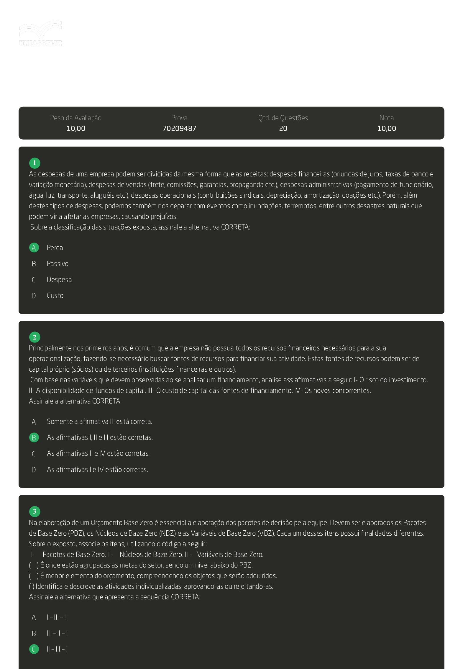 Peso da Avaliação 10,00 Prova 70209487 Qtd. de Questões 20 Nota 10,00 As despesas de uma empresa podem ser divididas da mesma forma que as receitas: despesas financeiras (oriundas de juros, taxas de banco e variação monetária), despesas de vendas (frete, comissões, garantias, propaganda etc.), despesas administrativas (pagamento de funcionário, água, luz, transporte, aluguéis etc.), despesas operacionais (contribuições sindicais, depreciação, amortização, doações etc.). Porém, além destes tipos de despesas, podemos também nos deparar com eventos como inundações, terremotos, entre outros desastres naturais que podem vir a afetar as empresas, causando prejuízos. Sobre a classificação das situações exposta, assinale a alternativa CORRETA: A Perda B Passivo C Despesa D Custo Principalmente nos primeiros anos, é comum que a empresa não possua todos os recursos financeiros necessários para a sua operacionalização, fazendo-se necessário buscar fontes de recursos para financiar sua atividade. Estas fontes de recursos podem ser de capital próprio (sócios) ou de terceiros (instituições financeiras e outros). Com base nas variáveis que devem observadas ao se analisar um financiamento, analise ass afirmativas a seguir: I- O risco do investimento. II- A disponibilidade de fundos de capital. III- O custo de capital das fontes de financiamento. IV- Os novos concorrentes. Assinale a alternativa CORRETA: A Somente a afirmativa III está correta. B As afirmativas I, II e III estão corretas. C As afirmativas II e IV estão corretas. D As afirmativas I e IV estão corretas. Na elaboração de um Orçamento Base Zero é essencial a elaboração dos pacotes de decisão pela equipe. Devem ser elaborados os Pacotes de Base Zero (PBZ), os Núcleos de Baze Zero (NBZ) e as Variáveis de Base Zero (VBZ). Cada um desses itens possui finalidades diferentes. Sobre o exposto, associe os itens, utilizando o código a seguir: I- Pacotes de Base Zero. II- Núcleos de Baze Zero. III- Variáveis de Base Zero. ( ) É onde estão agrupadas as metas do setor, sendo um nível abaixo do PBZ. ( ) É menor elemento do orçamento, compreendendo os objetos que serão adquiridos. ( ) Identifica e descreve as atividades individualizadas, aprovando-as ou rejeitando-as. Assinale a alternativa que apresenta a sequência CORRETA: A I – III – II B III – II – I C II – III – I 1 2 3 D I – II – III A função básica de uma tesouraria é gerir o fluxo dos recursos financeiros de uma organização e salvaguardar seus ativos financeiros, ou seja, o seu tesouro. (...) o termo “tesouraria” está relacionado ao lugar onde se guarda o tesouro. Já a palavra “tesouro” advém do latim thesaurós, cujos significados relacionam-se a uma coisa de valor. Portanto, a tesouraria é o lugar onde se guardam as coisas valiosas. FONTE: SOUZA, M B; TORQUATO, R. Básico em tesouraria: rotinas e procedimentos operacionais. São Paulo. Editora Senac. 2019. 1 recurso online. ISBN 8539627213. Com base nas funções da tesouraria, relativas às disponibilidades, analise as afirmativas a seguir: I- Conciliação bancária diária de todos os lançamentos identificados no extrato bancário. II- Fechamento diário de caixa e banco, registrando toda movimentação e apresentando ao responsável do setor. III- Elaboração da política de crédito e cobrança, divulgando para os demais setores da empresa. IV- Identificação de transferências e boletos não processados pelo banco e providenciar novo pagamento. Assinale a alternativa CORRETA: A As afirmativas I, II e IV estão corretas. B Somente a afirmativa III está correta. C Somente a afirmativa I está correta. D As afirmativas I, II e III estão corretas. As empresas são organizações sociais que utilizam dinheiro, recursos e competências para entregar algo ao mercado e atingir algum objetivo, podendo ser classificadas em empresas lucrativas (em que o objetivo é o lucro) e empresas não lucrativas (em que o objetivo final é apenas a prestação de algum serviço, independente do lucro). FONTE: CHIAVENATO, I. Gestão financeira: uma abordagem introdutória. 3 ed. Barueri, SP: Manole, 2014. Sobre a principal importância da gestão financeira para entidades sem fins lucrativos, assinale a alternativa CORRETA: A Equilibrar os recursos disponíveis, garantindo assim que a sua missão possa ser cumprida. B Acumular recursos financeiros para serem distribuídos aos sócios, garantindo o retorno esperado. C Aprender sobre o tema, para que possa ensinar as pessoas das comunidades carentes que atende. D Demonstrar para a sociedade como e onde estão sendo aplicados os recursos financeiros da entidade. As receitas são todos os valores que entraram na empresa, não provenientes de aporte dos proprietários, aumentando os benefícios econômicos durante o período contábil que resultam em aumentos do patrimônio líquido. Sobre o tipo de receita oriundo de juros, descontos recebidos e rendimentos de aplicações, assinale a alternativa CORRETA: A Receita Não Operacional. B Receita Operacional. C Receita Financeira. D Receita de Vendas. Martins (2020) afirma que uma das principais demonstrações contábeis que exerce o papel de demonstrar o que ocorreu entre dois balanços distintos através da demonstração do lucro e prejuízo é a Demonstração de Resultado do Exercício (DRE). Para que esta demonstração seja possível, é preciso analisar a diferença entre as receitas e despesas. É importante se atentar que despesas e custos são dois conceitos diferenciados, sendo os dois registrados nas demonstrações contábeis de forma separada. FONTE: MARTINS, Eliseu. Análise didática das demonstrações contábeis. 2. Rio de Janeiro: Atlas, 2020. Sobre a diferença entre despesa e custo, assinale a alternativa CORRETA: 4 5 6 7 A Custos são valores externos da empresa e despesas são valores internos. B Os custos estão relacionados a valores como alugu