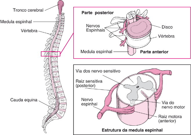 Medula Espinhal A medula espinal recebe os 31 pares de nervos espinhais e está situada dentro do canal vertebral até o nível da primeira vértebra lombar da coluna óssea, de onde emergem os nervos, aparentemente, dos orifícios intervertebrais laterais e sacrais anteriores e posteriores. Tem a forma cilíndrica e está dividida em regiões que correspondem às regiões vertebrais: são oito segmentos cervicais, doze torácicos, cinco lombares, cinco sacrais (num cone terminal) e um coccígeo (para inervação perianal). As raízes ventrais recebem as vias eferentes ou motoras que saem da medula espinal. Os nervos cervicais formam os plexos cervicais e braquiais, com nervos terminais importantes para o músculo diafragma (nervo frênico - C2 a C4) e para o membro superior (nervos axilar, radial, músculocutâneo, mediano e ulnar). Os nervos torácicos formam os nervos intercostais; Os nervos lombares e sacrais formam plexos que dão origem a nervos terminais como o nervo femoral e o ciático (o maior nervo em volume de fibras).