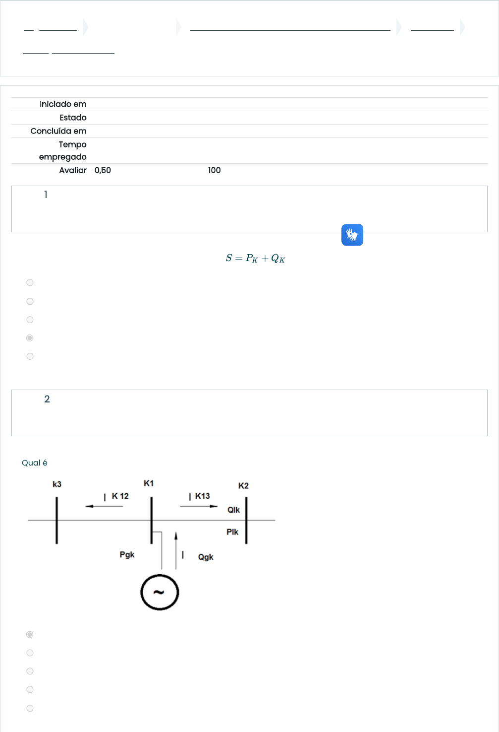 04/10/2023, 19:54 Avaliação - Unidade IV: Revisão da tentativa https://ambienteonline.uninga.br/mod/quiz/review.php?attempt=2450552&cmid=610977 1/5 Página inicial Minhas disciplinas 2023/4 - Análise de Sistemas Elétricos de Potência UNIDADE IV Avaliação - Unidade IV Iniciado em quarta, 4 out 2023, 19:49 Estado Finalizada Concluída em quarta, 4 out 2023, 19:53 Tempo empregado 4 minutos 13 segundos Avaliar 0,50 de um máximo de 0,50(100%) Questão 1 Correto Atingiu 0,05 de 0,05 Questão 2 Correto Atingiu 0,05 de 0,05 Quais são as grandezas descritas nessa equação.: ? a. Potência Semi-aparente, Potência Semiativa e Potência Semi-reativa. b. Não há potência descrita nessa equação. c. Potência aparente, Potência Preditiva e Potência Normativa. d. Potência aparente, Potência Ativa e Potência Reativa. e. Potência Hídrica, Potência Poliativa e Potência Reativa. S = +PK QK Qual é a representação Básica do diagrama abaixo? a. Um gerador injetando potência em duas Linhas de Transmissão. b. Um disjuntor Ortojetor de transferência acoplado nas barras. c. Uma fonte de energia em corrente continua, desacoplada da rede. d. Um Transformador alimentando a Rede. e. Um módulo regulador de tensão acoplado nas barras. https://ambienteonline.uninga.br/ https://ambienteonline.uninga.br/course/view.php?id=21619 https://ambienteonline.uninga.br/course/view.php?id=21619§ion=6 https://ambienteonline.uninga.br/mod/quiz/view.php?id=610977 04/10/2023, 19:54 Avaliação - Unidade IV: Revisão da tentativa https://ambienteonline.uninga.br/mod/quiz/review.php?attempt=2450552&cmid=610977 2/5 Questão 3 Correto Atingiu 0,05 de 0,05 Questão 4 Correto Atingiu 0,05 de 0,05 Questão 5 Correto Atingiu 0,05 de 0,05 Quai são as grandezas na Barra de carga PQ? a. Potência reativa e Potência Ativa, e especificados b. Apenas a Potência Reativa. c. Potência Escalonada e Potência Descendente d. Potência Aparente e Potencia Capacitiva. e. A Barra de carga tem apenas Tensão Existem alguns requisitos elencados para a escolha de um método de solução para cálculo de Fluxo de Potência. Nas sentenças abaixo, estão descritos alguns desses requisitos. Analise-as e escolha a alternativa correta. I. Informações de peso de óleo isolante se fazem necessárias. II. Precisa, sem controle de limites, offline e casos simples. III. Avaliação do ângulo das fases. IV. Optar por circuitos trifásicos e polifásicos. a. Somente as afirmativas II e III estão corretas. b. Somente a afirmativa II está correta. c. Todas as afirmativas estão corretas. d. Somente as afirmativas I e II estão corretas. e. Somente as afirmativas I, II e III estão corretas. Quando na análise de Fluxo de Potência, qual é o ponto de interesse e de maior tempo de operação no Sistema Elétrico de Potência? a. O regime permanente simétrico, pois é a condição normal de funcionamento. b. Em qualquer situação, não há ponto de interesse. c. O regime Transitório simétrico, pois é a condição normal. d. O regime permanente assimétrico, pois é a condição normal de funcionamento. e. O regime Transitório assimétrico, pois é a condição normal. 04/10/2023, 19:54 Avaliação - Unidade IV: Revisão da tentativa https://ambienteonline.uninga.br/mod/quiz/review.php?attempt=2450552&cmid=610977 3/5 Questão 6 Correto Atingiu 0,05 de 0,05 Questão 7 Correto Atingiu 0,05 de 0,05 Considerando que em fluxos de potências, com suas componentes ativa e reativa, a potência aparente complexa flui de uma barra i para uma barra j, qual das equações abaixo a representa? a. b. c. d. e. = −Pk PgK PlK = + j = ( )̇ . ( )̇ = + j = ( )̇ . ( )̇ Sk PK QK VK V ∗K Sk PK QK VK V ∗ K = + j . . .Sij Pij Qij ∑Pgerada = ∑Pcarga +∑Pperdas S = +PK QK O que representa o diagrama abaixo? I. Rede de duas barras e uma Linha de Transmissão. II. Circuito de autotransformadores. III. Geradores em paralelo conectados por barramentos. IV. Duas cargas desativadas a espera de energia. a. Somente a afirmativa I está correta. b. Todas as afirmativas estão corretas. c. Somente as afirmativas II e III estão corretas. d. Somente as afirmativas I, II e III estão corretas. e. Somente as afirmativas I e II estão corretas. 04/10/2023, 19:54 Avaliação - Unidade IV: Revisão da tentativa https://ambienteonline.uninga.br/mod/quiz/review.php?attempt=2450552&cmid=610977 4/5 Questão 8 Correto Atingiu 0,05 de 0,05 Questão 9 Correto Atingiu 0,05 de 0,05 Questão 10 Correto Atingiu 0,05 de 0,05 Para se operar e planejar qualquer Sistema Elétrico de Potência, se faz necessário o conhecimento sobre sistemas elétricos de potência e sobre a situação da rede. Assinale a alternativa correta que esteja elencada nessa necessidade. I. Níveis de Tensão , consumo das cargas II. Despachos dos Geradores , Fluxo de Potência das Linhas. III. Volume de óleo dos Transformadores e qualidade dos para-raios. IV. Informações de controles e limites a. Somente a afirmativa II está correta. b. Somente as afirmativas II e III estão corretas. c. Somente as afirmativas I, II e IV estão corretas. d. Todas as afirmativas estão corretas. e. Somente as afirmativas I e II estão corretas. Quais dispositivos são tratados como externos ao sistema, em uma análise de Fluxo de potência? a. Nenhum dispositivo é deixado ou considerado externo na análise b. Cargas e Geradores c. Estrutura de Rede d. Cabos e Malhas de aterramentos e. Trafos e Isoladores A solução das equações de fluxo de potência somente é possível por meio de métodos iterativos, não havendo uma solução exata, mas, sim, uma solução com um erro menor do que um valor muito pequeno (tolerância). Quais os métodos mais usuais a que esse texto se aplica? a. Método de tentativa e erro, e método de Pascal. b. Método Intuitivo e Método Padrão. c. Método Intuitivo e Clássico. d. Gauss, Gauss-Seidel, Newton-Raphson, matriz, Zbarra. e. Método de Resistências paralelas e séries.