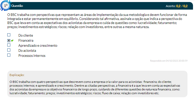 Questão Acerto: BSC trabalha com perspectivas que representam as areas de implementação da sua metodologia e devem funcionar de forma integrada e estar permanentemente em equilíbrio. Considerando tal assinale a opção que indica a perspectiva do BSC que leva em conta as expectativas dos acionistas da empresa e cuida de questões como: lucratividade: faturamento: preços: investimentos riscos; relação com investidores, entre outras a mesma natureza.