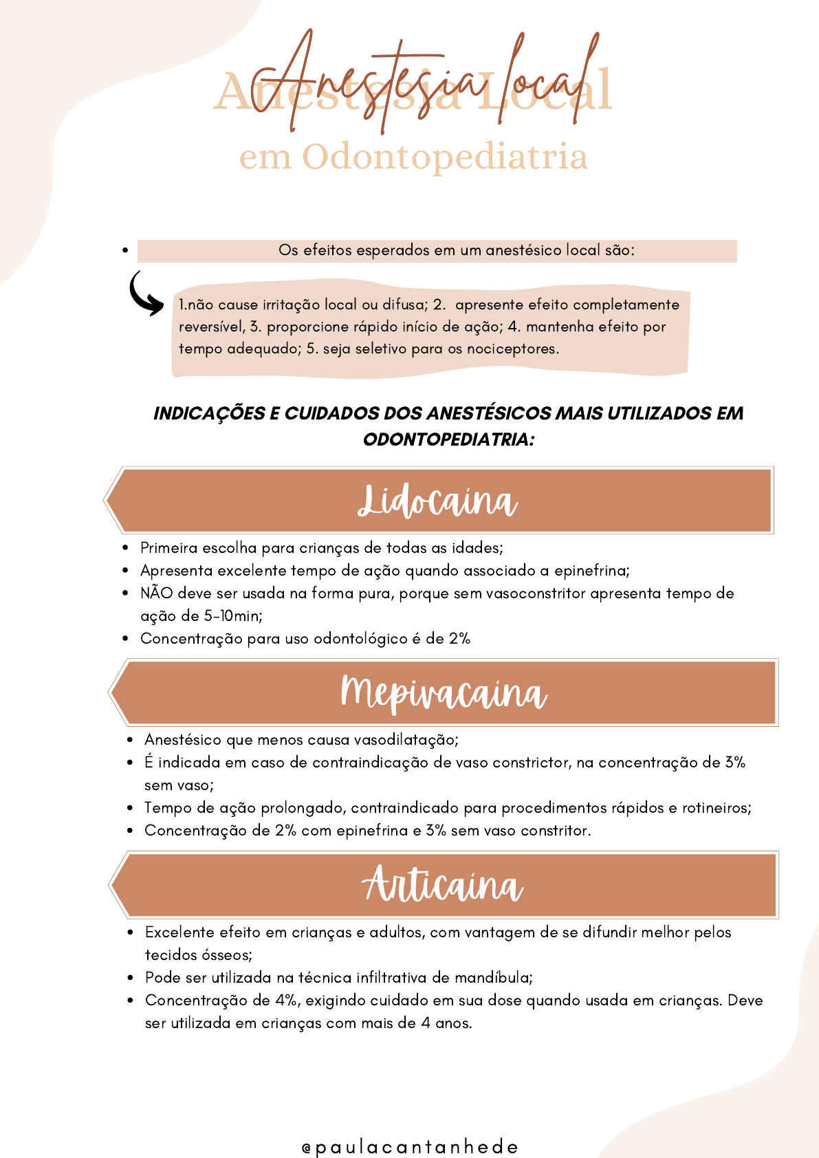 Os efeitos esperados em um anestésico local são: Primeira escolha para crianças de todas as idades; Apresenta excelente tempo de ação quando associado a epinefrina; NÃO deve ser usada na forma pura, porque sem vasoconstritor apresenta tempo de ação de 5-10min; Concentração para uso odontológico é de 2% Anestesia Local em Odontopediatria Anestesia local 1.não cause irritação local ou difusa; 2. apresente efeito completamente reversível, 3. proporcione rápido início de ação; 4. mantenha efeito por tempo adequado; 5. seja seletivo para os nociceptores. Lidocaína Anestésico que menos causa vasodilatação; É indicada em caso de contraindicação de vaso constrictor, na concentração de 3% sem vaso; Tempo de ação prolongado, contraindicado para procedimentos rápidos e rotineiros; Concentração de 2% com epinefrina e 3% sem vaso constritor. Mepivacaína Excelente efeito em crianças e adultos, com vantagem de se difundir melhor pelos tecidos ósseos; Pode ser utilizada na técnica infiltrativa de mandíbula; Concentração de 4%, exigindo cuidado em sua dose quando usada em crianças. Deve ser utilizada em crianças com mais de 4 anos. Articaína INDICAÇÕES E CUIDADOS DOS ANESTÉSICOS MAIS UTILIZADOS EM ODONTOPEDIATRIA: @ p a u l a c a n t a n h e d e Prilocaína Duração intermediária próximo a Lidocaína; Associado ao vasoconstritor não adrenérgico felipressina; Traz risco a alguns grupos de pacientes, como exemplo, crianças com metemoglobina ou anemia; O vasoconstritor usado não apresenta o mesmo efeito da epinefrina; Bupivacaína NÃO é um anestésico de eleição para odontopediatria; apresenta longo tempo de ação. @ p a u l a c a n t a n h e d e
