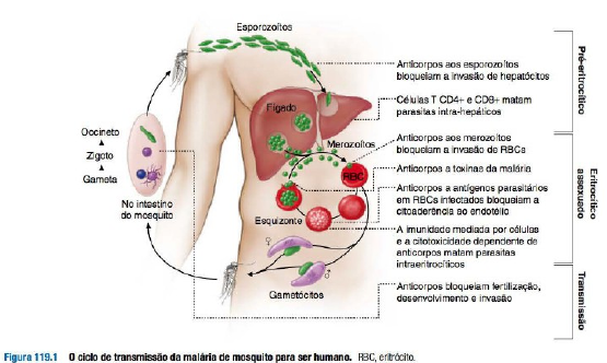 MALÁRIA. A malária é uma doença por protozoários transmitida pela picada de mosquitos Anopheles. A mais importante das doenças parasitárias humanas. Apesar de esforços enormes para o controle, aumentos na resistência do parasita a fármacos, e de seus vetores a inseticidas, além das viagens e migrações dos seres humanos, contribuíram para seu ressurgimento. ETIOLOGIA E PATOGÊNESE. Cinco espécies do gênero Plasmodium causam quase todas as infecções por malária em seres humanos. Elas são P. falciparum, P. vivax, P. ovale, P. malariae. A infecção humana começa quando um mosquito anofelino fêmea inocula esporozoítos do plasmódio de sua glândula salivar durante uma refeição de sangue. Essas formas microscópicas móveis do parasita da malária são carreadas rapidamente pela corrente sanguínea ao fígado, onde elas invadem células do parênquima hepático e começam um período de reprodução assexuada. A célula hepática infectada tumefeita acaba se rompendo, descarregando merozoítos móveis na corrente sanguínea. Esses merozoítos então invadem as células vermelhas do sangue (eritrócitos) e se multiplicam de seis a vinte vezes a cada 48 a 72 horas. Quando os parasitas atingem densidades de ~50/μL de sangue ( ~ 100 milhões de parasitas no sangue de um adulto), começa a fase sintomática da infecção. Nas infecções por P. vivax e P. ovale, uma proporção das formas intra-hepáticas não se divide imediatamente, mas permanece dormente por um período que varia de 3 semanas a um ano ou mais, antes que se inicie a reprodução. Essas formas dormentes, ou hipnozoítas, são a causa das recaídas que caracterizam a infecção por essas duas espécies. Depois da entrada na corrente sanguínea, os merozoítos invadem rapidamente eritrócitos e se tornam trofozoítos. A fixação é mediada por meio de um receptor específico da superfície eritrocitária. Durante a fase inicial do desenvolvimento intraeritrocítico, as pequenas "formas em anel" das diferentes espécies do parasita parecem semelhantes à microscopia luminosa. À medida que os trofozoítos aumentam, características específicas por espécie tornam-se evidentes, o pigmento fica visível, e o parasita assume um formato irregular ou ameboide. Pelo fim do ciclo de vida intraeritrocítica de 48 horas (24 h, para P. knowlesi, 72 h, para P. malariae), o parasita já consumiu dois terços da hemoglobina do eritrócito e cresceu para ocupar a maior parte da célula. Ele agora é chamado de esquizonte. Em seres humanos, a doença é causada pelos efeitos diretos da invasão e destruição de eritrócitos pelo parasita assexuado, e pela reação do hospedeiro. Depois de uma série de ciclos assexuados (P.falciparum), ou imediatamente após a liberação do fígado (P. vivax, P. ovale, P. malariae, P. knowlesi), alguns dos parasitas desenvolvem-se em formas sexuadas morfologicamente distintas, de vida mais longa (gametócitos), que podem transmitir a malária. Após serem ingeridos na refeição de sangue de um mosquito anofelino fêmea que picou, os gametócitos masculino e feminino formam um zigoto no intestino médio do inseto. Esse zigoto amadurece em um oocineto, que penetra e se encista na parede intestinal do mosquito. O oocisto resultante se expande por divisão assexuada até que se rompe para liberar uma miríade de esporozoítos móveis, os quais então migram na hemolinfa para a glândula salivar do mosquito, a fim de esperar a inoculação em outro ser humano na próxima alimentação. MANIFESTAÇÕES CLÍNICAS. A malária é uma causa muito comum de febre em países tropicais. Os primeiros sintomas da malária são inespecíficos; a falta de uma sensação de bem-estar geral, cefaleia, fadiga, desconforto abdominal e dores musculares, seguidas por febre, são similares aos sintomas de uma doença viral de pouca importância. Em alguns casos, um predomínio de cefaleia, dor torácica, dor abdominal, artralgia, mialgia, ou diarreia, podem sugerir outro diagnóstico. Embora a cefaleia possa ser intensa na malária, não há rigidez de nuca ou fotofobia como ocorre na meningite. Conquanto a mialgia possa ser proeminente, ela geralmente não é tão intensa como na dengue, e os músculos não são tão doloridos como na leptospirose ou no tifo. Náusea, vômitos e hipotensão ortostática são comuns. Os paroxismos clássicos da malária, em que picos de febre, calafrios e tremores ocorrem em intervalos regulares, são relativamente incomuns, e sugerem infecção com P. vivax ou P. ovale. A febre é irregular no início (na malária falciparum pode nunca se tornar regular); a temperatura de indivíduos não imunes e crianças frequentemente se eleva acima de 40°C, associada a taquicardia e, às vezes, delirium. Embora convulsões febris na infância possam ocorrer em qualquer das malárias, convulsões generalizadas são especificamente associadas à malária falciparum e podem anunciar o desenvolvimento de encefalopatia (malária cerebral). Muitas anormalidades clínicas têm sido descritas na malária aguda, mas a maioria dos pacientes com infecções não complicadas têm poucos achados físicos anormais além de febre, mal-estar geral, anemia leve e (em alguns casos) um baço palpável. Anemia é comum entre crianças vivendo em áreas com transmissão estável, particularmente onde a resistência tenha comprometido a eficácia dos fármacos antimaláricos. Em indivíduos não imunes com malária aguda, o baço leva vários dias para se tornar palpável, mas esplenomegalia é encontrada em uma alta proporção de indivíduos afora isso sadios em áreas endêmicas para malária, e reflete infecções repetidas. Aumento discreto do fígado também é comum, particularmente em crianças de pouca idade. Icterícia leve é comum em adultos; ela pode se desenvolver em pacientes com malária mesmo não complicada, e geralmente regride em 1 a 3 semanas. A malária não é associada a um exantema
