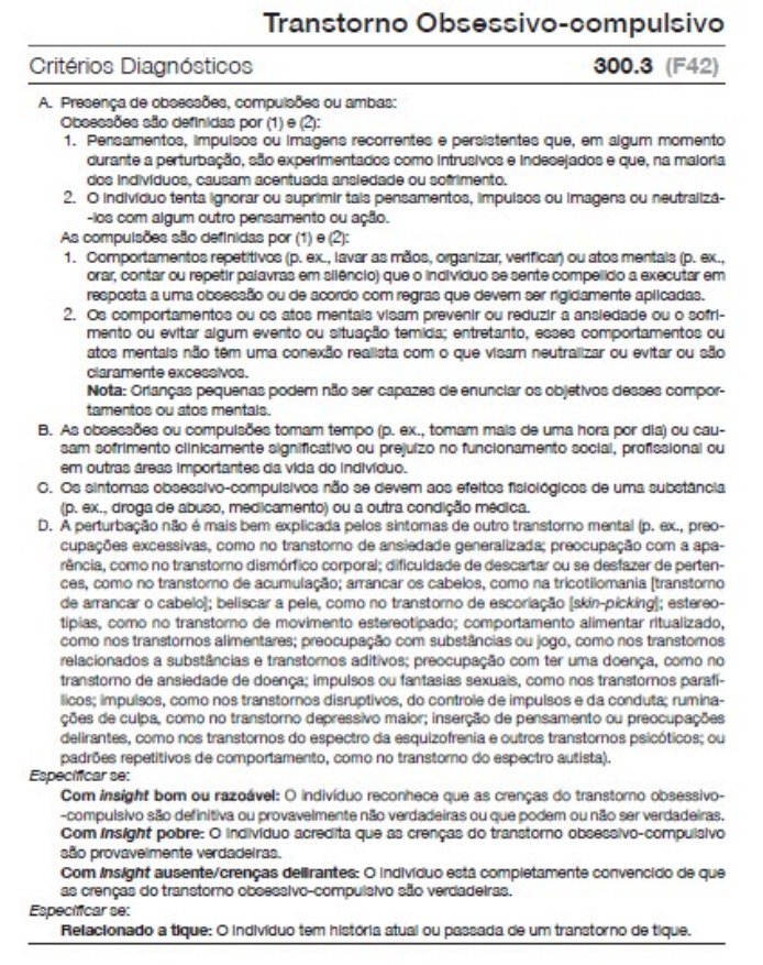 TOC O TOC é caracterizado pela presença de obsessões e/ou compulsões. Obsessões são pensamentos, impulsos ou imagens recorrentes e persistentes que são vivenciados como intrusivos e indesejados, enquanto compulsões são comportamentos repetitivos ou atos mentais que um indivíduo se sente compelido a executar em resposta a uma obsessão ou de acordo com regras que devem ser aplicadas rigidamente. Alguns outros transtornos obsessivo-compulsivos e transtornos relacionados também são caracterizados por preocupações e por comportamentos repetitivos ou atos mentais em resposta a preocupações. Outros transtornos obsessivo-compulsivos e transtornos relacionados são caracterizados principalmente por comportamentos repetitivos recorrentes focados no corpo (p. ex., arrancar os cabelos, beliscar a pele) e tentativas repetidas de reduzi-los ou pará-los. Os transtornos obsessivo-compulsivos e transtornos relacionados diferem das preocupações e rituais típicos das diferentes fases de desenvolvimento por serem excessivos e persistirem além dos períodos apropriados ao nível de desenvolvimento. A distinção entre a presença de sintomas subclínicos e um transtorno clínico requer a avaliação de inúmeros fatores, incluindo o nível de sofrimento do indivíduo e o prejuízo no funcionamento. Embora o conteúdo específico das obsessões e compulsões varie entre os indivíduos, certas dimensões dos sintomas são comuns no TOC, incluindo as de limpeza (obsessões por contaminação e compulsões por limpeza); simetria (obsessões por simetria e compulsões de repetição, organização e contagem); pensamentos proibidos ou tabus (p. ex., obsessões agressivas, sexuais e religiosas e compulsões relacionadas); e ferimentos (p. ex., medo de ferir a si mesmo ou aos outros e compulsões de verificação relacionadas). O especificador de TOC relacionado a tique é usado quando um indivíduo tem um transtorno de tique atual ou uma história passada. Muitos indivíduos com TOC têm crenças disfuncionais. Essas crenças podem incluir senso aumentado de responsabilidade e tendência a superestimar a ameaça; perfeccionismo e intolerância à incerteza; e importância excessiva dos pensamentos (p. ex., acreditar que ter um pensamento proibido é tão ruim quanto executá-lo) e necessidade de controlá-los. Os indivíduos com TOC variam no grau de insight que têm quanto à exatidão das crenças subjacentes aos seus sintomas obsessivo-compulsivos. Muitos têm insight bom ou razoável (p. ex., o indivíduo acredita que a casa definitivamente não irá, provavelmente não irá ou pode ou não incendiar se o fogão não for verificado 30 vezes). Alguns têm insight pobre (p. ex., o indivíduo acredita que a casa provavelmente irá incendiar se o fogão não for verificado 30 vezes), e poucos (menos de 4%) têm insight ausente/crenças delirantes (p. ex., o indivíduo está convencido de que a casa irá incendiar se o fogão não for verificado 30 vezes). O insight pode variar em um indivíduo durante o curso da doença. O insight mais pobre foi vinculado a pior evolução no longo prazo. Até 30% dos indivíduos com TOC têm um transtorno de tique ao longo da vida. Isso é mais comum no sexo masculino com início do TOC na infância. Esses indivíduos tendem a diferir daqueles sem história de transtornos de tique nos temas dos seus sintomas obsessivo-compulsivos, comorbidade, curso e padrão de transmissão familiar. • Caracteristicas O sintoma característico do TOC é a presença de obsessões e compulsões (Critério A). Obsessões são pensamentos repetitivos e persistentes (p. ex., de contaminação), imagens (p. ex., de cenas violentas ou horrorizantes) ou impulsos (p. ex., apunhalar alguém). É importante observar que as obsessões não são prazerosas ou experimentadas como voluntárias: são intrusivas e indesejadas e causam acentuado sofrimento ou ansiedade na maioria das pessoas. O indivíduo tenta ignorá- -las ou suprimi-las (p. ex., evitando os desencadeantes ou usando a supressão do pensamento) ou neutralizá-las com outro pensamento ou ação (p. ex., executando uma compulsão). Compulsões (ou rituais) são comportamentos repetitivos (p. ex., lavar, verificar) ou atos mentais (p. ex., contar, repetir palavras em silêncio) que o indivíduo se sente compelido a executar em resposta a uma obsessão ou de acordo com regras que devem ser aplicadas rigidamente. A maioria das pessoas com TOC tem obsessões e compulsões. As compulsões são geralmente executadas em resposta a uma obsessão (p. ex., pensamentos de contaminação levando a rituais de lavagem ou pensamentos de que alguma coisa está incorreta levando à repetição de rituais até parecer “direita” [just right)]. O objetivo é reduzir o sofrimento desencadeado pelas obsessões ou evitar um evento temido (p. ex., ficar doente). Contudo, essas compulsões não estão conectadas de forma realista ao evento temido (p. ex., organizar itens simetricamente para evitar danos a uma pessoa amada) ou são claramente excessivas (p. ex., tomar banho durante horas todos os dias). As compulsões não são executadas por prazer, embora alguns indivíduos experimentem alívio da ansiedade ou sofrimento. O Critério B enfatiza que as obsessões e compulsões devem tomar tempo (p. ex., mais de uma hora por dia) ou causar sofrimento ou prejuízo clinicamente significativos para justificar um diagnóstico de TOC. Esse critério ajuda a distinguir o transtorno dos pensamentos intrusivos ocasionais ou comportamentos repetitivos que são comuns na população em geral (p. ex., verificar duas vezes se a porta está trancada). A frequência e a gravidade das obsessões e compulsões variam entre os indivíduos com TOC (p. ex., alguns têm sintomas leves a moderados, passando 1 a 3 horas por dia com obsessões ou executando compulsões, enquanto outros têm pensamentos intrusivos ou compulsões quase constantes que podem ser incapacit