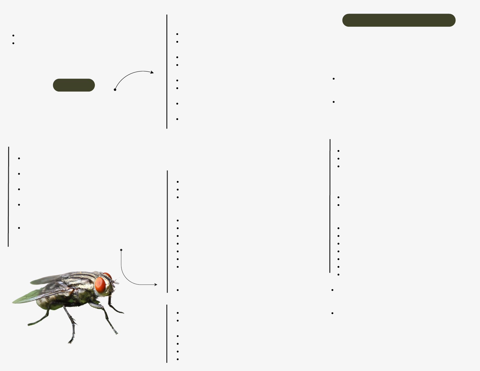 Biontófaga: aparece no tecido vivo normal Necrobiontófaga: aparece no tecido necrosado Ovovivíparas: embrião se desenvolve dentro do ovo e permanece dentro do corpo da mãe Hematófaga: se alimenta de sangue Fêmea coloca cerca de 600 ovos por vez Eclosão da larva - empulpa (cria casca) - emerge mosca - 3 a 10 dias vira adulto ciclo de vida: +/- 19 dias lugares quentes reduz para 9 dias (acelera produção) se alimentam de água e carboidrato controle populacional - impossível erradiar larva não se desenvolve no esterco seco - precisa estar úmido controle biológico: aumento da população de inimigos naturais Mosca doméstica: não gera miíase em vertebrados limpeza é muito importante - pode fazer climatização pra diminuir temperatura ou uso de telas Dípteros causadores de Miíase não coloca ovo no animal usa vetor - hospedeiro forético coloca ovos no hospedeiro hematófago e quando esse hospedeiro pousa no animal devido a temperatura da pele a larva cai (ovo contínua no inseto) biontófaga - pele íntegra tratamento é importante: colocar algo pra fechar o local nas fossas nasais se alimenta de muco Cresce e fica escura empulpa no solo é ovovivípara - ovo eclode dentro dela parasitismo benigno larva pode ir para SNC, pulmão tratamento com ivermectina Dermatobia Hominis: berne Oestrus Ovis: acomete ovinos Cochliomyia Hominovorax - precisa de lesão pra entrar (sempre primário - biontófaga) Cochliomyia macellaria - secundária (miíase) tecido necrosado Miíase: infestação de órgãos e tecidos de animais hospedeiros (vivos ou necrosados) na derme, subdérme, olho, intestino, urogenital e naso-faríngea Tabanomorpha - Tabanidae (mutucas) Muscomrpha: Lambedoura: doméstica (sinantrópica) Mordedora: Mosca de estábulo e de chifre (simbovinas) Dípteros: sem asa (artrópodes) Crachycera (mosca) 1. 2. Mayara Carolina | Medicina Veterinária primária: se desenvolve no tecido vivo e não sobrevive fora do hospedeiro (biontófaga) obrigatórias secundária: necrobiontófagas (tecido morto) facultativas Classificações: dípteros | Moscas comum em equino e bovinos desenvolve a larva em matéria orgânica fêmea coloca 20 ovos por vez - eclode larva - 8 a 10 dias empulpa - 2 a 8 dias adultos ciclo de 10 a 18 dias - 3 a 4 semanas picada é dolorosa - pica várias vezes sugam sangue de 3 a 4 minutos se alimentam e saem do hospedeiro geralmente vão para o estábulo causa estresse animal hospedeiro intermediário: nematódeo Habronema Microstoma - habronemose gástrica pode transmitir AIE e Tripanossoma evansi Stomoxys Calcitrans: mosca de estábulo comum em bovinos ficam no dorso do animal - no calor desce para o ventre 3 estágios de larva e pulpa se alimenta e fica no hospedeiro ovos morrem naturalmente no bolo fecal inseticida para controle Haematobia Irritans: mosca de chifre lesões furunculares: forma cisto traumatismo: lesão aberta Hominovorax - tira elas vivas e depois medica, cura por 2ª intenção Conceitos a maioria das fêmeas apresentam aparelho bucal lambedor e sugador ciclo: holometabólico - ovo - larva - pupa - adultos em climas quentes ciclo dura em torno de 4 meses ovos: são postos em ambiente aquático como úmido (mas não diretamente na água) período pupal é curto (1 a 3 semanas) - são parecidas com a crisálida (pupário) das borboletas Tabanidae: Mutucas - moscas do cavalo
