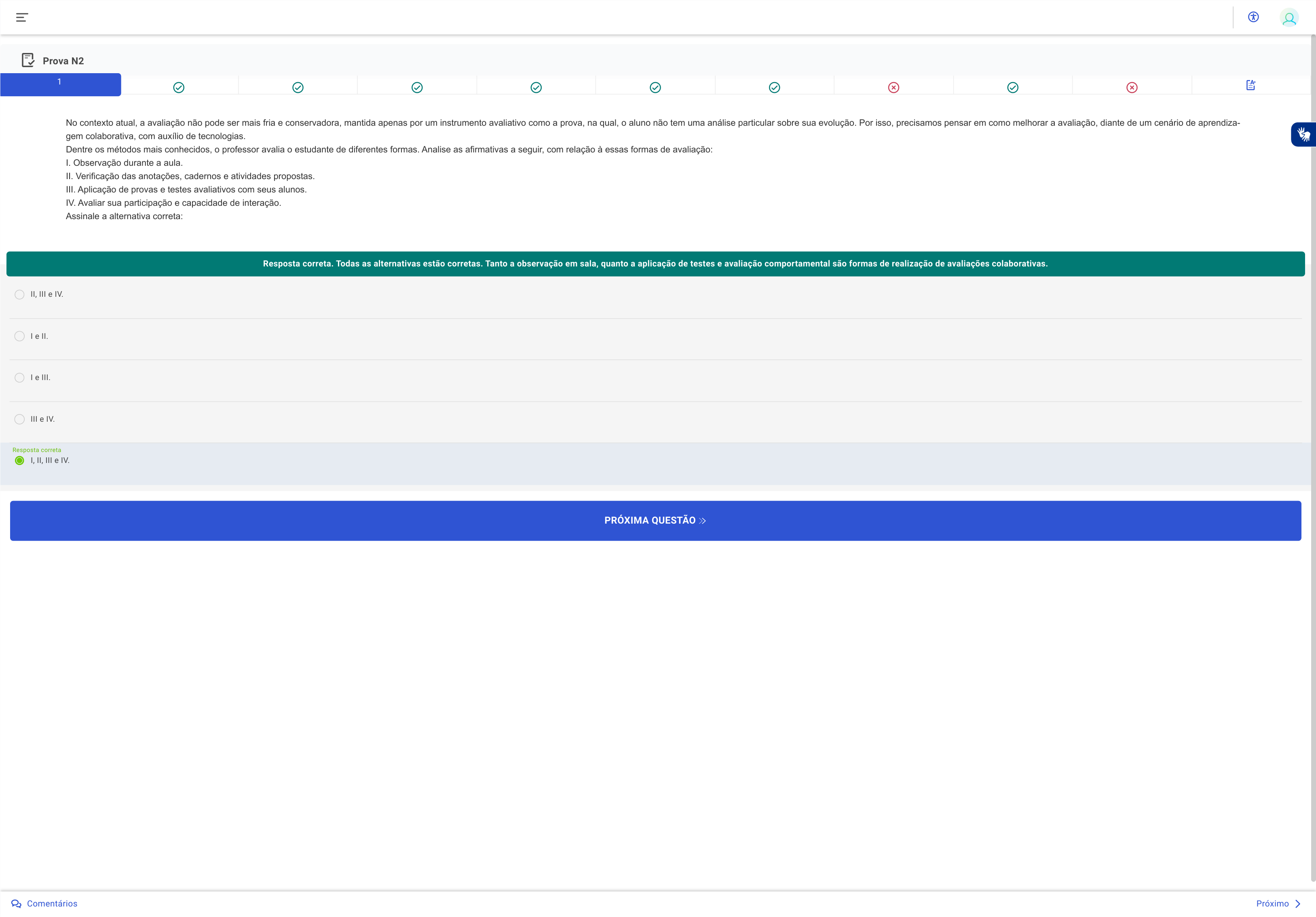 Prova N2 No contexto atual, a avaliação não pode ser mais fria e conservadora, mantida apenas por um instrumento avaliativo como a prova, na qual, o aluno não tem uma análise particular sobre sua evolução. Por isso, precisamos pensar em como melhorar a avaliação, diante de um cenário de aprendiza- gem colaborativa, com auxílio de tecnologias. Dentre os métodos mais conhecidos, o professor avalia o estudante de diferentes formas. Analise as afirmativas a seguir, com relação à essas formas de avaliação: I. Observação durante a aula. II. Verificação das anotações, cadernos e atividades propostas. III. Aplicação de provas e testes avaliativos com seus alunos. IV. Avaliar sua participação e capacidade de interação. Assinale a alternativa correta: Resposta correta. Todas as alternativas estão corretas. Tanto a observação em sala, quanto a aplicação de testes e avaliação comportamental são formas de realização de avaliações colaborativas. II, III e IV. I e II. I e III. III e IV. I, II, III e IV. Resposta correta PRÓXIMA QUESTÃO Próximo 1 Comentários Prova N2 Segundo Nogueira, “se pretendermos que os alunos continuem sendo eternos aprendizes, precisamos instrumentalizá-los com procedimentos que os coloquem à prova e desenvolvam suas capacidades, e os projetos parecem também ser meios para isso”. Fonte: NOGUEIRA, N. R . Pedagogia dos projetos: etapas, papéis e atores.4 ed. São Paulo: Érica, 2008. Porém, a característica mais importante de um projeto de trabalho é: Resposta correta. Autonomia é a característica mais importante, quando o projeto surge dentro de uma necessidade da sala de aula, a qualidade do projeto, com certeza será superior e obterá maiores resultados. Discernimento. Autonomia. Resposta correta Planejamento. Socialização. Interação. PRÓXIMA QUESTÃO Próximo 2 Comentários Prova N2 A autoavaliação não pode caminhar sozinha, ela deve ter uma relação com a escola, comunidade, alunos e sociedade. Educadores sugerem que essa autoavaliação deve ser feita por área. Para se auto avaliar, o docente deve questionar-se sobre: I. O planejamento das atividades. II. A organização dos materiais em sala de aula. III. Como é a postura em sala de aula e o relacionamento com os colegas de trabalho. IV. Como aplicar a criatividade. Assinale a alternativa correta: Resposta correta. Todas as alternativas estão corretas, pois, para se auto avaliar, o docente precisa se questionar sobre todas essas opções, isto é, observar com cautela o planejamento das atividades; priorizar a organização dos recursos materiais a serem utilizados em sala de aula; avaliar sua postura diante dos acontecimentos, bem como as relações profissionais e a utilização de criatividade e inovação na abordagem com os estudantes. I e II. I, II e III. I e IV. I, II, III e IV. Resposta correta III e IV. PRÓXIMA QUESTÃO Próximo 3 Comentários Prova N2 O trabalho coletivo e integrado entre as disciplinas e áreas do conhecimento, auxiliam na execução e montagem de materiais, considerando a sala de aula como um espaço de construção do saber científico e, portanto, um campo de atividades a serem desenvolvidas que favorecem a emancipação dos sujeitos. LIBÂNEO, J. C. Didática. São Paulo: Cortez Editora, 2011. Segundo Libâneo, existe um método que é peça-chave para se colocar em prática todos os conhecimentos, pois na integração entre as disciplinas, o currículo escolar se torna mais dinâmico e capaz de proporcionar, ao aluno, um conhecimento abrangente e holístico, que é o método de: Resposta correta. Interdisciplinaridade. Conforme material referencial, a interdisciplinaridade é um método peça chave para colocar em prática os conhecimentos, promovendo a interação, onde há construção do saber neste espaço de sala de aula, onde se estabelece as relações entre si. Multidisciplinaridade. Contextualização. Metodologias ativas. Pedagógico. Interdisciplinaridade. Resposta correta PRÓXIMA QUESTÃO Próximo 4 Comentários Prova N2 Existem ferramentas de armazenamento de informações amplamente usadas na educação, principalmente, em atividades que possam ser trabalhadas na educação à distância com os estudantes, tanto na escrita colaborativa, quanto no armazenamento de trabalhos dos grupos. Dentre as mais conhecidas, estão: Resposta correta. Google Drive, One Drive e Dropbox. Essas são as ferramentas mais utilizadas e conhecidas na educação. OneDrive, Youtube e Google Fotos. Google Analytics e Youtube. Google Drive, OneDrive e Dropbox. Resposta correta Google fotos, Google Drive e Office. Azure, Office e Dropbox. PRÓXIMA QUESTÃO Próximo 5 Comentários Prova N2 Apesar do enorme potencial do Google Docs para aprendizagem, ele não pode ser utilizado de forma mecânica, sem mediação pedagógica e objetivo bem definido. Seu propósito deve estar voltado para a construção do conhecimento, que reside no papel ativo de seus participantes para o desen- volvimento de atividades colaborativas, por meio do diálogo e do estabelecimento de conexões para a criatividade e a inovação. Sobre o Google docs, assinale a alternativa correta: I. É um serviço que funciona online e possui um pacote de aplicativos de propriedade da empresa Microsoft. II. É uma das mais conhecidas ferramentas de compartilhamento gratuita e online. III. Para utilizá-la é necessário apenas possuir uma conta no Gmail e os documentos criados no Google Docs ficam online. IV. Os arquivos armazenados nesta plataforma podem ser compartilhados com outros usuários. Resposta correta. II, III e IV são alternativas corretas e que correspondem aos serviços da plataforma Google docs. I, II e III. I, II e IV. I e IV. II e IV. II, III e IV. Resposta correta PRÓXIMA QUESTÃO Próximo 6 Comentários Prova N2 Qual o termo criado por Pierre Lévy que se caracteriza como “uma inteligência distribuída por toda parte, incessantemente valorizada, coor