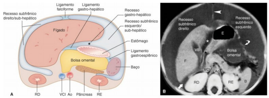 radiologia do abdome A radiografia convencional do abdome ainda é crucial para a avaliação do abdome agudo. TC, US e RM possibilitam realizar uma avaliação abrangente do abdome, incluindo a cavidade peritoneal, compartimentos do retroperitônio, órgãos abdominais e pélvicos, vasos sanguíneos e linfonodos. · Líquido na cavidade abdominal · Aumento difuso da densidade do abdome (abdome cinzento) · Margens indistintas do fígado, do baço e do músculo psoas · Deslocamento medial das alças colônicas com gás, do fígado e do baço, afastando-se da faixa do flanco properitoneal · Abaulamento dos flancos · Aumento da separação das alças do intestino delgado cheias de gás · Aspecto de “orelhas de cão”, com densidades simétricas na pelve devido ao líquido que extravasa do fundo de saco de cada lado da bexiga. · Pneumoperitônio Ar livre na cavidade peritoneal é um sinal importante de perfuração intestinal, mais comumente causada por perfuração de úlcera gástrica ou duodenal. No entanto, existem outras causas de pneumoperitônio, como traumatismo, cirurgia recente ou laparoscopia e infecção da cavidade peritoneal por microrganismos produtores de gás. · Gás nos dois lados da parede do intestino (sinal de Rigler) · Gás delineando o ligamento falciforme · Gás delineando a cavidade peritoneal (“sinal da bola de futebol americano”) · Gás extraluminal localizado, de aspecto triangular ou linear no quadrante superior direito do abdome. · Calcificações abdominais Calcificações intra-abdominais podem ser um importante sinal de doença intra-abdominal e devem ser procuradas em cada exame de imagem do abdome. TC e US são mais sensíveis à detecção de calcificação do que as radiografias convencionais. No entanto, a elevada resolução espacial da radiografia convencional geralmente proporciona resultados característicos que possibilitam um diagnóstico específico da natureza da calcificação. · Vasculares São comuns na aorta e nos vasos ilíacos de indivíduos mais velhos. Calcificações vasculares em forma de placas sobrepostas à coluna lombar e sacral requerem inspeção detalhada para que sejam detectadas. Aneurismas calcificados em forma de anel envolvem com mais frequência artérias esplênicas ou renais. Flebólitos são trombos calcificados em veias, mais comumente visualizados nas porções laterais da pelve. São calcificações arredondadas ou ovais de até 5 mm, que normalmente apresentam hipotransparência central. Podem ser confundidos com cálculos do sistema urinário. · Biliares Apenas 15% dos cálculos biliares contêm cálcio suficiente para serem identificados em radiografia convencional. A maioria dos cálculos biliares calcificados contém bilirrubinato de cálcio e tem aspecto laminado com borda exterior densa e centro radiotransparente. · Urinários Aproximadamente 85% dos cálculos urinários são visíveis nas radiografias convencionais. O tamanho deles varia de pequenos pontos até vários centímetros. O aspecto mais característico é coraliforme, ou seja, tem o formato do sistema de coleta renal. · Abdome agudo A avaliação do abdome agudo inclui geralmente a “rotina de abdome agudo”, que consiste em uma radiografia de tórax posteroanterior com o paciente em posição ortostática ou em decúbito dorsal ou uma radiografia do abdome com o paciente em decúbito e em posição ortostática ou sentada. A radiografia de tórax propicia a detecção ótima do pneumoperitônio e de doenças intratorácicas que podem apresentar-se com queixas abdominais. · Padrão normal dos gases abdominais A interpretação de radiografias convencionais do abdome rotineiramente inclui a avaliação da densidade de gases, líquidos, tecidos moles, tecido adiposo e cálcio. Gás normal no abdome predominantemente resulta da deglutição de ar. Níveis hidroaéreos são observados em pacientes normais, geralmente no estômago, muitas vezes, no intestino delgado, mas nunca no cólon distal à flexão hepática. Níveis hidroaéreos normais no intestino delgado não devem exceder os 2,5 cm de comprimento. Em indivíduos adultos, geralmente pode ser estabelecida a distinção entre dilatação do intestino delgado ou do intestino grosso pela avaliação da localização e das características anatômicas. A localização do intestino delgado é mais central no abdome e é caracterizada por válvulas Tabela25.2 coniventes, que atravessam a totalidade do diâmetro do lúmen. A distensão do intestino delgado raramente é superior a 5 cm de diâmetro, enquanto o intestino grosso não é considerado dilatado até exceder 5 cm de diâmetro. A localização do intestino grosso é periférica no abdome e é caracterizada por haustrações que se estendem parcialmente através do lúmen. O intestino grosso contém material fecal que apresenta aspecto mosqueado característico. O ceco, porção do intestino grosso com maior diâmetro, sempre se dilata o máximo possível, independentemente do local da obstrução. · Íleo adinâmico Os termos íleo adinâmico, íleo paralítico e íleo não obstrutivo são utilizados indistintamente e referem-se à estase do conteúdo intestinal devido a diminuição ou ausência de peristaltismo. Íleo adinâmico tipicamente mostra distensão intestinal simétrica, difusa e predominantemente gasosa. O intestino delgado, o estômago e o cólon mostram-se proporcionalmente dilatados, sem uma transição abrupta. Observa-se o comprometimento de um número maior de alças intestinais do que na obstrução. Ocasionalmente, o íleo adinâmico resulta na ausência de gás no abdome, com as alças dilatadas do intestino preenchidas apenas com líquido. · Alça sentinela Refere-se a um segmento do intestino que fica paralisado e dilatado por se localizar próximo a um órgão intra-abdominal inflamado. Em essência, é um pequeno segmento de íleo adinâmico que aparece como uma alça isolada do intestino di