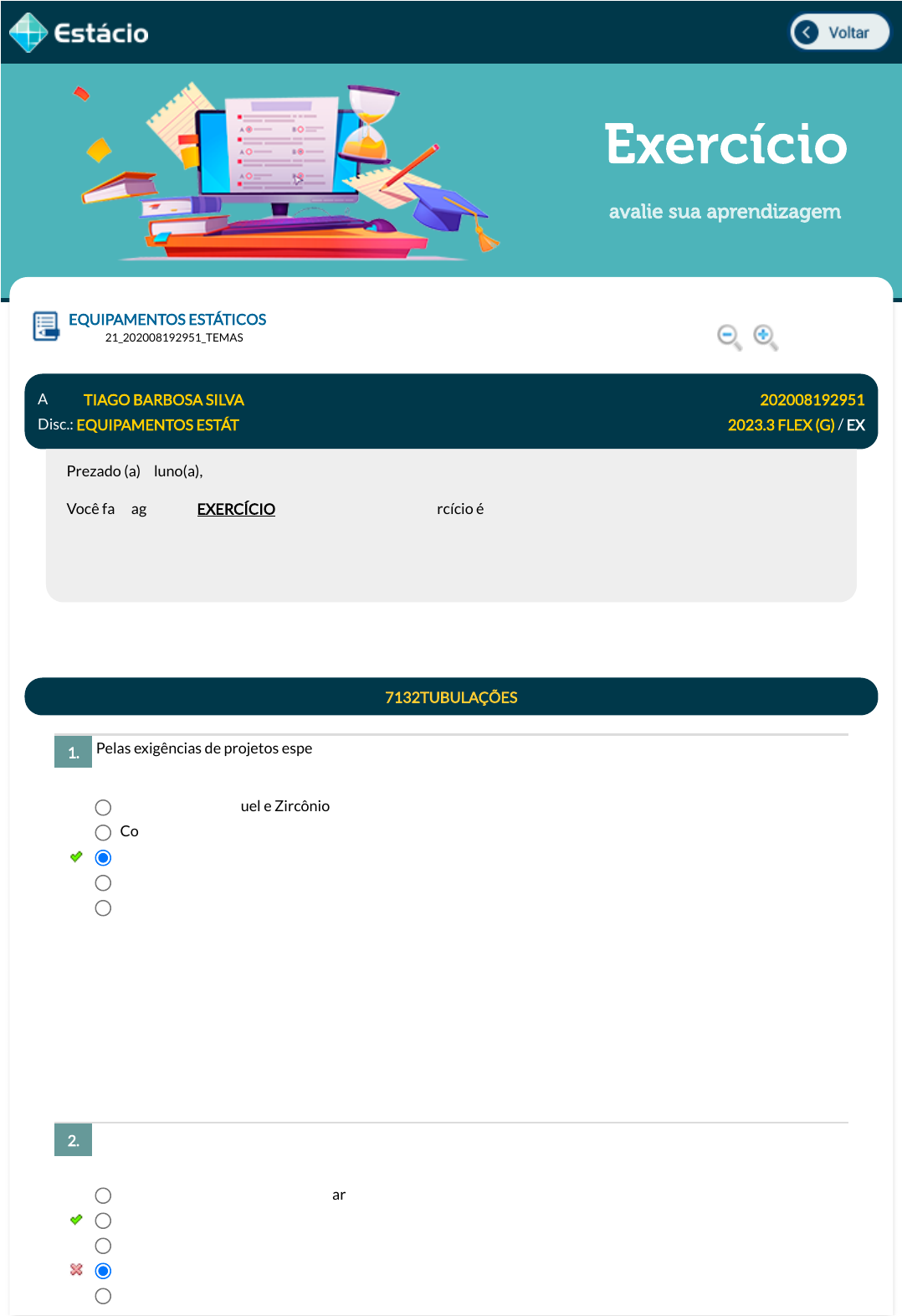 02/10/23, 11:26 Estácio: Alunos https://simulado.estacio.br/alunos/ 1/5 Exercício avalie sua aprendizagem Pelas exigências de projetos especiais e pelas limitações que se impõe ao aço carbono, foram criados os chamados aços-liga, compostos por outros materiais que não apenas os do aço carbono. Os aços-liga podem ser: As propriedades do aço usado em tubulação são fortemente in�uenciadas pela composição química e pela temperatura de trabalho. Em uma destas composições, chega-se ao Aço Carbono Acalmado que consiste em: EQUIPAMENTOS ESTÁTICOS Lupa DGT1121_202008192951_TEMAS Aluno: TIAGO BARBOSA SILVA Matr.: 202008192951 Disc.: EQUIPAMENTOS ESTÁT 2023.3 FLEX (G) / EX Prezado (a) Aluno(a), Você fará agora seu EXERCÍCIO! Lembre-se que este exercício é opcional, mas não valerá ponto para sua avaliação. O mesmo será composto de questões de múltipla escolha. Após responde cada questão, você terá acesso ao gabarito comentado e/ou à explicação da mesma. Aproveite para se familiarizar com este modelo de questões que será usado na sua AV e AVS. 7132TUBULAÇÕES 1. Compostos de Níquel e Zircônio. Compostos de Zinco e Titânio. Compostos de Cromo (Cr), Molibdênio (Mo) e Níquel (Ni). Compostos de Titânio. Compostos de Zinco. Data Resp.: 02/10/2023 11:12:18 Explicação: Na seção 2.2, do módulo 2 (NC2), mostra-se a composição base dos aços-liga, sendo os compostos de liga o Cromo, o Molibdênio e o Níquel. 2. Reduzir a presença de carbono para suportar menores temperaturas. Adição de até 0,1% de sílica, para modi�car a estrutura cristalina do material. Reduzir a temperatura de trabalho para o material trabalhar com mais segurança. Adição de cromo para melhorar resistência mecânica. Adicionar molibdênio para melhorar a estrutura cristalina. javascript:voltar(); javascript:voltar(); javascript:voltar(); javascript:voltar(); javascript:diminui(); javascript:diminui(); javascript:aumenta(); javascript:aumenta(); 02/10/23, 11:26 Estácio: Alunos https://simulado.estacio.br/alunos/ 2/5 Os primeiros tubos metálicos forma feitos de chumbo, séculos antes da Era Cristã. Sabe-se que na classi�cação de tubos para tubulações, relativamente aos materiais usados, na classe dos tubos ferrosos encontram-se: Os tubos e as conexões são produtos muito comuns e populares em diversas áreas, como a industrial e residencial, por exemplo. Contudo, existe um outro item muito importante para os sistemas onde são inseridos: os �ltros para tubulação. Os �ltros para tubulação são produtos desenvolvidos para garantir mais e�ciência e qualidade, facilitando o transporte de �uidos. Sobre �ltros, assinale a alternativa correta Os �ltros provisórios são peças que se intercalam nas tubulações, próximo aos bocais de entrada dos equipamentos (bombas, compressores, turbinas etc.), para evitar que sujeiras e corpos estranhos deixados nas tubulações durante a montagem, penetrem nesses equipamentos quando o sistema for posto em funcionamento. Sobre �ltros provisórios, assinale a alternativa correta Data Resp.: 02/10/2023 11:13:52 Explicação: Na seção 2.1, do módulo 2 (NC2), de�ne-se como "aço carbono acalmado", aquele com adição de até 0,1% de sílica e com isto modi�ca-se a estrutura cristalina do material, permitindo seu uso em temperaturas acima de 400°C. 3. tubos de alumínio e níquel. tubos de aço carbono, tubos de aço inoxidável e tubos de ferro. tubos de latão e chumbo. tubos de cobre e cobre-níquel. tubos de titânio e zircônio. Data Resp.: 02/10/2023 11:14:58 Explicação: No núcleo conceitual 1 do Módulo 1, página 4, encontra-se essa classi�cação, de acordo com a ASTM. Segundo a ASTM, na classi�cação dos tubos ferrosos encontram-se os tubos de aço carbono, tubos de aço inoxidável e tubos de ferro. 7133VÁLVULAS, PURGADORES E FILTROS 4. Os �ltros para tubulações são componentes auxiliares utilizados de modo a auxiliar a assegurar o funcionamento correto do sistema Os �ltros para tubulações industriais, também conhecidos como �ltros tipo balde invertido, auxiliam na remoção de partículas que podem dani�car todo o sistema Filtros são em formato X para dividir o �uido em uma parte com impurezas e outra sem Os �ltros apresentam características autolimpantes, não necessitando de manutenção Filtros tem como objetivo auxiliar na inserção de partículas no sistema Data Resp.: 02/10/2023 11:16:21 Explicação: Filtros são separadores com o objetivo de reter poeiras, sólidos em suspensão e corpos estranhos no escoamento de �uidos. Os �ltros são dispositivos que prendem esses sólidos presentes nos líquidos ou gases que �uem e protegem os equipamentos de seus efeitos nocivos, reduzindo assim o tempo de inatividade e a manutenção. Os mesmos precisam ser removidos para limpeza e/ou substituição 5. 02/10/23, 11:26 Estácio: Alunos https://simulado.estacio.br/alunos/ 3/5 Um purgador de boia é caracterizado como um recipiente contendo uma boia. Assim, quando há condensado, a boia se eleva com o nível e permite a saída desse condensado que acaba sendo "empurrado" pela pressão do vapor. Sobe esse tipo de purgador podemos a�rmar que: Os vasos de pressão são recipientes hermeticamente fechados que podem conter gases ou líquidos sob pressăo. Consideremos um vaso de pressão cilíndrico com diâmetro interno de 100 cm e espessura de a . Apressăo interna máxima que o vaso podesuportar é de Pa. Determine a tensão circunferencial que atua na parte curva de um vaso de pressão cilíndrico, sabendo-se que a tensão máxima . Onde é a pressão em é o raio em metros e é a espessura em metros. Em �ltros provisórios o próprio �uido circulante faz o papel de limpeza e lavagem do purgador Os �ltros provisórios são retirados após um tempo de uso e são substituídos por �ltros permanentes Depois que as tubulações já estiverem em funcionamento normal 
