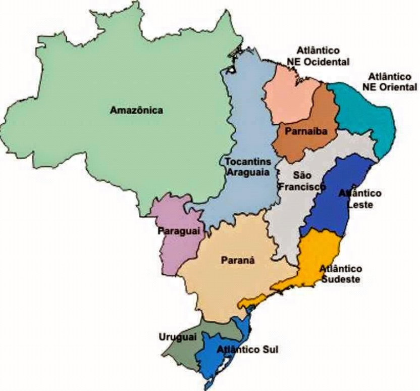 O Brasil possui cerca de 14% da água doce do mundo em seu território. Existem 12 Bacias hidrográficas distribuídas pelo país. Bacia Amazônica É a maior bacia hidrogáfica do planeta, possui uma área de drenagem de 5,8 milhões de Km², passando por 8 estados brasileiros. Ela também alimenta alguns países vizinhos como Peru, Bolívia, Colômbia, Equador e Guiana. Bacia do Tocantins-Araguaia É considerada a maior bacia hidrogáfica exclusivamnete brasileira, om uma área de 800 mil Km². Os dois rios que mais se destacam nessa bacia são o Rio Tocantins e o Rio Araguaia. Ela passa por 6 estados (Distrito Federal, Goiás, Maranhão, Mato grosso, Tocantins e Pará). Bacia São Francisco Seu principal Rio é o São francisco. É de extrema importância para a região Nordeste, pois durante o período de estiagem, alimenta vários açudes, contribuindo para a sobrevivência do sertanejo durante os períodos mais críticos. Alcança 5 estados (Alagoas, Bahia, Minas Gerais, Pernambuco e Sergipe). Bacia do Paraná Está presente no Brasil, Argentina, Paraguai e Uruguai, possui rios de planalto e encachoeirados, perfeito para instalação de Hidrelétricas. Esse potencial é aproveitado pelas usinas de Ilha Solteira, Itaipu, Capivari, Engenheiro Sérgio Mota, Água vermelha, etc. Possui o maior potencial hidrelétrico instalado no Brasil, merecendo destacar as grandes usinas, como a de Itaipu, Jupiá e Ilha Solteira, no rio Paraná; Ibitinga, Barra Bonita e Bariri no rio Tietê; Cachoeira Dourada, Itumbiara e São Simão, no rio Paranaíba; Furnas, Jaguara, Marimbondo e Itutinga, no rio Grande; e ainda Jurumirim, Xavantes e Capivara, no rio Paranapanema. Responsáveis por cerca de 61,7% do potencial hidrelétrico do país. Seus rios são tipicamente de planalto, o que dificulta muito a navegação, que se tornará mais fácil com a utilização das eclusas construídas com a instalação das usinas hidrelétrica Bacia do Paraguai A bacia hidrográfica do Paraguai é típica de planície, apresentando grandes extensões para navegação e escoamento de produção dos três países banhados por ela Brasil, Argentina e Paraguai. No Brasil, ela está presente nos estados de Mato Grosso e Mato Grosso do Sul, englobando uma área de 361.350 quilômetros quadrados. Tem como principal rio o Paraguai, que nasce na Chapada dos Parecis (MT). Bacia do Uruguai Essa bacia está presente nos estados do Rio Grande do Sul e Santa Catarina. O principal rio, o Uruguai, nasce da confluência dos rios Canoas e Pelotas. Suas características são propícias para a construção de usinas hidrelétricas, além de ter grande utilidade para agricultores brasileiros, uruguaios e argentinos. Bacia do Platina É o conjunto formado pelas bacias do Paraná, Paraguai e Uruguai. Esse conjunto pode ser uma das mais importantes para o país em termos econômicos, pois está situada em uma região que é considerada a mais rica do Brasil, além de abrigar a maior usina hidrelétrica do mundo (Itaipu), na fronteira com o Paraguai, no estado do Paraná. O Rio Paraná tem como afluentes principais o Rio Grande e o Rio Parnaíba, além de ser a fronteira natural com o Paraguai e a Argentina, na foz do Iguaçu. seu curso aprensenta vários desníveis e quedas d'água, o que torna a Bacia do Paraná essencialmente de planaltos. com isso, há um grande potencial hidrelétrico, o que favoreceu a implantação da Usina de Itaipu. Bacia do Parnaíba Essa bacia hidrográfica está presente nos estados do Piauí, Maranhão e na porção oeste do Ceará, Nordeste brasileiro. Os principais rios são o Rio das Balsas, Uruçuí-Preto, Gurgueia, Longá, Poti e Canindé. Sua localização faz com que seus rios sejam intermitentes. Bacia do Atlântico Nordeste Oriental Considerada pela ANA a bacia com a menor disponibilidade hídrica do país, está presente nos seguintes estados: Piauí, Ceará; Rio Grande do Norte; Paraíba; Pernambuco; Alagoas. Devido ao clima árido e semiárido, possui muitos rios intermitentes, destacando-se o Rio Jaguaribe, o maior rio intermitente do mundo." Bacia do Atlântico Nordeste Ocidental Com três biomas presentes em sua área – Cerrado, Caatinga e Amazônia –, essa bacia ocupa 3% do Brasil, no Maranhão e extremo leste do Pará. Os rios Itapicuru, Grajaú e Pindaré são os principais contribuintes dessa bacia. Bacia do Atlântico Leste Essa bacia é formada por rios que partem do Espírito Santo rumo ao Nordeste brasileiro. Entre as bacias hidrográficas brasileiras, ela possui a segunda menor reserva hídrica do país. Passa pelos estados de Minas Gerais, Espírito Santo, Bahia e Sergipe. Bacia do Atlântico Sudeste Uma das menores bacias em termos de área ocupada, com 2,5% do território nacional. Devido a sua localização, apresenta índices demográficos elevados, pois abriga os seguintes estados: Minas Gerais, Espírito santo, Rio de Janeiro, São Paulo e Paraná. Bacia do Atlântico Sul Essa bacia possui grande importância turística, passando pelso estados de São Paulo, Paraná, Santa Catarina e Rio Grande do Sul. Destaque para o Rio Guarnaíba, que abastece Porto Alegre eáreas adjacentes. Hidrelétricas no Brasil O Brasil possui um grande potencial de rios e as hidrelétricas são largamente utilizadas em nosso país. Sendo a principal fonte de energia (cerca de 64,9%). Possui pontos positivos como o fato de não poluir a atmosfera, mas também há pontos negativos como o problema ambiental envolvendo o represamento. As Principais são: Usina de Itaipu (segunda maior do mundo, localizada no Rio Paraná, Capacidade de 14000 MW, sendo apenas 50% do Brasil) Usina de Tucuruí (Localizada no rio Tocantins, capacidade de 8.340 MW) Usina de Ilha Solteira (Localizada no Rio Paraná, capacidade de 3.440 MW) Usina de Xingó (Localizada no Rio São Francisco, capacidade de 3.162 MW)