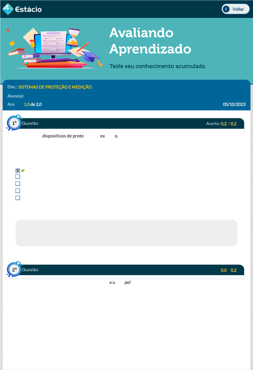 10/5/23, 4:59 PM Estácio: Alunos https://simulado.estacio.br/alunos/ 1/6 Avaliando Aprendizado Teste seu conhecimento acumulado Disc.: SISTEMAS DE PROTEÇÃO E MEDIÇÃO Aluno(a): Acertos: 1,0 de 2,0 05/10/2023 Acerto: 0,2 / 0,2 A função dos dispositivos de proteção, por exemplo, relés, é ordenar a imediata remoção de qualquer elemento de um sistema de potência quando ele sofrer um curto-circuito, ou quando operar em uma condição anormal comprometendo a operação efetiva do sistema elétrico. Os relés passaram por modernização e chegaram aos dispositivos conhecidos hoje por dispositivos inteligentes, ou digitais, que possuem multifuncionalidade e operam de acordo com a norma. De acordo com o exposto, veri�ca-se que: Permite a comunicação entre equipamentos, monitoramento e alivia na manutenção Os relés digitais não participam da proteção do sistema elétrico Os relés digitais apresentam em seu hardware apenas as funções de monitoramento Não existe um microprocessador incorporado na eletrônica relés digitais A interoperabilidade não é garantida Respondido em 05/10/2023 15:56:04 Explicação: Os equipamentos digitais vieram so�sticando o sistema de proteção, minimizando custos de manutenção, permitindo a comunicação entre equipamentos e melhorando a identi�cação das falhas e monitoramento das redes Acerto: 0,0 / 0,2 (FGV/2009 - Adaptada) A proteção desempenha um papel importante quanto à con�abilidade de um sistema elétrico. Com relação à proteção, considere as a�rmativas a seguir: I. A proteção de retaguarda é instalada para salvar o sistema no caso de falta da proteção primária. II. Na ocorrência de um curto-circuito, quando os tempos de chaveamento são levemente superiores aos tempos de extinção do curto pela proteção primária, pode-se a�rmar que existe falta de sincronismo. III. Na ocorrência de um curto-circuito, os tempos de chaveamento não dependem do tempo de extinção do curto. Está correto o que se a�rma em: Questão1 a Questão2 a https://simulado.estacio.br/alunos/inicio.asp https://simulado.estacio.br/alunos/inicio.asp javascript:voltar(); javascript:voltar(); 10/5/23, 4:59 PM Estácio: Alunos https://simulado.estacio.br/alunos/ 2/6 apenas III apenas II apenas I apenas I e II apenas II e III Respondido em 05/10/2023 15:55:46 Explicação: A proteção de retaguarda atua quando a proteção principal falha, porém essas proteções são proteções principais de outras regiões. Os tempos de chaveamento devem ser calculados de forma a atender os critérios de�nidos para extinção do defeito Acerto: 0,0 / 0,2 (Celesc/2011 - Adaptada) Os transformadores de corrente (TC) e transformadores de potencial (TP) desempenham um papel fundamental na proteção de sistemas elétricos de alta tensão. Eles são dispositivos projetados para fornecer medições precisas e seguras das correntes e tensões presentes em um sistema elétrico. Analise as a�rmativas abaixo sobre os transformadores TC e TP utilizados em proteção de sistemas elétricos de alta tensão. 1. O TC de proteção, devido à exigência de suportar curtos-circuitos de valor elevado, é também adequado para atender aos equipamentos de medições de faturamento. 2. Os TCs e TPs devem reproduzir em seus secundários as correntes e tensões que sejam uma réplica das mesmas grandezas do primário. 3. A classe de exatidão do TC está relacionada com o carregamento conectado no seu secundário. 4. Quando um TC está operando plenamente saturado, a corrente elétrica que sai em seu secundário está altamente contaminada por harmônicas e seu valor e�caz é muito baixo. 5. O fator de sobrecorrente de um TC está relacionado com a máxima corrente que pode passar em seu primário para que o grau de saturação do núcleo magnético ainda seja adequado para reproduzir corrente no secundário dentro de sua classe de exatidão especi�cada. Assinale a alternativa que indica todas as a�rmativas corretas. Apenas 2 e 4 Apenas 2 e 5 Apenas 2, 3, 4 e 5 1, 2, 3, 4 e 5 Apenas 1, 3 e 4 Respondido em 05/10/2023 15:56:45 Explicação: O item 1 está incorreto pois os transformadores de corrente para proteção possuem classe de exatidão diferente dos transformadores para medições e faturamentos, portanto, um TC de proteção não é adequado para medição Questão3 a 10/5/23, 4:59 PM Estácio: Alunos https://simulado.estacio.br/alunos/ 3/6 Acerto: 0,2 / 0,2 Em um sistema elétrico, os barramentos são utilizados para conectar pontos de alimentação e cargas. Por serem equipamentos constituídos basicamente de uma base de cobre ou alumínio, estão constantemente sujeitos à presença de altas correntes, sujeitos a falhas. A respeito das proteções utilizadas, marque a alternativa que corresponde à proteção de barramentos em sistemas elétricos de potência: Proteção de sobretensão. Proteção por relé buchholz. Proteção diferencial. Proteção de sobrecorrente. Proteção de frequência. Respondido em 05/10/2023 15:59:12 Explicação: Os esquemas de proteção de barramentos são semelhantes aos esquemas de proteção de transformadores e geradores. Portanto, das opções apresentadas, a proteção diferencial é a mais indicada para barramentos. Acerto: 0,2 / 0,2 (Adaptada - SELECON-2022) Existem no mercado diversos tipos de relés, que são classi�cados conforme sua funcionalidade e características operativas. O relé térmico é o responsável, tecnicamente, pela proteção contra a anomalia denominada: Tensão diferencial Sobrecarga Curto-circuito Corrente residual Tensão residual Respondido em 05/10/2023 16:19:56 Explicação: A função desse dispositivo é a atuação diante da sobrecarga dos equipamentos. Usualmente são aplicados na proteção de motores, geradores e transformadores Acerto: 0,0 / 0,2 (COVEST/2019 - Adaptada) Um sistema de proteção deve atender a requisitos que compõem sua �loso�a operativa como ser sel